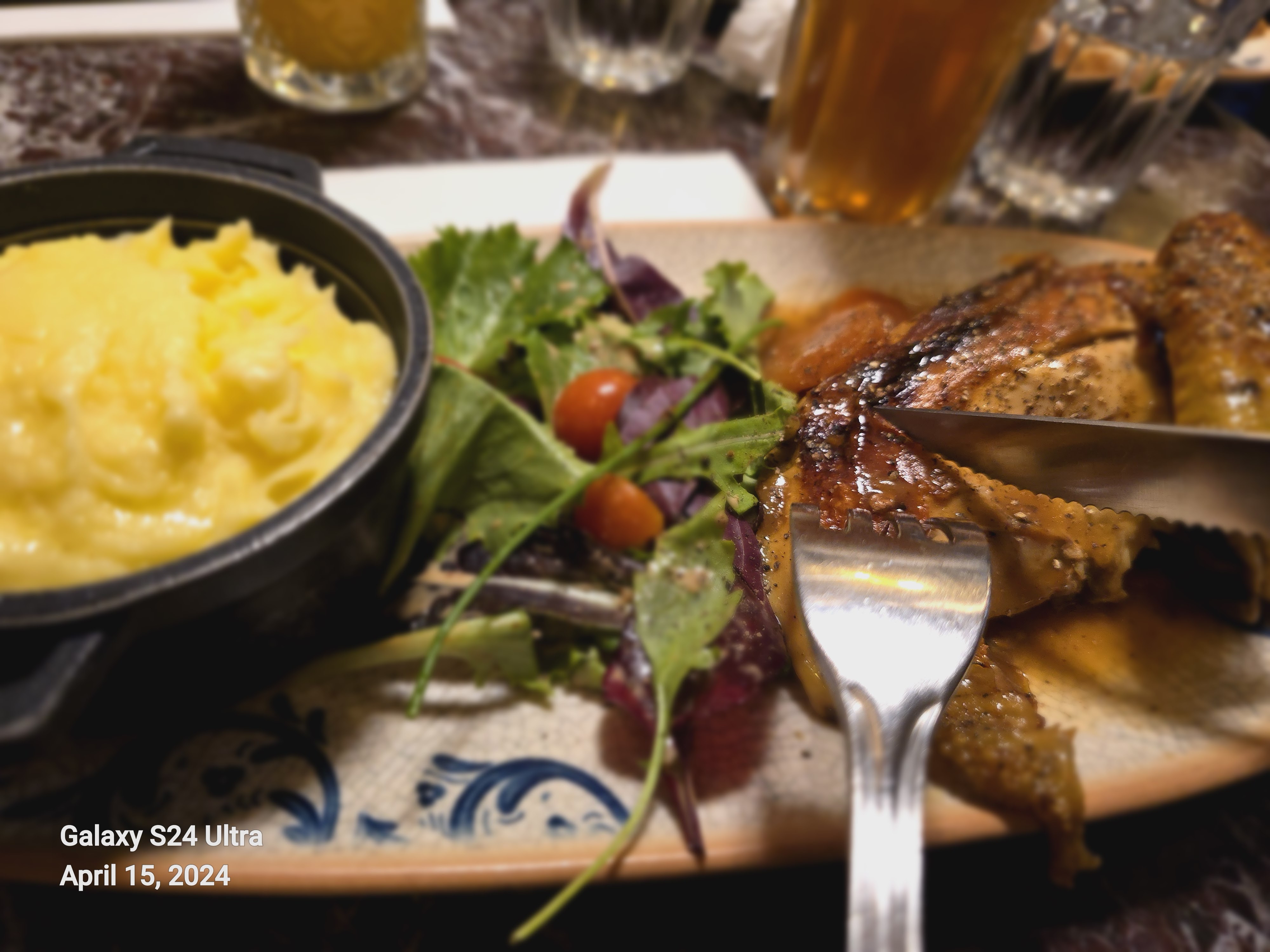 Nous avons mangé en extérieur. Le poulet cuit comme il faut avec un jus ayant du goût. Une super purée 👌 L'entrecôte était tendre à souhait. Seul bémol, la proximité de la table voisine.