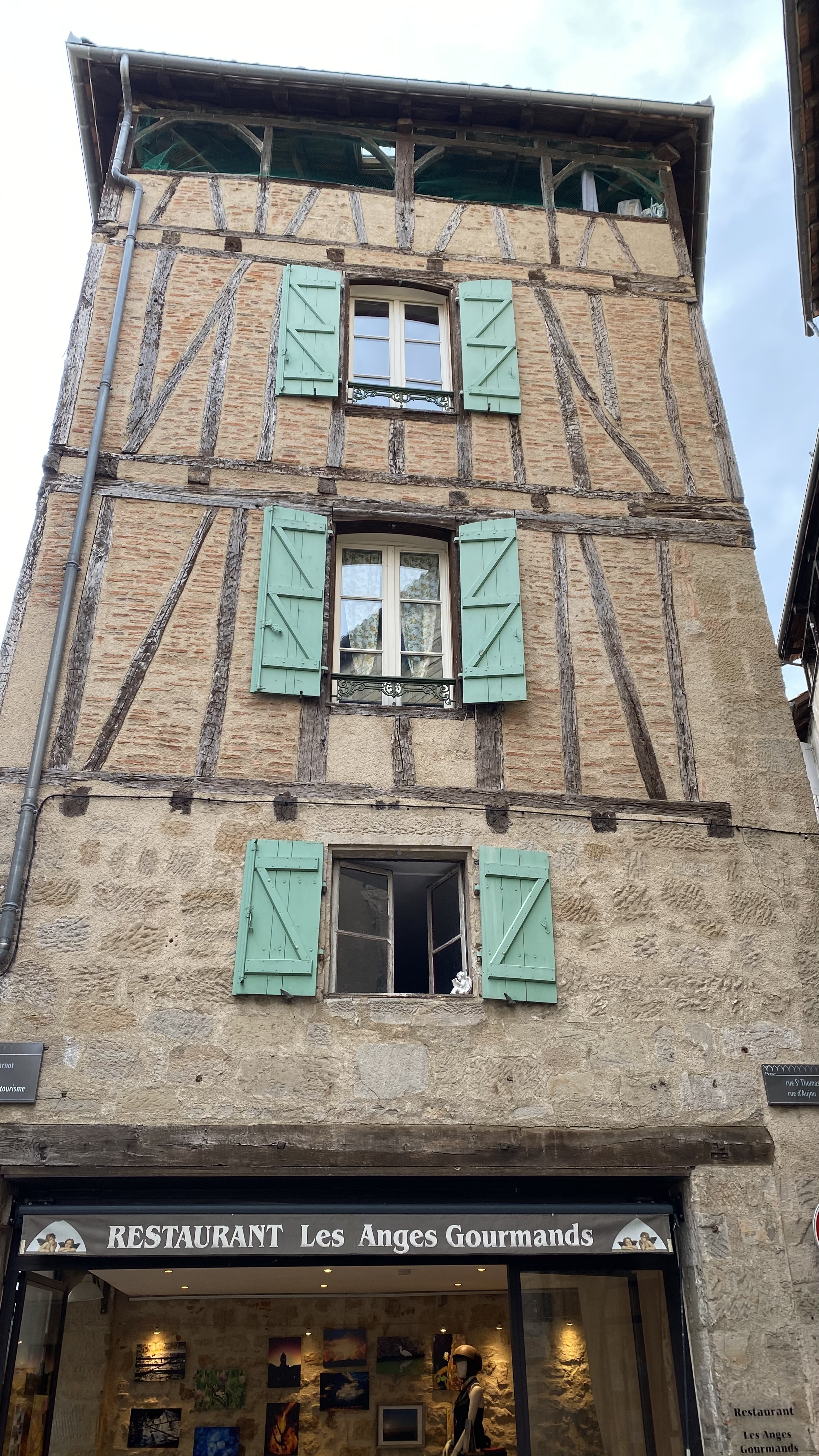 Ce soir là à Figeac, des artistes en habit de couleurs déambulent dans les rues. Une petite fête donc, chez les Anges Gourmands. Un clown sur son grand cycle et un air de petit cirque, qui ajoute de la joie, à l'aligot saucisse de canard servi avec sa sauce bière brune ! La faisselle au fruit rouge et citron vert arrive comme une cerise sur le gâteau du soir ! J'y reviendrai voir, me confie mon petit doigt, en se riant du temps qu'il fit en terrasse ! La joie des serveuses et le concerto en cuisine, laisseront un grand souvenir en forme de sourire.