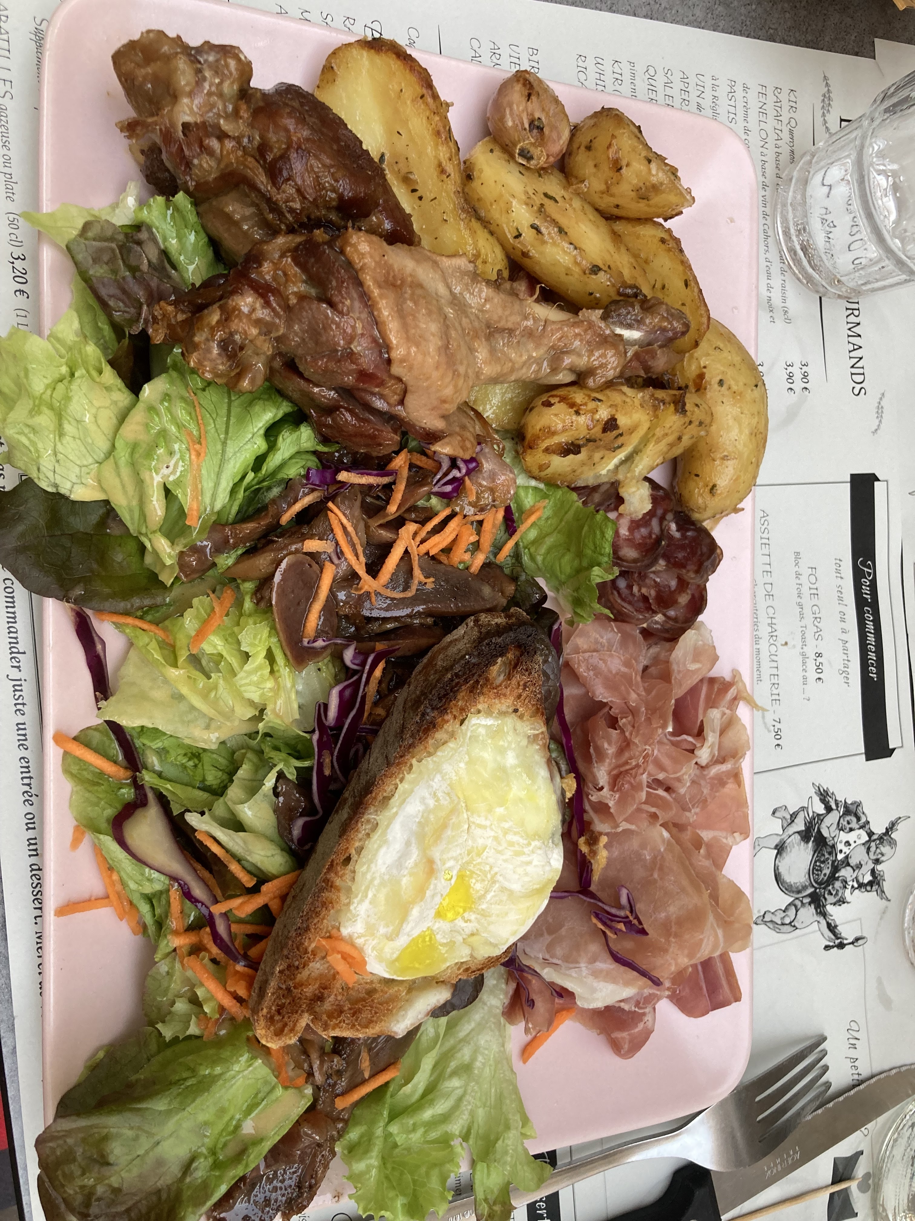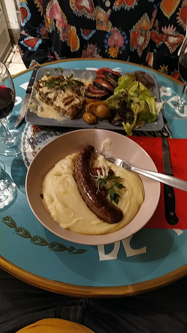Je m’attendais à beaucoup mieux mais c’est juste au dessus de la moyenne… une assiette de charcuterie très banale, des pommes de terre pas bien cuites, un Cahors bio mais très banal lui aussi, franchement pas digne de Figeac, de sa cuisine et de ses produits, désolé d’être aussi sévère, mais y’a des moments…..