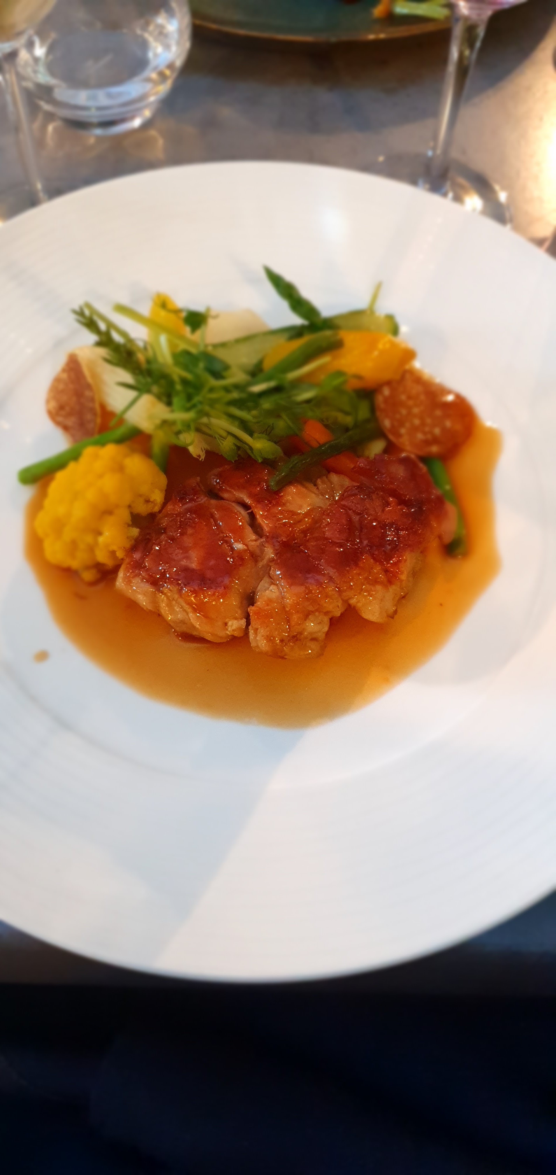 Cuisine créative à partir de bons produits. Au final, une véritable réussite dans l'assiette. Une assiette michelin qui mériterait au moins le bib gourmand. Bonne continuation à vous !