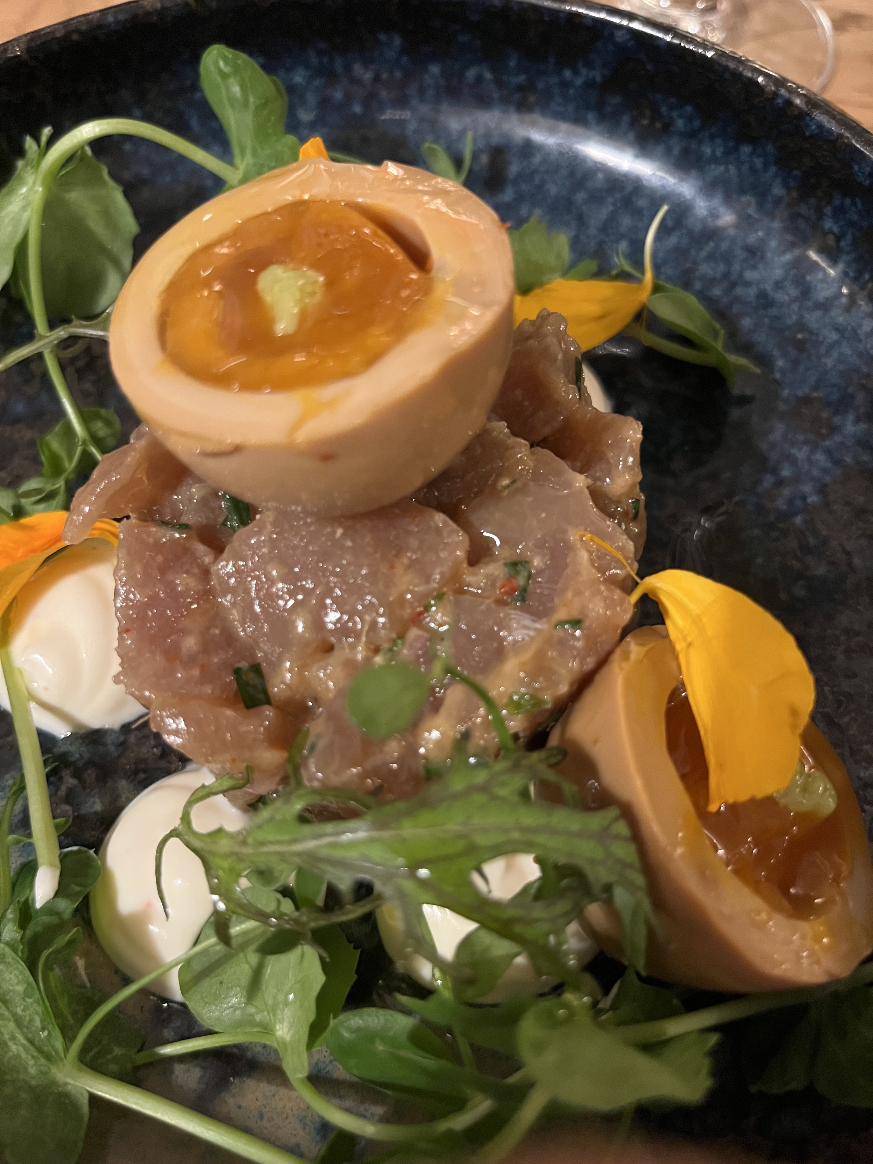Une bonne table et un service impeccable. Les plats proposés sont très bien réalisés, avec des cuissons parfaites et des sauces très goûteuses. Petit bémols sur le ceviche qui manquait un peu de peps (qui était plus un tartare en fait) , et sur le finger yuzu qui était un peu trop gros (balance crème fruit un peu trop crème). Le poulet vin jaune et le filet de bœuf étaient excellents, ainsi que le dessert à base de glace sesame aux figue qui vaut le détour. L’ensemble est globalement de très bonne tenue, nous avons passé un très bon moment, merci au chef et à l’équipe en salle.