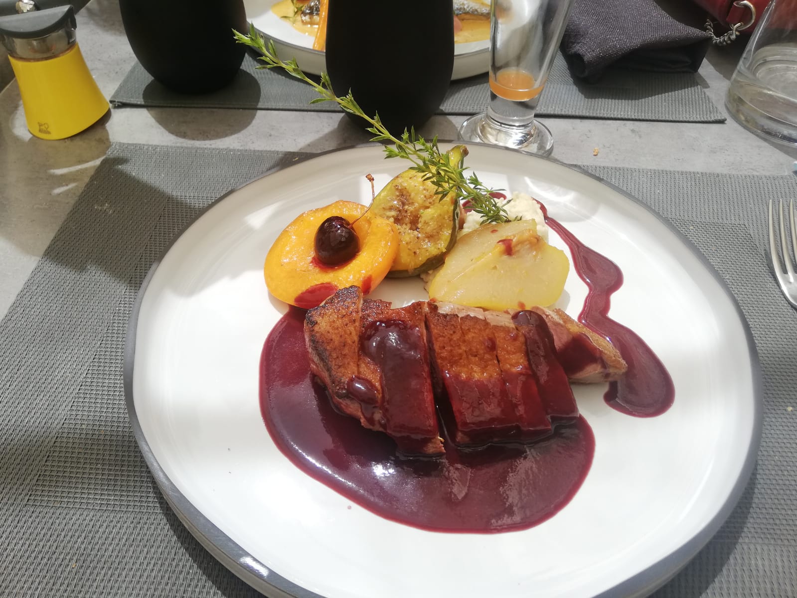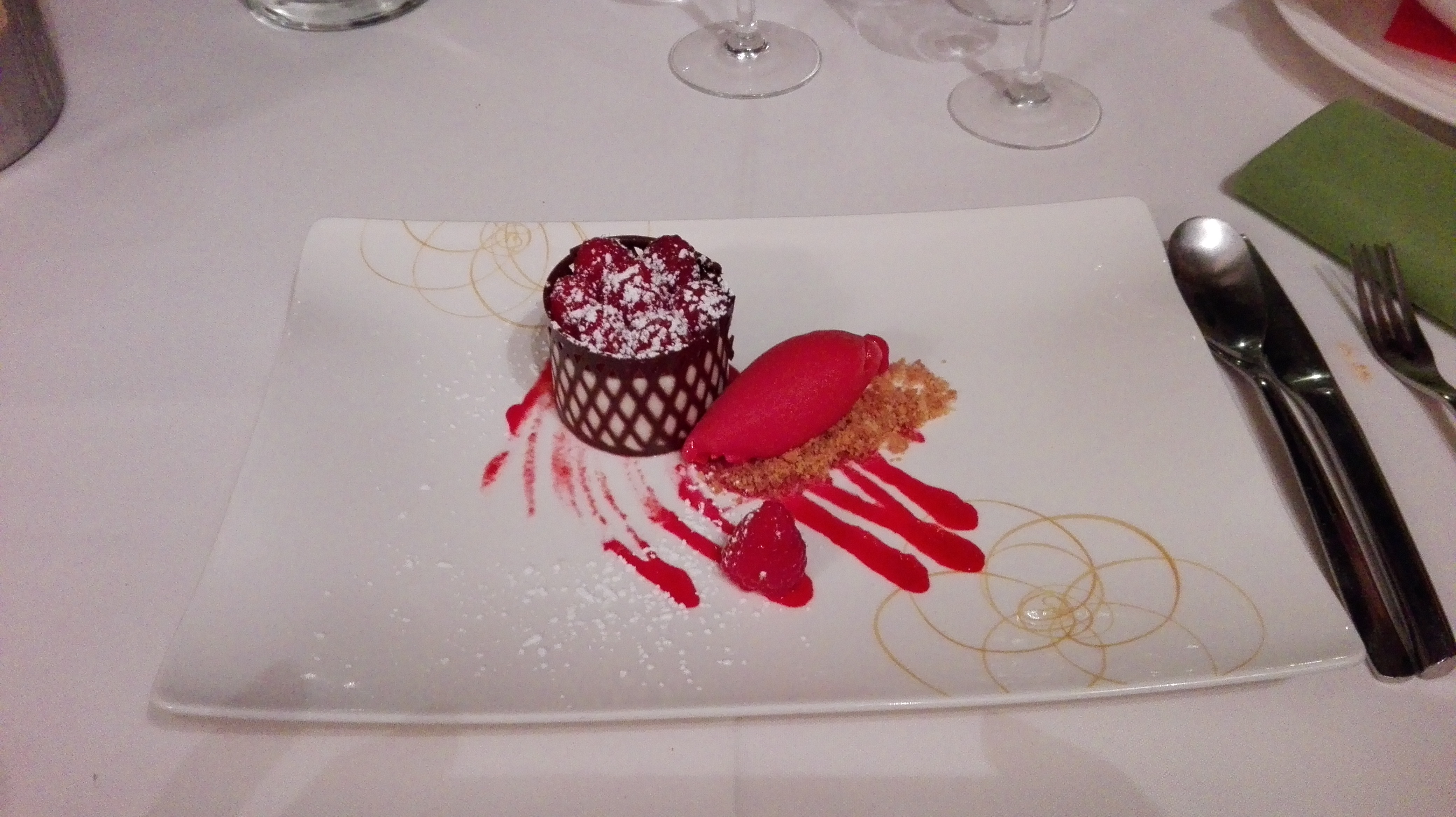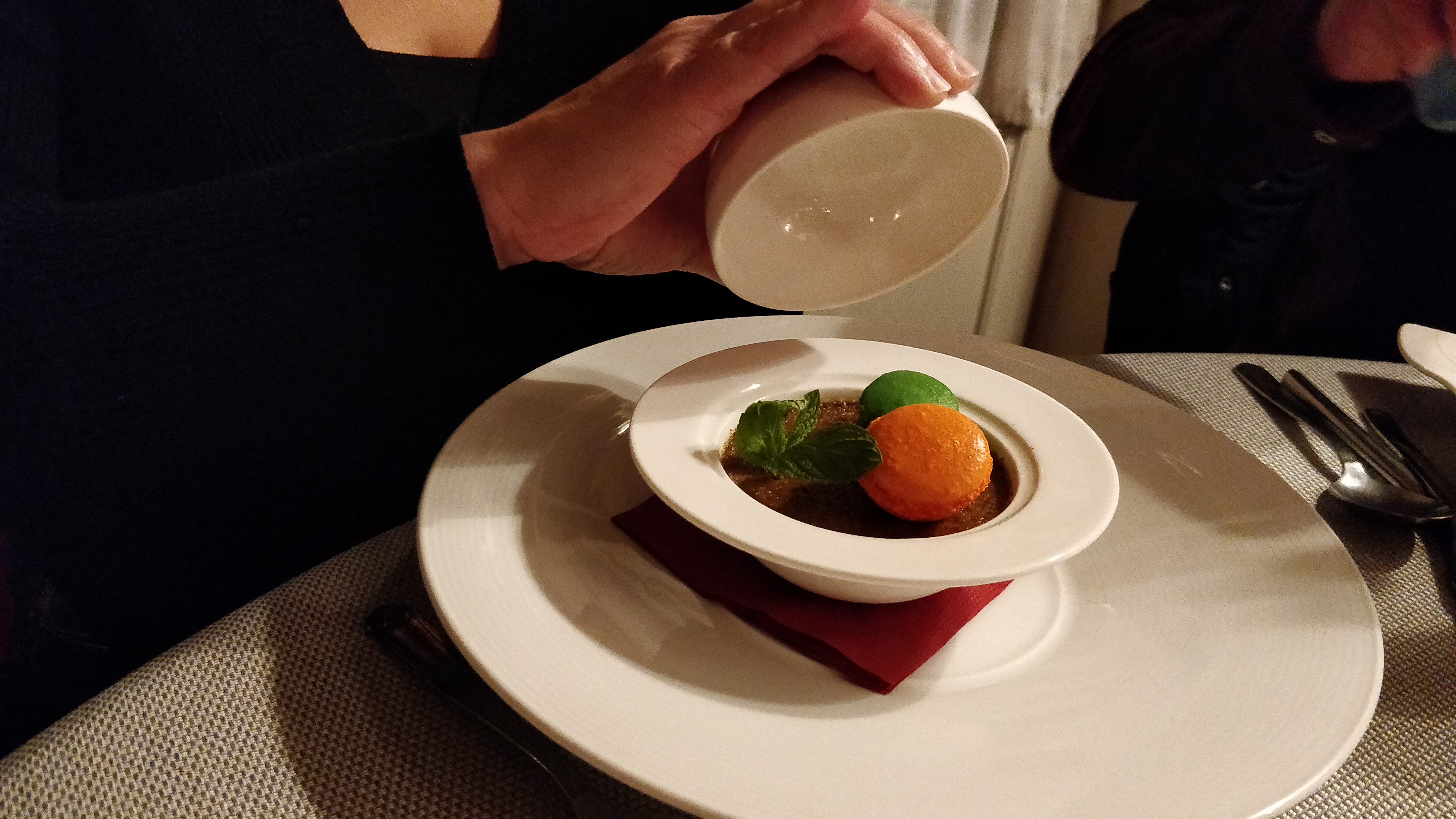 La qualité est au rendez-vous, la finesse aussi. Cependant un peu de légumes dans le plat de veau serait appréciable. Avec tout ce sucre déjà mangé dans les fruits secs, j'ai eu du mal à finir le dessert...