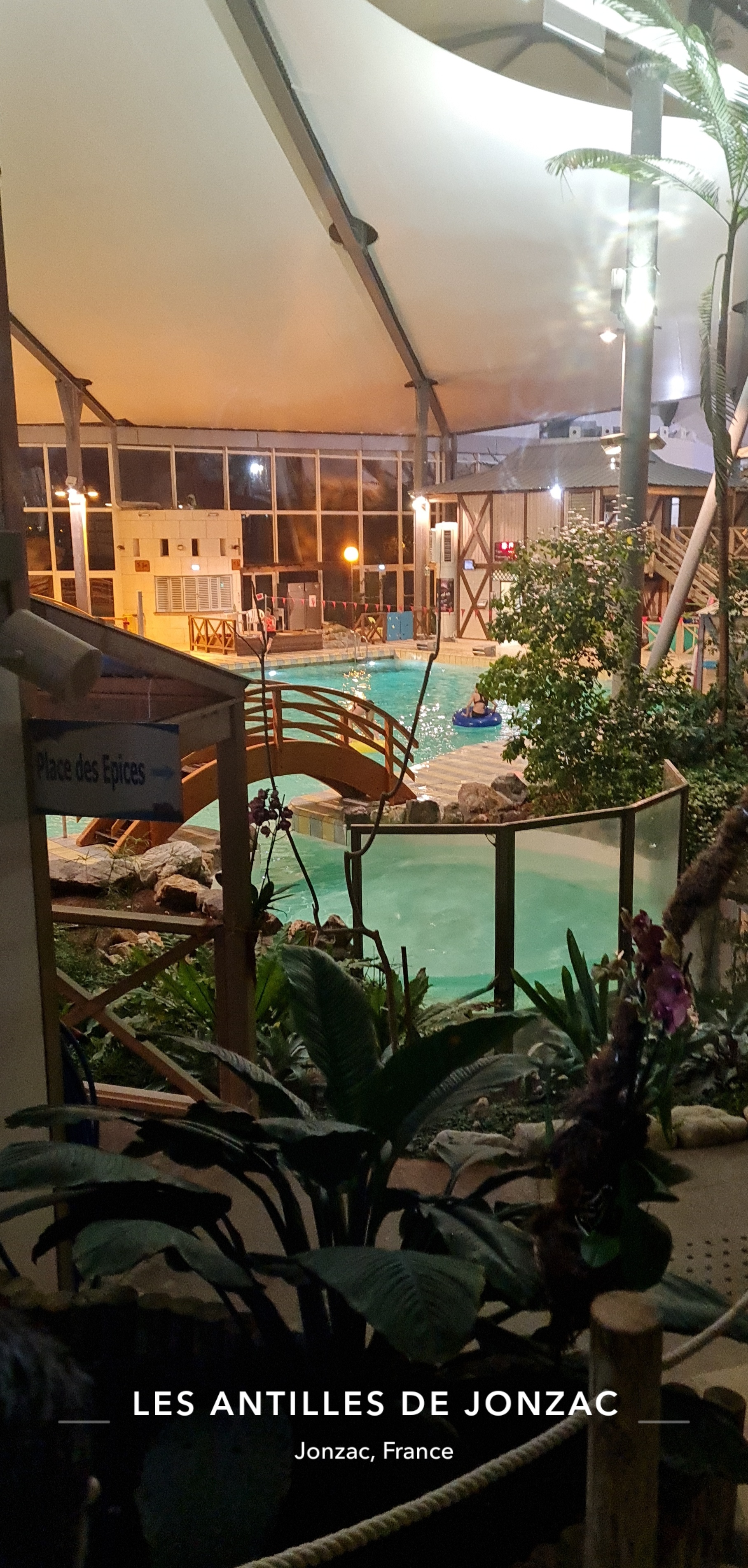 Bonjour, nous sommes venu en famille du 17 au 20 juillet et nous avons dormi au coteaux de jonzac a 50 m des Antilles de jonzac. On a eu accès a l espace ludique a volonté. Le parc est vraiment magnifique. Nous nous sommes éclatés. Je recommande le parc à 100%. Très bon accueil en plus.