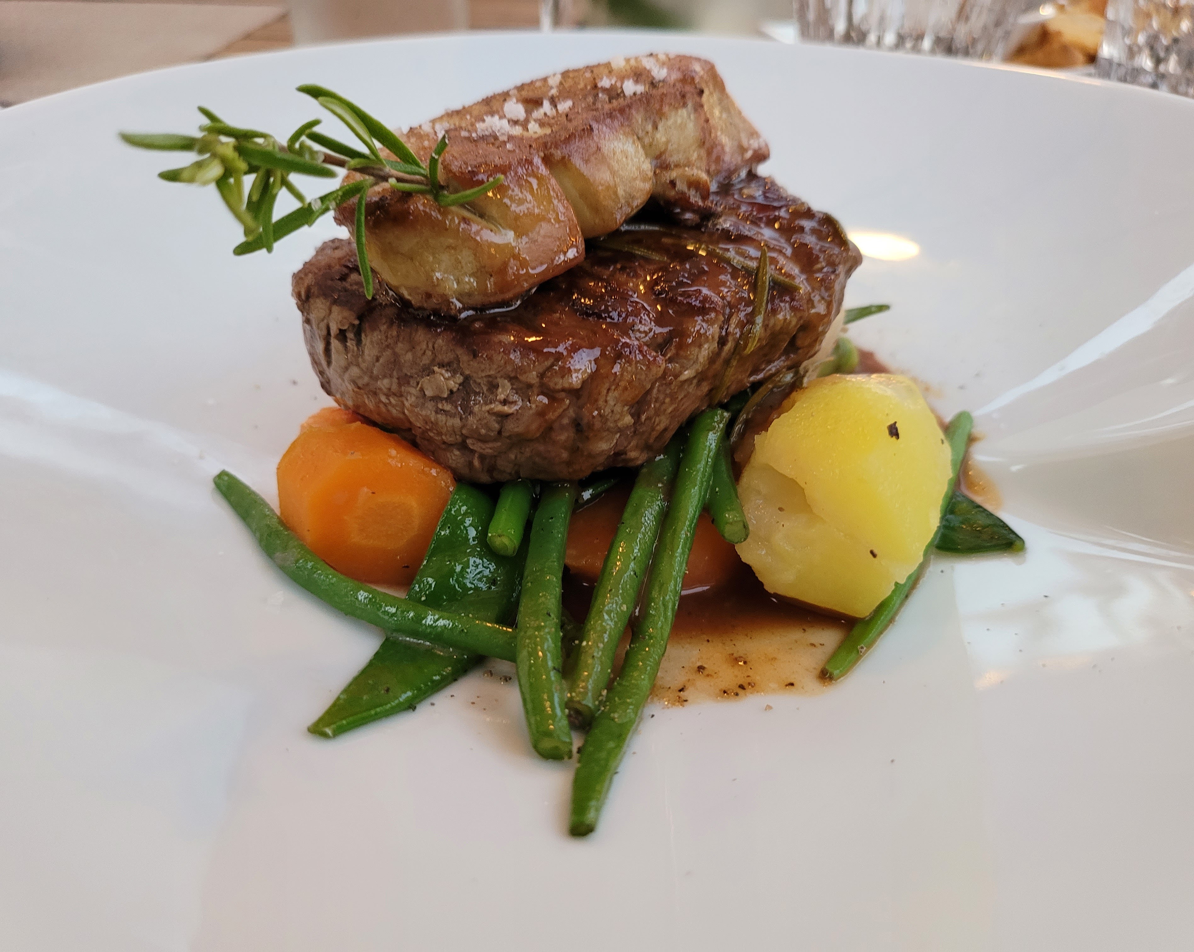 Cadre extra! Personnel très accueillant (ne doutez jamais de l’hospitalité corse!) La cuisine… JUSTE EXCELLENTE! Amateurs de viandes, le filet de bœuf est tout simplement excellent!