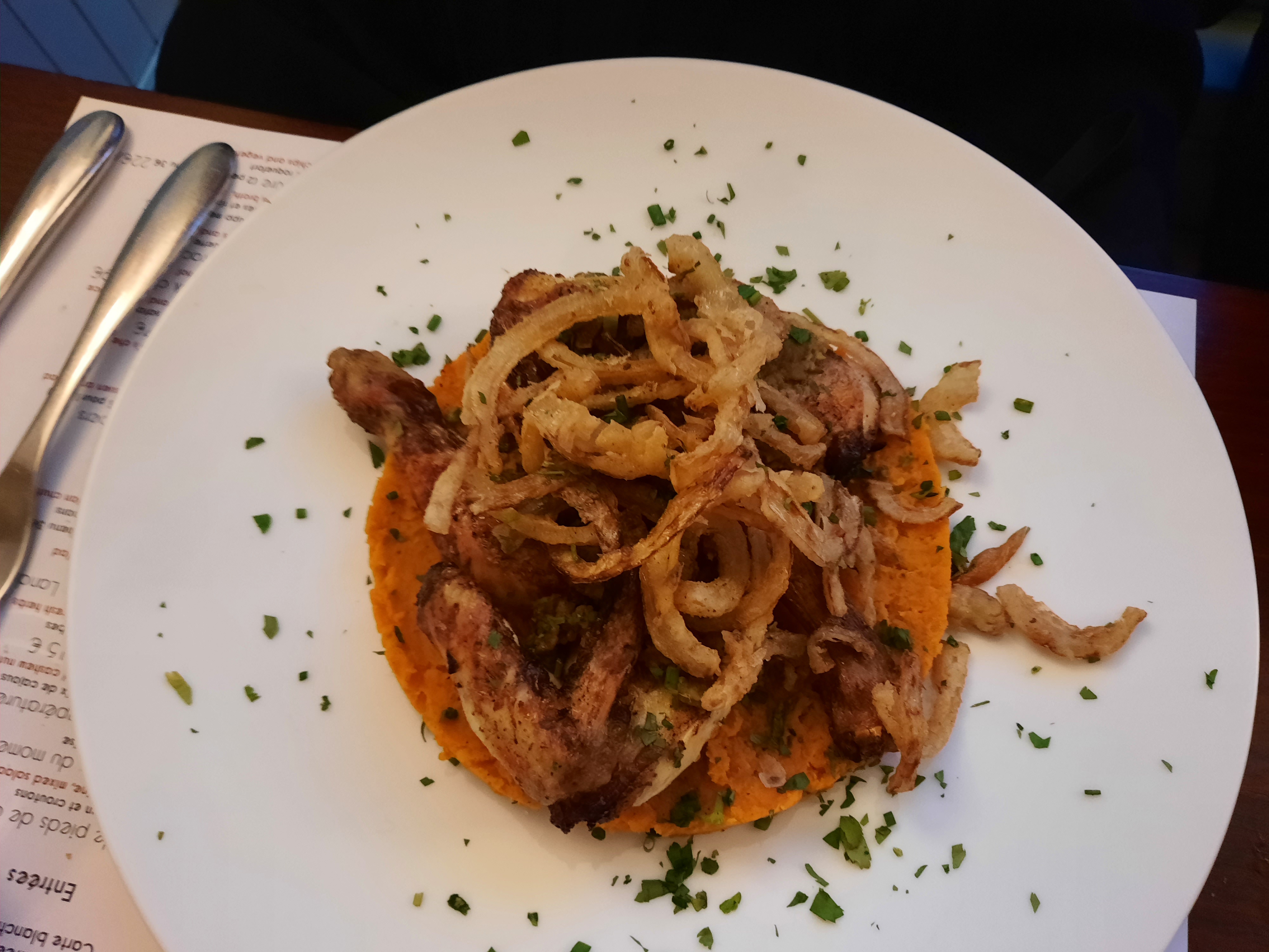L'entrée était correcte. Mon plat, un morceau de bœuf avec purée de maïs était bon. Mais le porc au caramel de ma conjointe était impropre. QUE du gras. Inadmissible pour le prix modéré. Il fallait le renommer en lard au caramel ou gras au caramel. Pourtant je ne pense pas que nous sommes difficile. Nous n'avons pas l'habitude d'aller nous plaindre... Nous n'avons donc pas voulu continuer avec les desserts. Le gérant s'est tout de même montré compréhensif, et ne nous a pas fait payé ce plat. C'est pourquoi je met toute fois la moyenne. Bref, un bon cuisinier, un bon professionnalisme du gérant et des serveuses, mais des produits qui mériteraient d'être mieux sélectionné (surtout pour le porc).