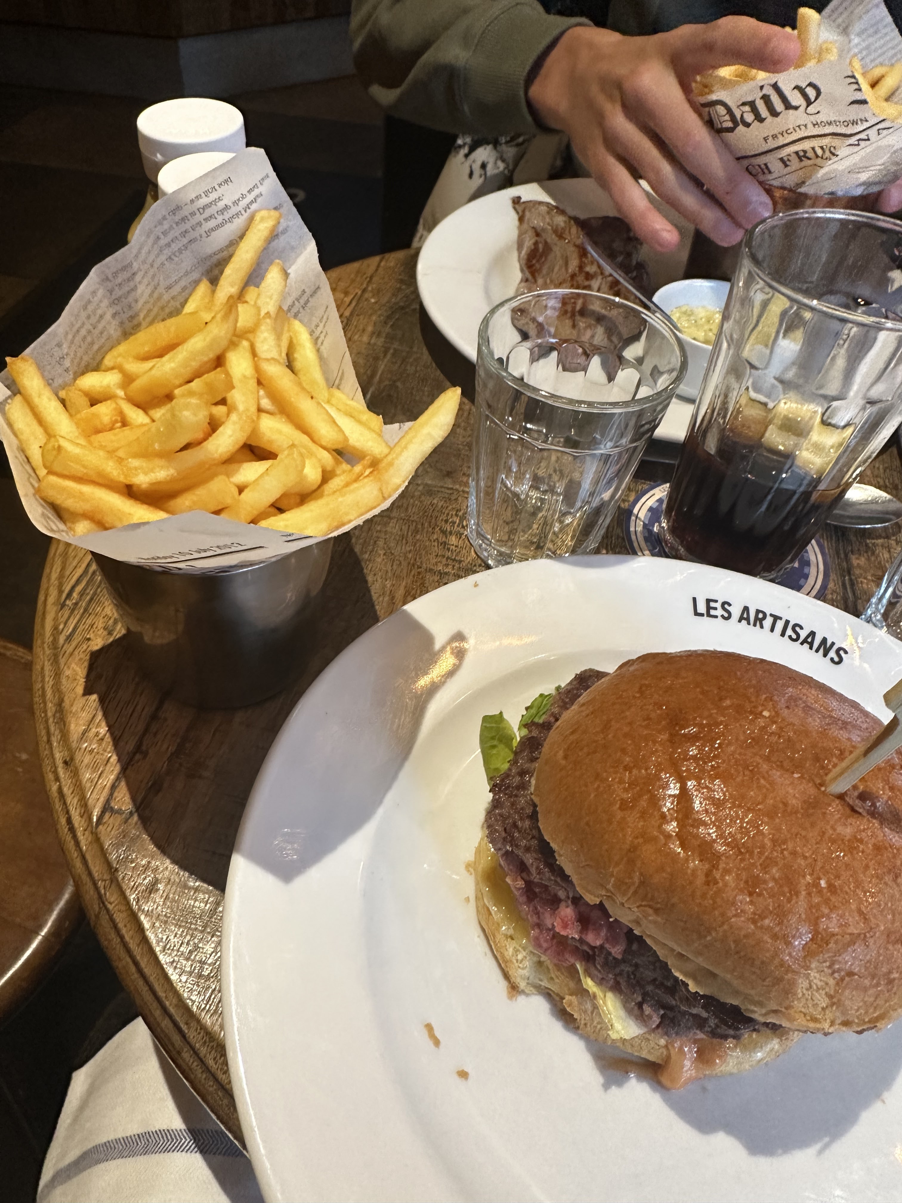 Première étape de notre visite en France. Nous mourons de faim et nous avons fait un excellent choix. Nous avons eu le burger au bacon et les pâtes au jambon, à la truffe et au parmesan. Nous l'avons aimé.