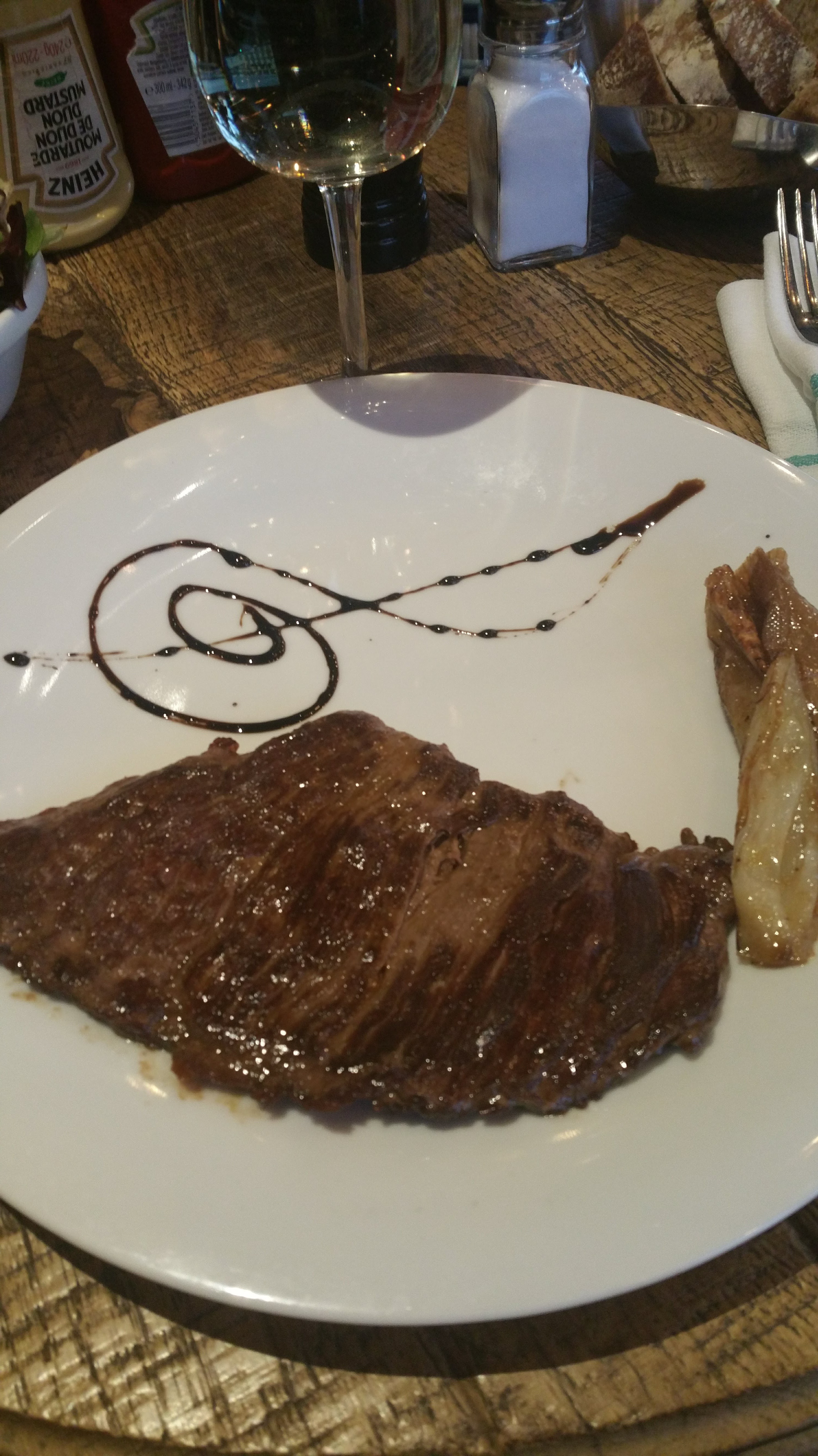 Le nom est prometteur. C’est très tourné sur la viande. J’ai pris une entrecôte. La cuisson était nickel, par contre sur le goût je n’ai rien trouvé d’extraordinaire, on dirait de la vache laitière ? Serveuse très sympa, le patron, si c’est lui, s’énerve pour rien. L’ambiance est cool. Le dessert, un pain perdu était pas mal du tout, la glace vanille qui va avec aussi. Ils proposent la plupart des vins en carafe, c’est bien vu. Par contre le vin n’avait rien d’extraordinaire lui non plus. Bref ambiance sympa, on a été servi vite, mais rien d’extraordinaire sur la bouffe