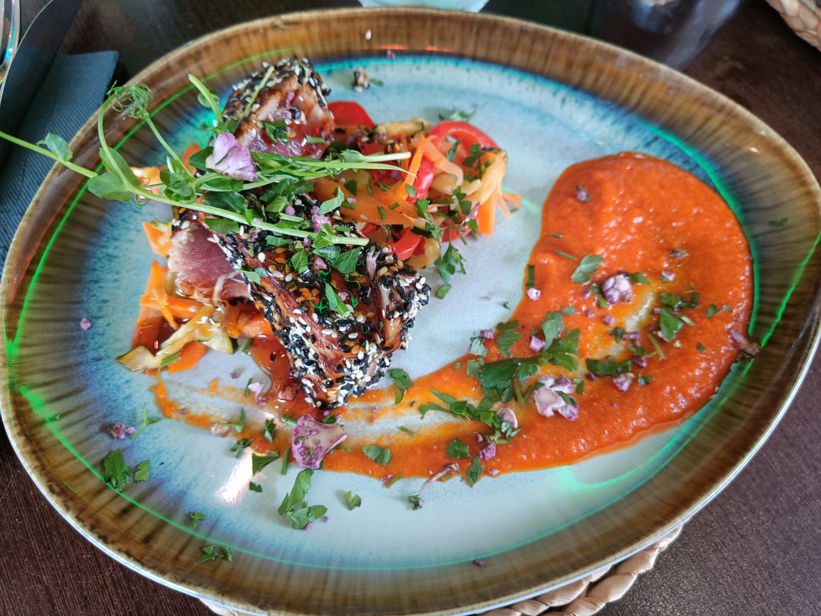 Bon rapport qualité prix Lieu très sympa Le tataki légèrement trop cuit mais très bon tout de même et ma purée de poivron un régal ! Le hamburger bien garni et super bon ainsi que les frites ! Perso je recommande 😉😊