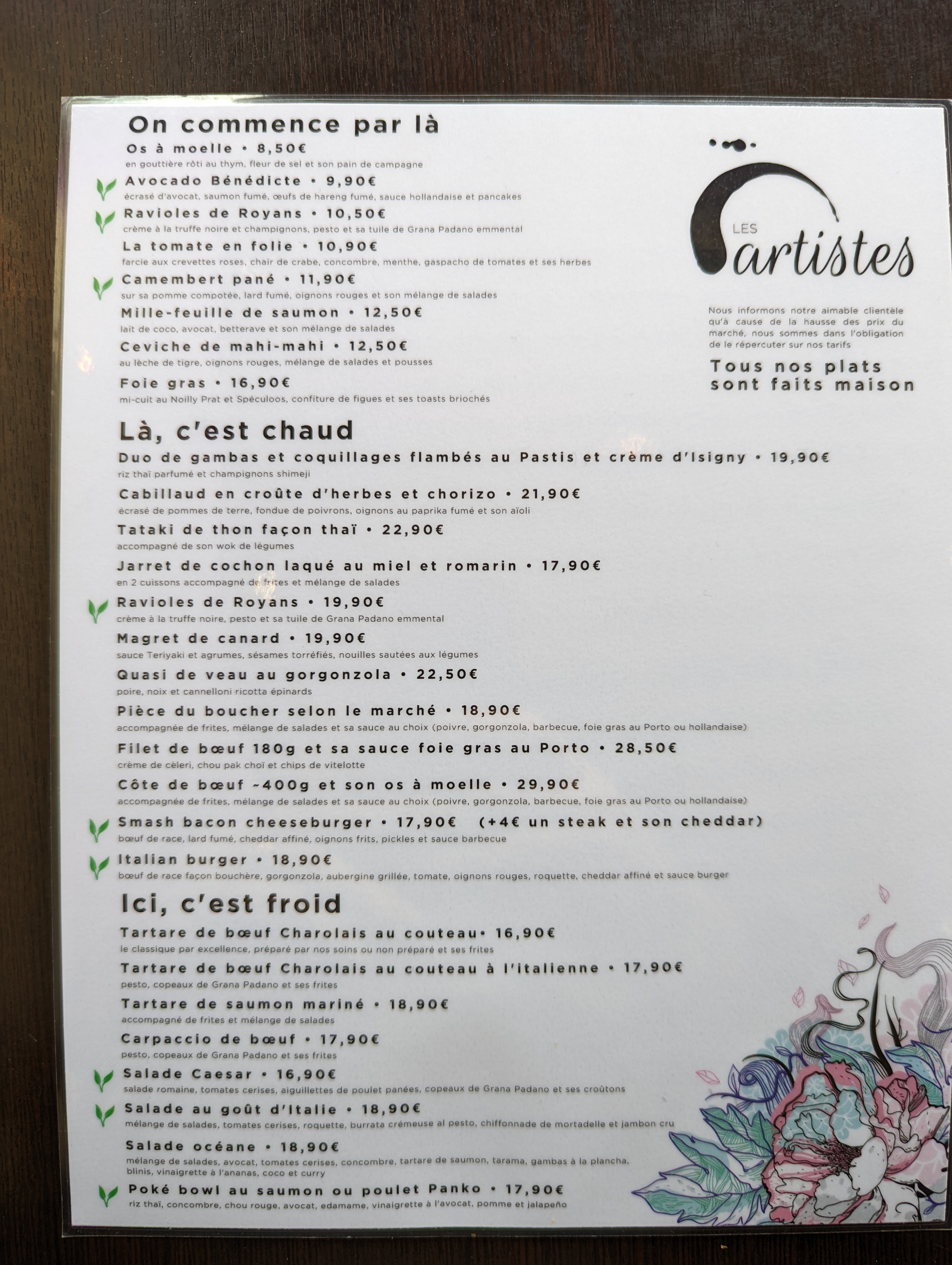 L'équipe des Artistes est au top, souriante et agréable. Le repas était succulent , nous étions 12 et aucun décalage. Vraiment je recommande.