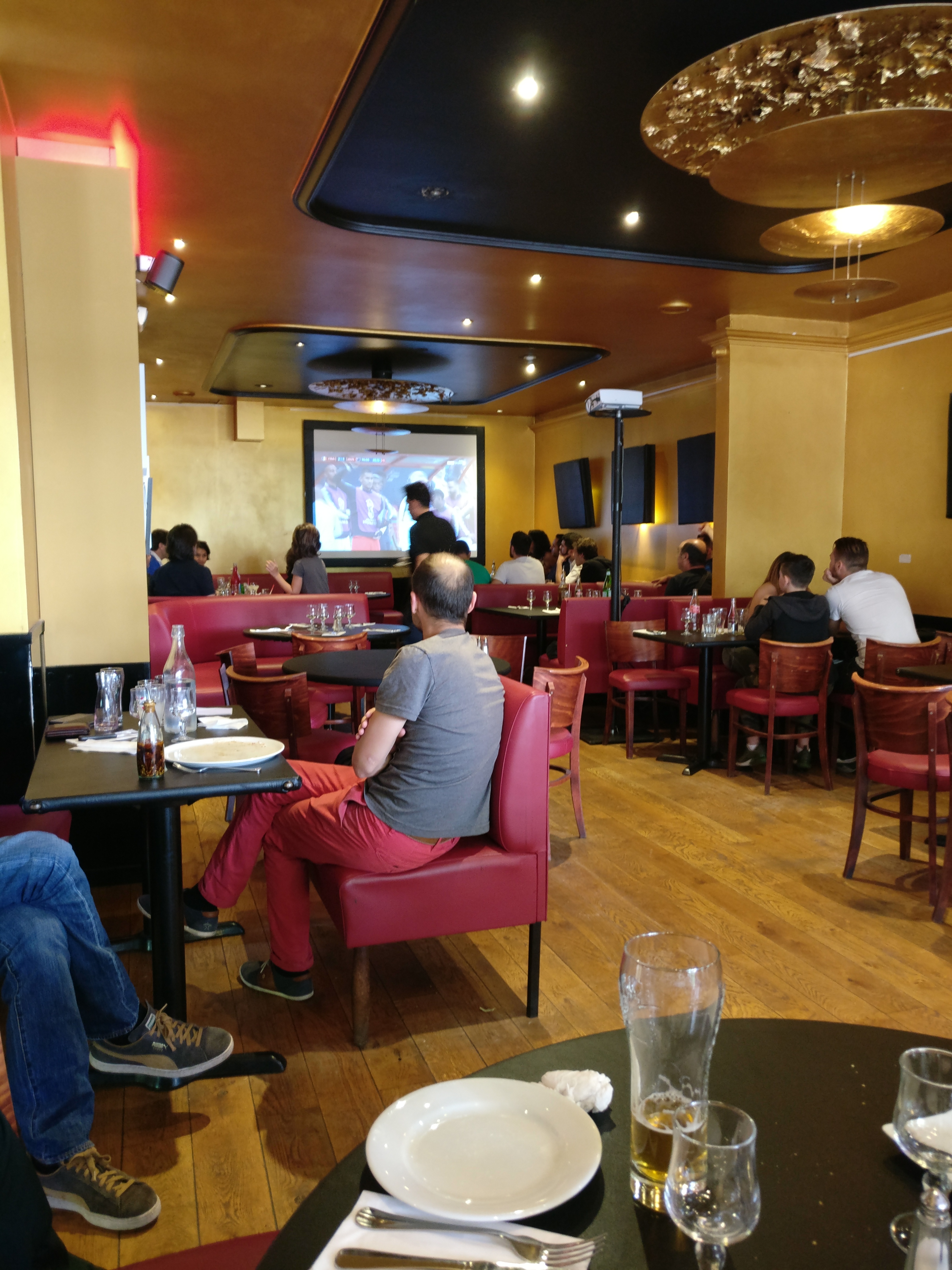 Ambiance or et noir, plutôt confortable. Nous n'avons pris que des bières. Le serveur (peut être le patron) ne semblait pas très aimable. Positionnement idéal en face du théâtre, loin des voitures.