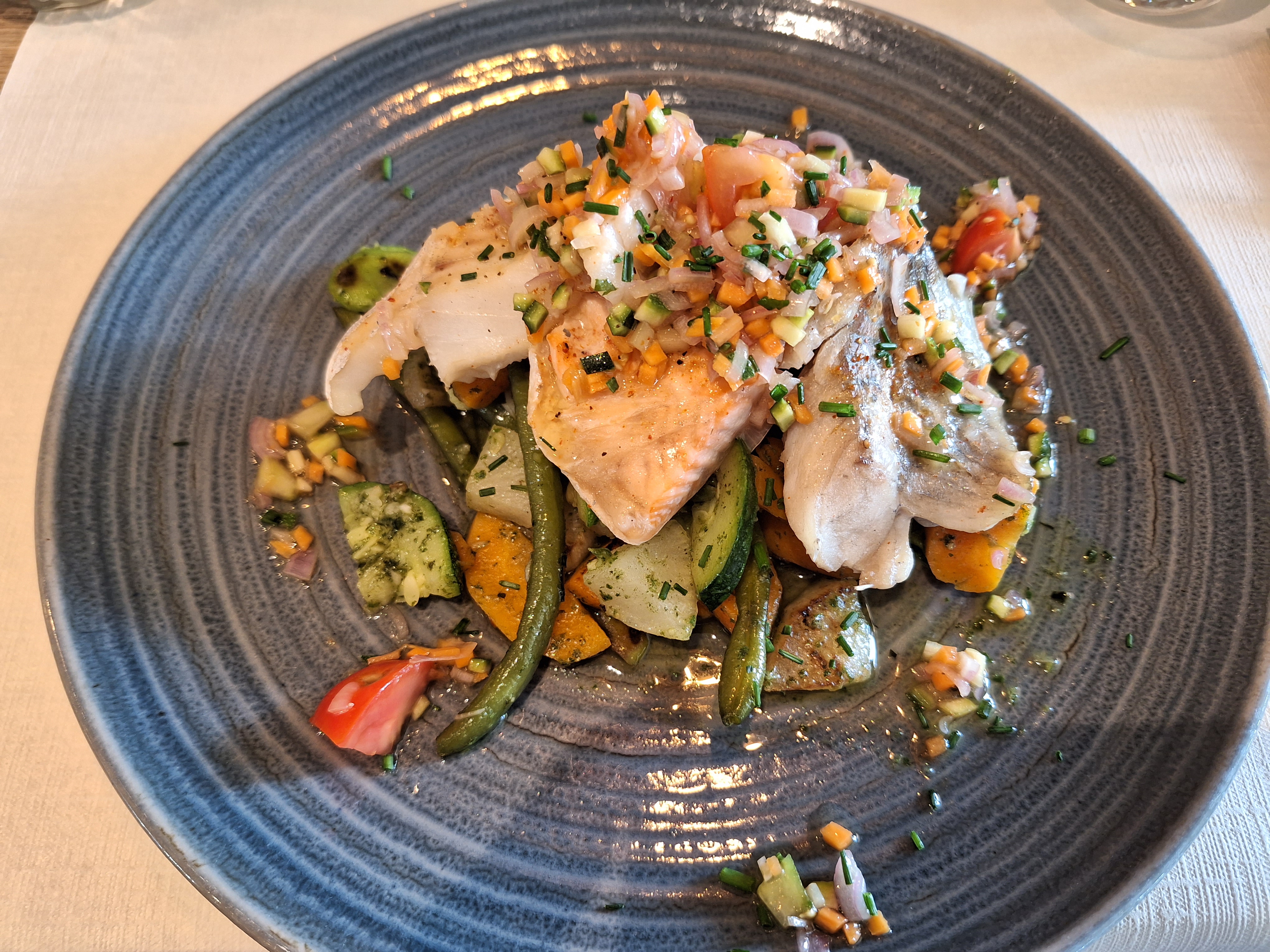 Un excellent plat de poissons avec ses petits légumes. Un bémol pour le dessert, j'ai demandé deux parfums de glace, un seul a été servi 🥴 Ce restaurant est très calme avec peu de fréquentation au moment où nous avons déjeuné.