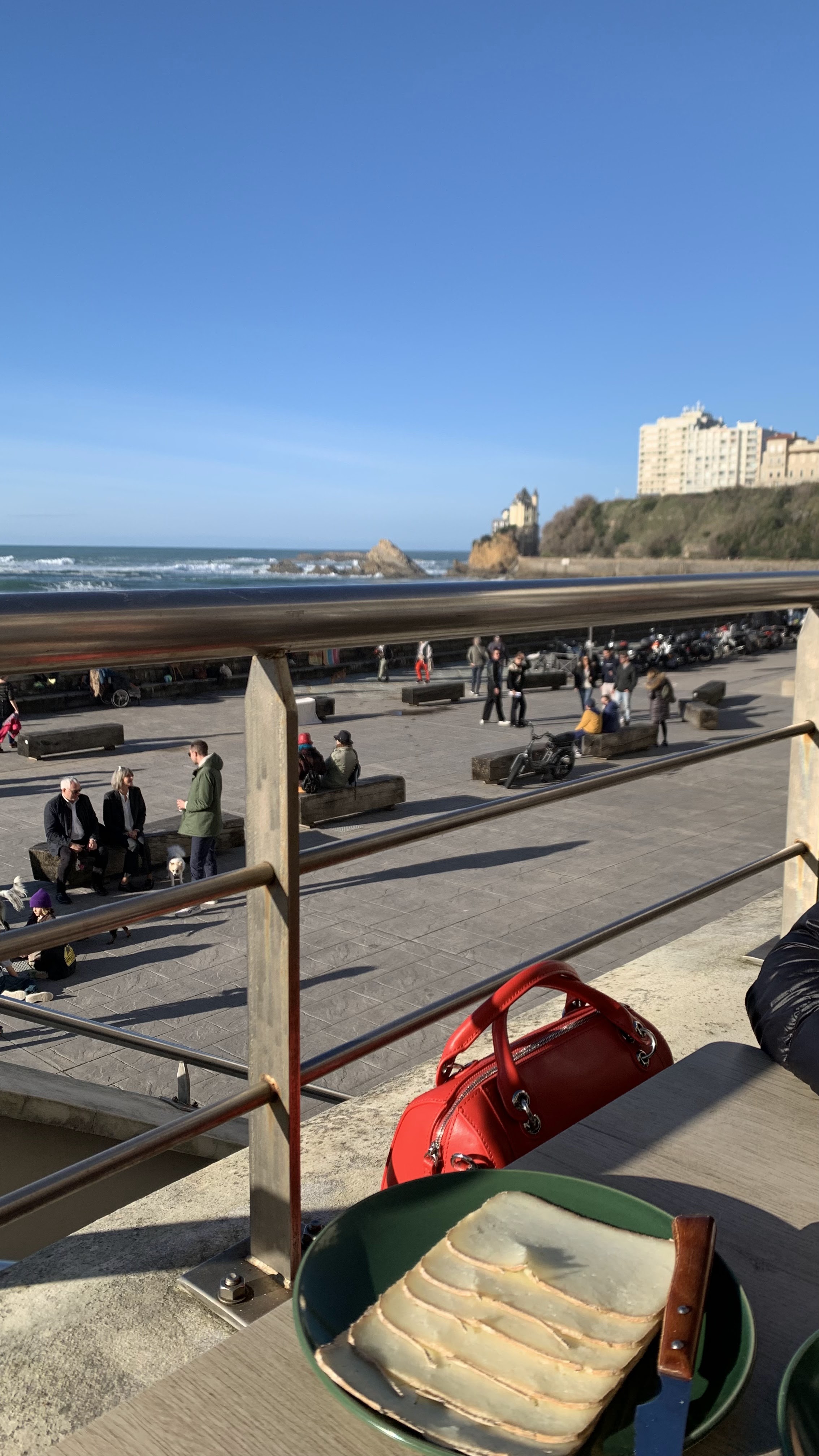 Nous nous sommes arrêtés ici pour une pause café ! C’est de là que nous avons trouvé l’inspiration pour faire un surf trip à Biarritz lors de notre prochaine visite. Vous surplombez l'océan avec les surfeurs qui sortent. Ils proposent également une variété d'options de petit-déjeuner que nous n'avons malheureusement pas essayées, la prochaine fois, c'est sûr. Il convient de mentionner que le service était excellent.