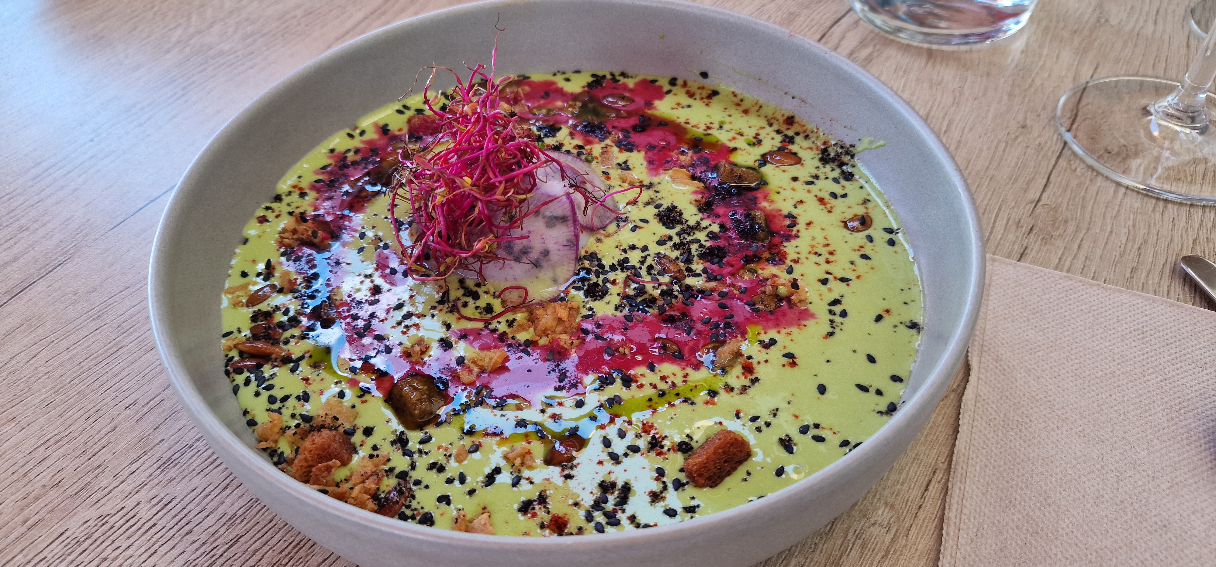 Quel agréable moment de gourmandise !!!! Et ce ne sont que nos entrées... Œuf parfait ( poché )servi sur un fondu de petits pois, incroyable ! Truite (de notre région) en gravelax, goûteuse à souhait... Gaspacho de tomates, délicat et parfumé... Tout à été cuisiné et préparé par le chef Barthélémy et ses assistants très à l'écoute!!! Le service attentionné de Léo, et des collègues, eux aussi, tres agréable. J'ai raté les photos des plats de poissons et de viande ....qui étaient, eux aussi, excellents!!!!(Ce sera pour notre prochaine visite .) Cette excellente soirée passée sous le regard attentif et chaleureux, de Gauthier, et de Rosa, les nouveaux propriétaires. Merci, merci pour ce superbe moment de plaisir culinaire.