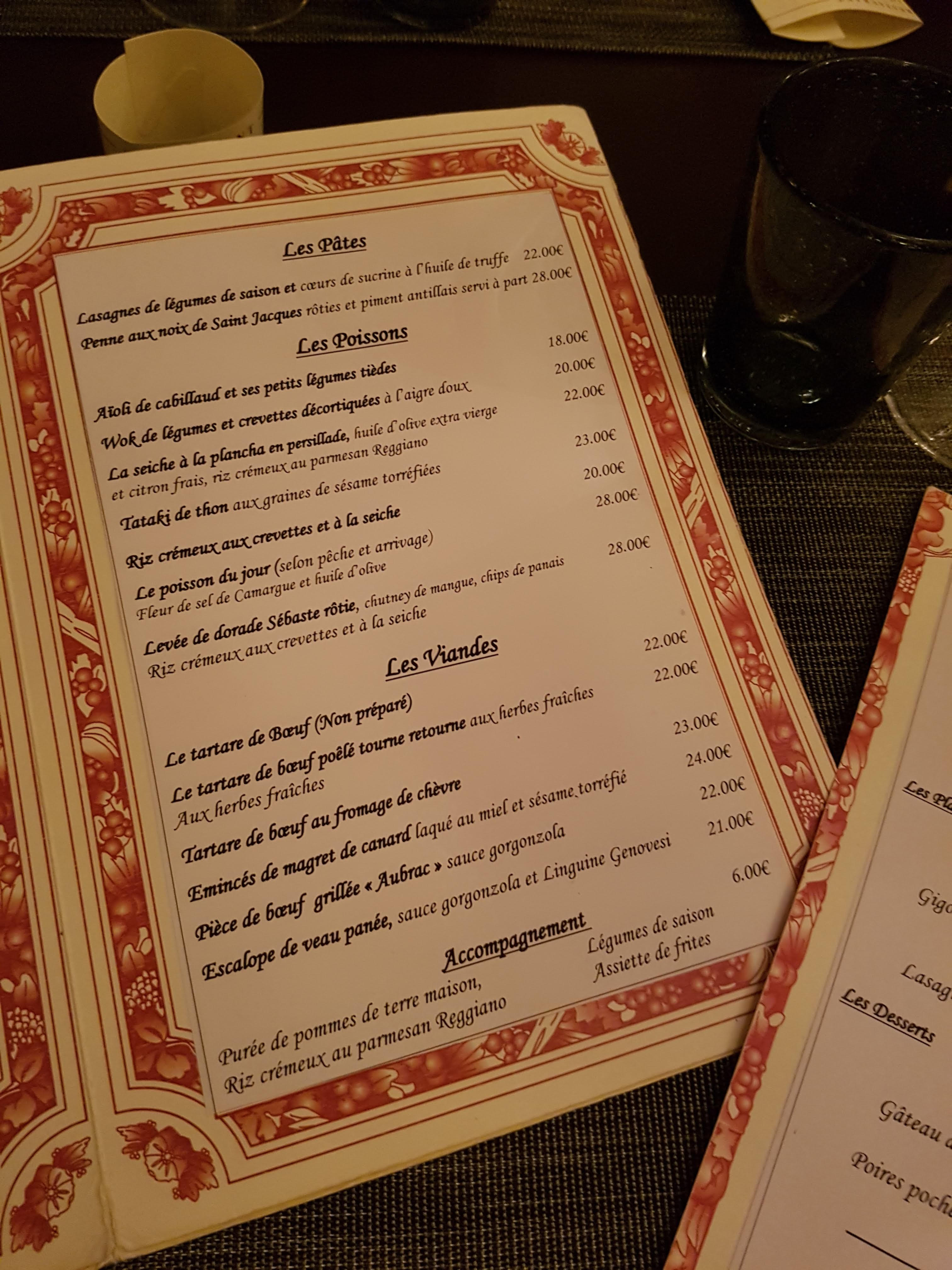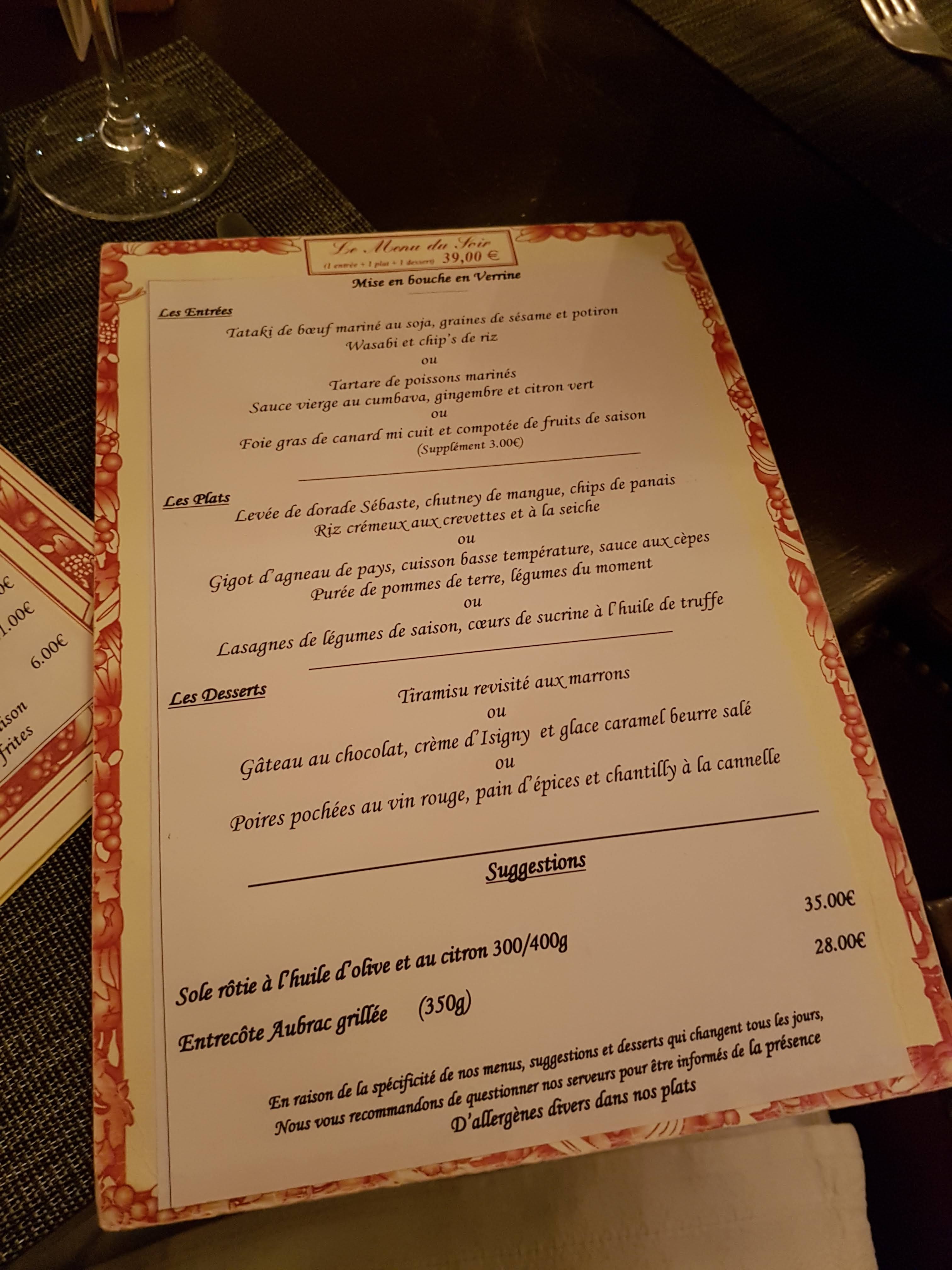 Déçu, les repas sont beaucoup trop simple pour ce prix. Ça ne vaut pas 40 euros le menu. Franchement à 30 euros le prix aurait été plus correct. Les desserts sont vraiment à revoir et le pain est sacrement mauvais.
