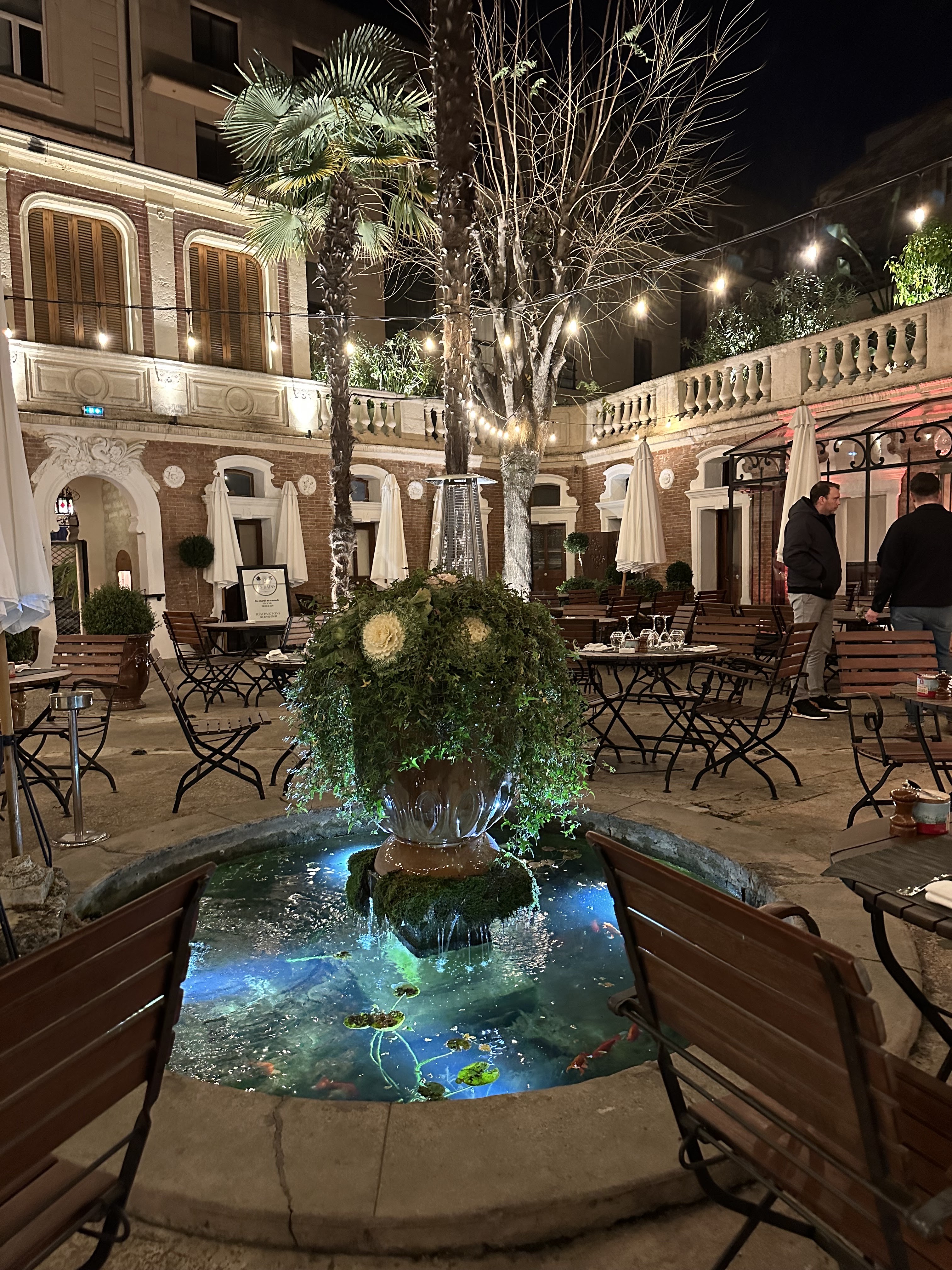 Superbe cadre, au milieu d’un patio entouré de palmiers et une belle fontaine au centre. Menu à 40€ qui vaut vraiment le coup, très copieux, TRÈS bon ! Également des plats à la carte. Service très sympa ! Bref on était enchanté, joli coin pour emmener votre chérie 😉