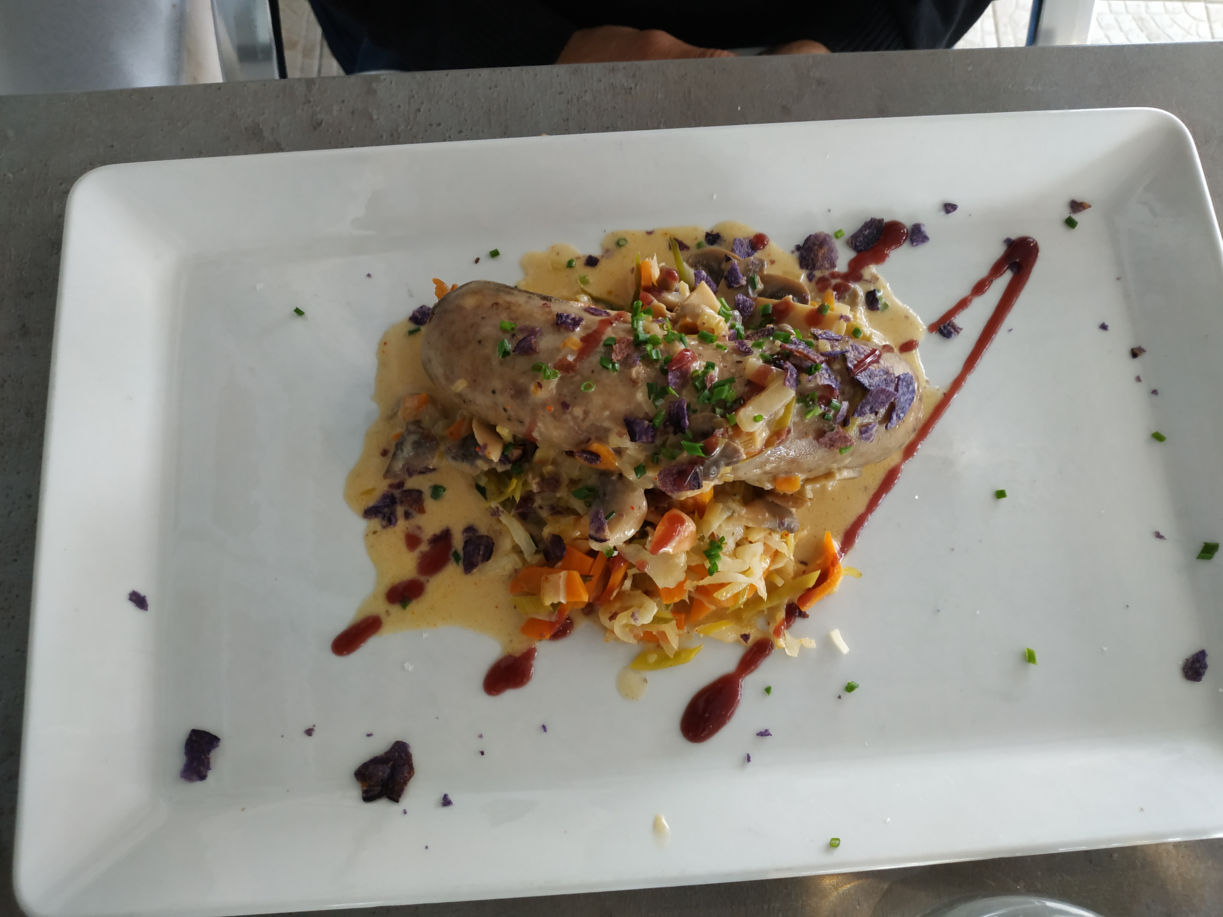 Accueil sympathique et attentionné en ce jour pluvieux mais la cuisine est sans plaisir et même l’assiette de pâtisserie est mal équilibrée. Beaucoup de regret car restaurant conseillé par des locaux.