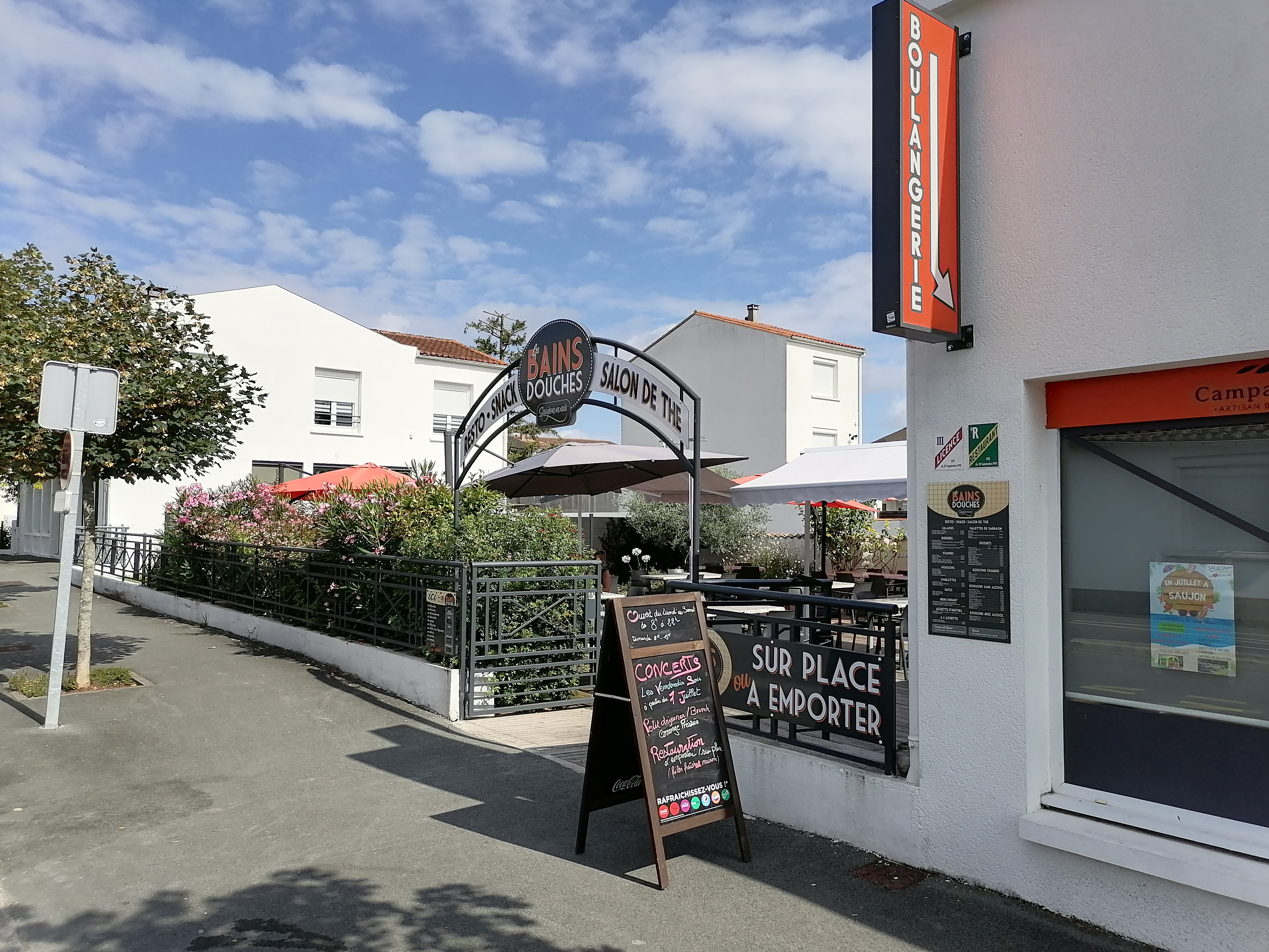 Les Bains Douches Saujonnais est un salon de thé, bar, snacking, situé à l'arrière de la boulangerie L'Authentique, rue Faneuil à Saujon. La grande terrasse ombragée permet d'accueillir les clients toute la journée, pour une restauration rapide, au petit déjeuner, au déjeuner, ou au dîner, ou simplement se désaltérer. Le wifi y est gratuit. La carte propose des plats allant des salades aux desserts, en passant par les burgers, galettes de sarrasin, pâtes, poissons, ou omelettes. L'été, concerts chaque vendredi soir.