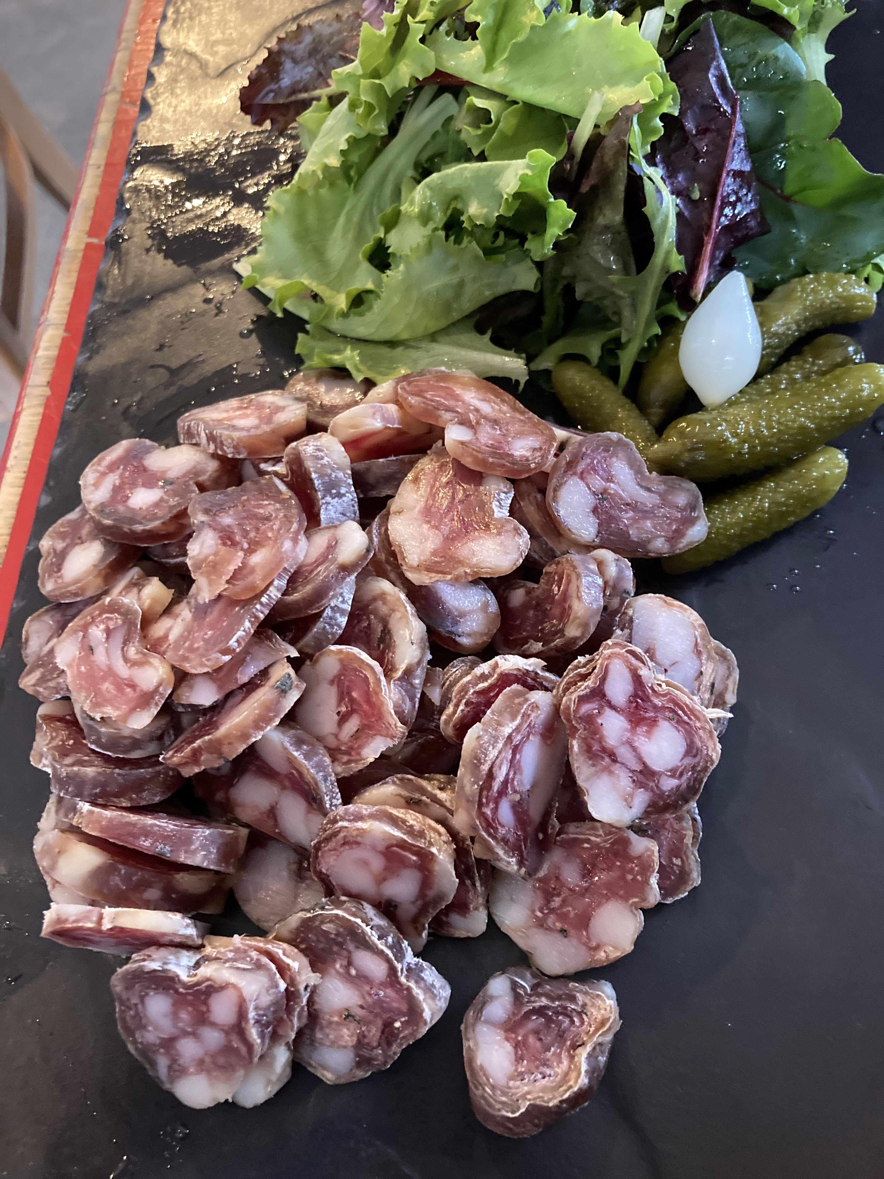 Le lieu était ok. Le service pourrait s'améliorer. La sélection de vins au verre était bonne. Un joli Tempranillo. La planche de charcuterie venait juste de prendre du saucisson. Le pain était ok.