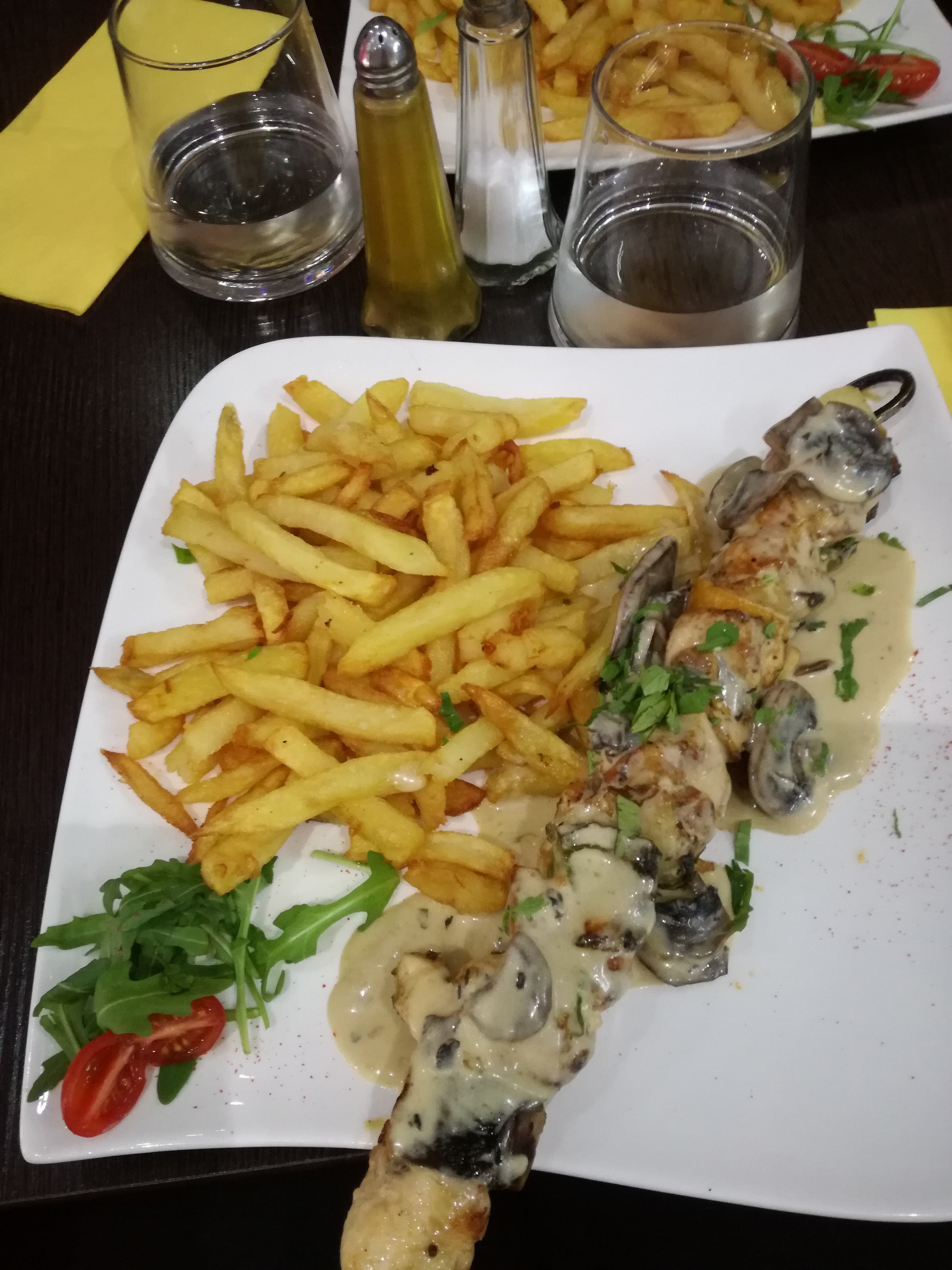 Nourriture simple mais abondante dans l'assiette, bien préparée et fraîchement cuisinée, très agréable et une bonne affaire pour le prix. Choix raisonnable de plats. Personnel sympa. Possibilité intérieur/extérieur. Bar. Belles vues sur la ville médiévale. Grand parking.