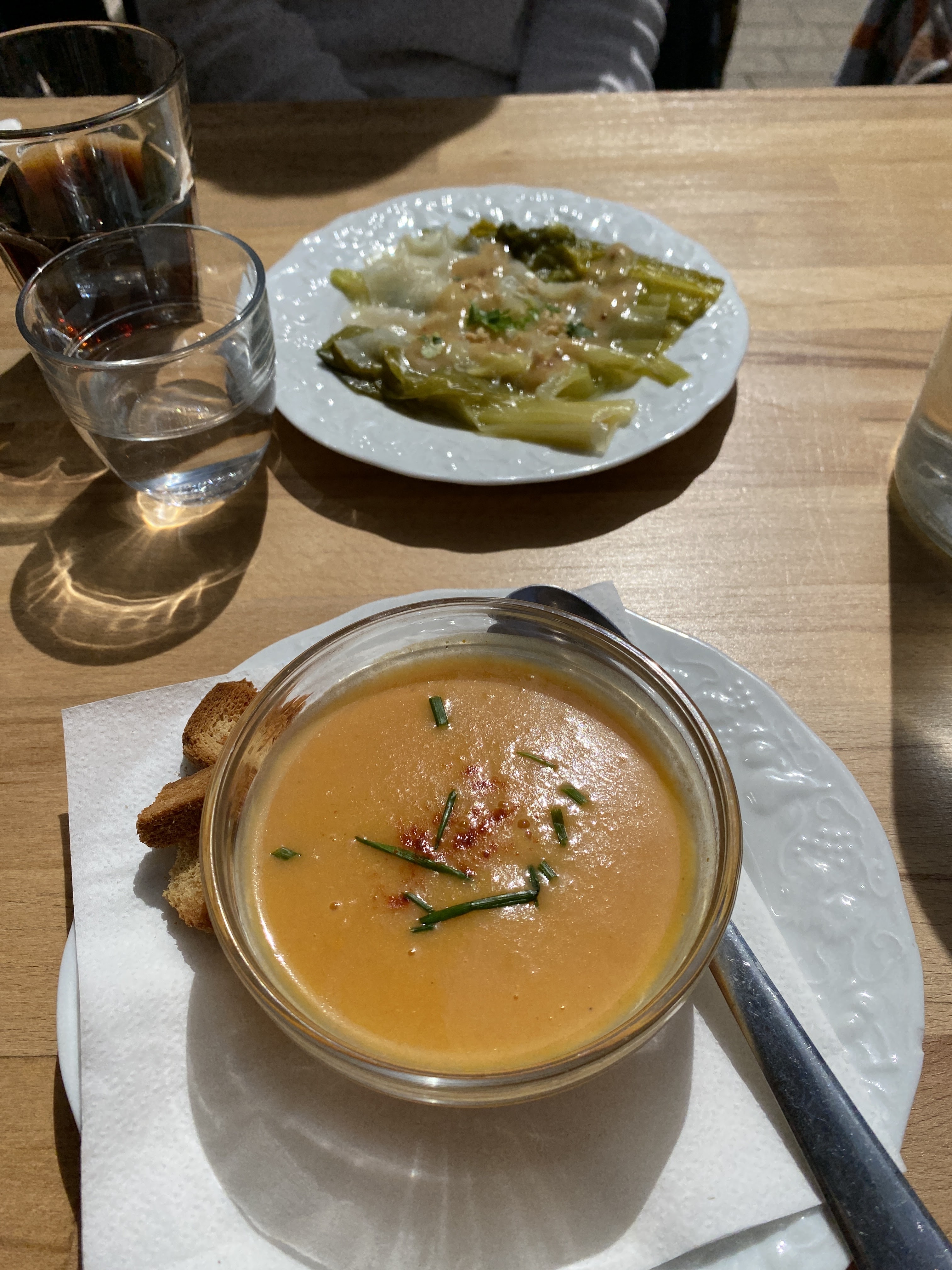 Nous étions pour déjeuner au soleil sur la terrasse. On a vite compris que le staff était débordé pourtant il n’y a pas une capacité de folie non plus mais quoi qu’il en soit on a mis du temps à être servi. C’est pas gravissime donc a pris le temps de regarder les assiettes autour de nous et la carte: pas un choix debordant mais signer et efficafe et puis un œuf mayo à 3€ c’est cool ! Entrée du jour delicieuse: soupe froide de courgette mentholée. Et en plats : coquillettes jambon vraiment excellent + la daube avec purée maison. C’est vraiment cantine et bon esprit mais j’ai pas l’impression d’être dans un truc vraiment pas cher (contrairement aux Bouillons Parisiens par exemple). Les boissons sont à des prix classiques donc pas intéressants, c’est dommage on apprécierait un verre de limonade ou de vin à la verse. En conclusion c’est bon c’est bien placé mais c’est pas un truc de fou , il manque des petites choses.