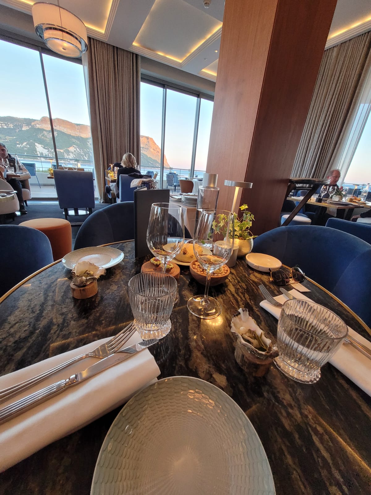Diner agréable, vue magnifique, moment romantique. Nous sommes accueillis très convenablement dès notre arrivée par un voiturier au sympathique accent marseillais, lui-même très sympathique. Nous sommes ensuite conduits à notre table et là, la magnifique vue sur le cap Canaille écrase tout. Le personnel est aux petits soins et essaie, avec des efforts louables, de faire oublier qu'il doit être au service de beaucoup de monde. Les sourires et les conseils ne manquent pas et il faut leur en savoir gré. Même s'ils n'égalent pas ceux que l'on déguste chez Bocuse ou chez Loiseau, les mets sont très corrects et le Bandol est excellent. Le soleil décline et nous profitons du jeu de lumière à l'horizon. Ce moment, en l'honneur du 60ème anniversaire de mon épouse, restera dans la mémoire longue et c'est justifié.