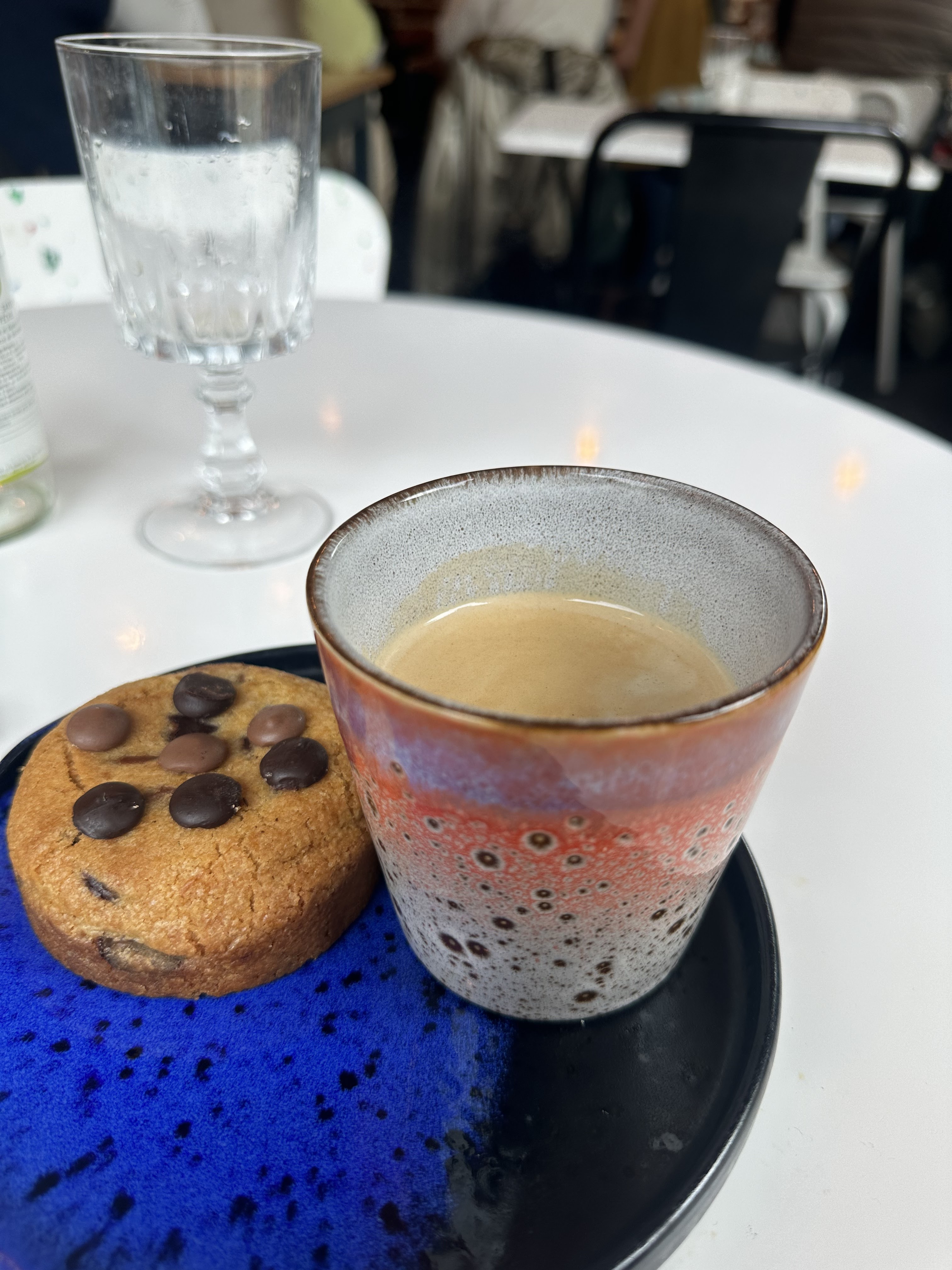 Déjeuner à deux au top, poulet au curry et tchoutchouka délicieux. En dessert, fondant au chocolat - très bon pour la première moitié, trop pour moi pour la seconde. Pensez à réserver, c'était plein !