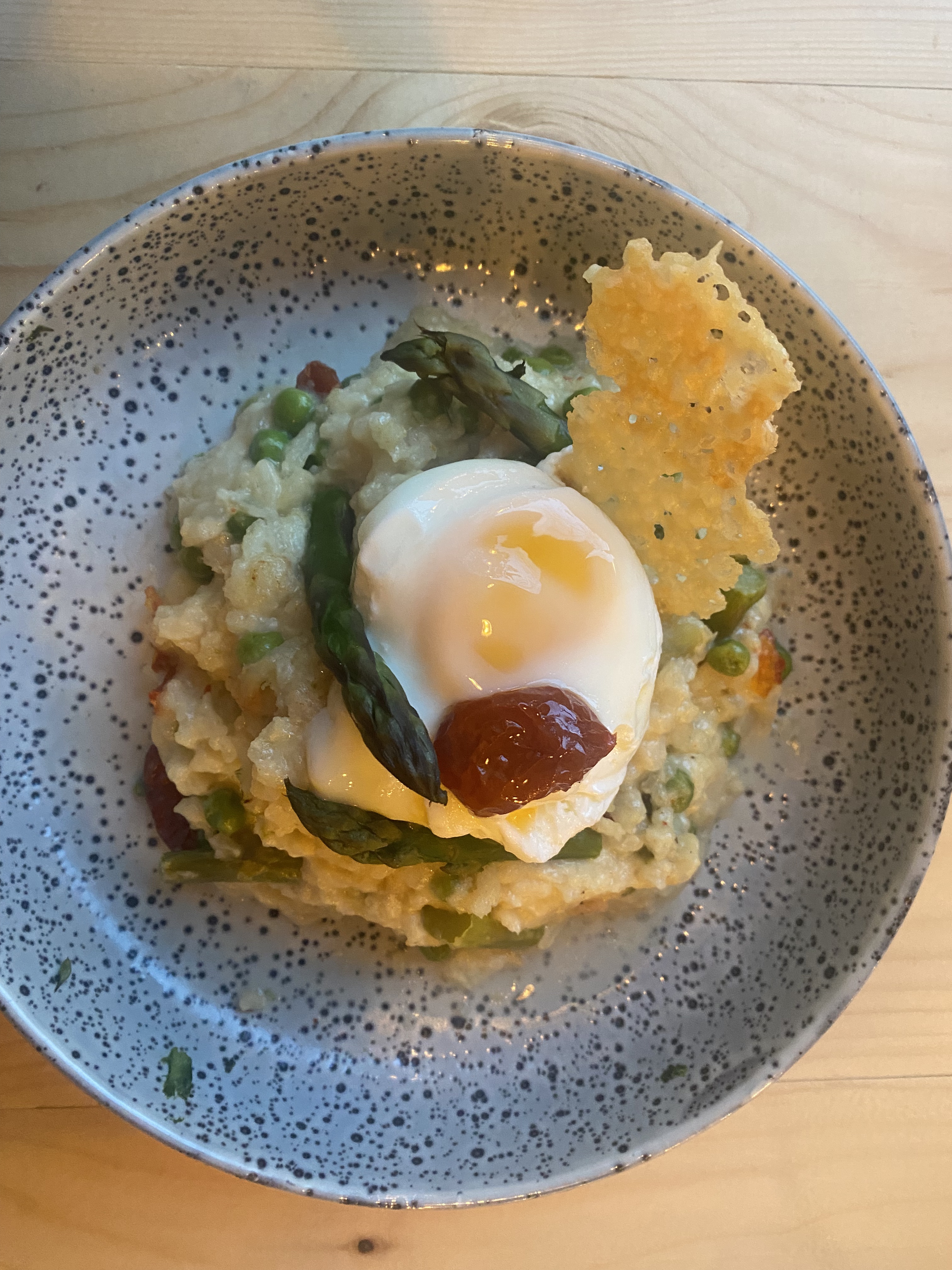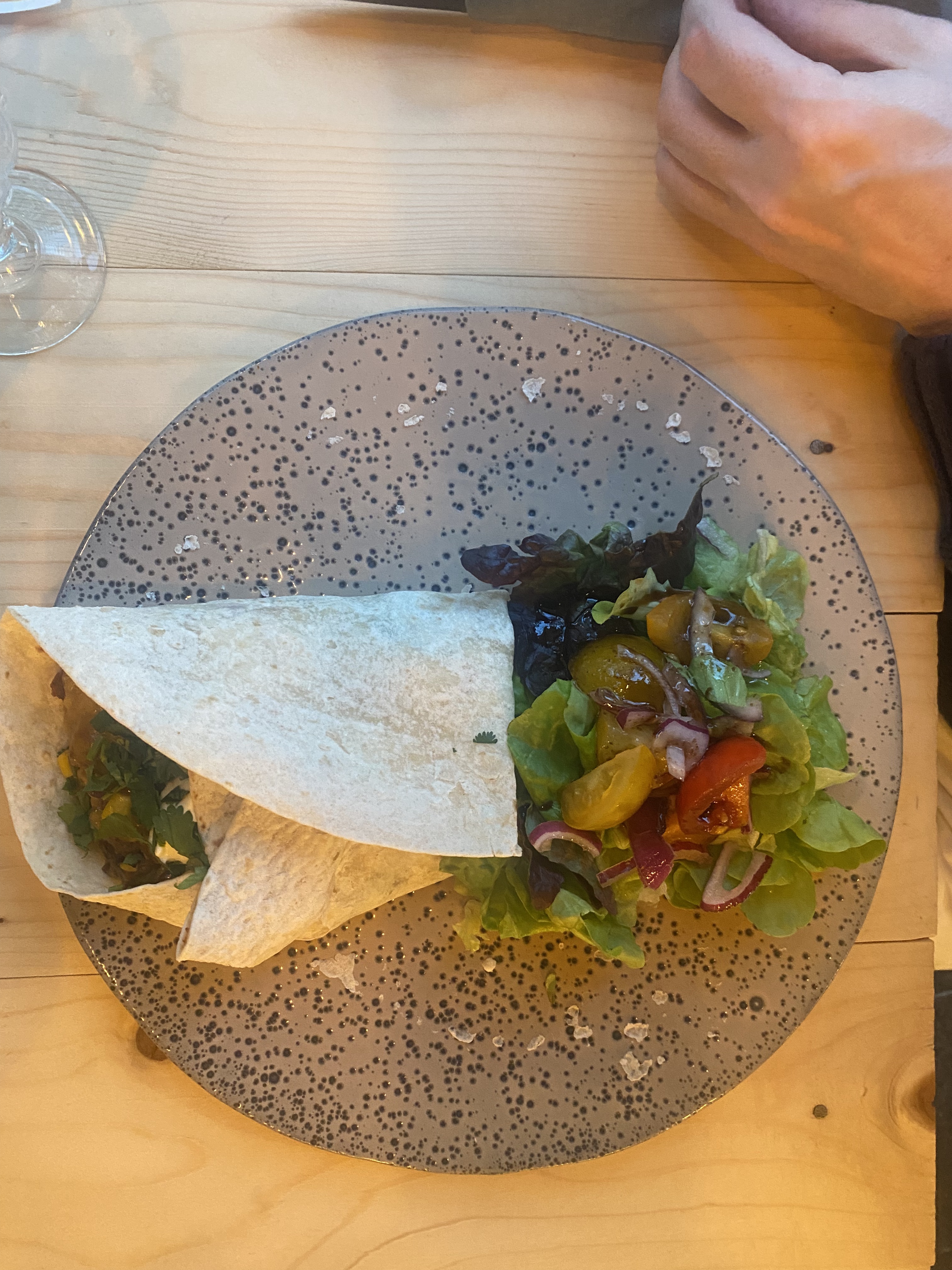Burrito, bon. Risotto, le riz se désintègre, trop cuit ou chauffé plusieurs fois. Un peu fade, manque de sel, de poivre, de parmesan et de beurre. La tuile de parmesan n’était pas croquante. Financier très bon. J’ai bien aimé le cœur chaud. La vue de la poubelle juste devant le resto n’était pas super non plus. Un détail qui fait de la différence.