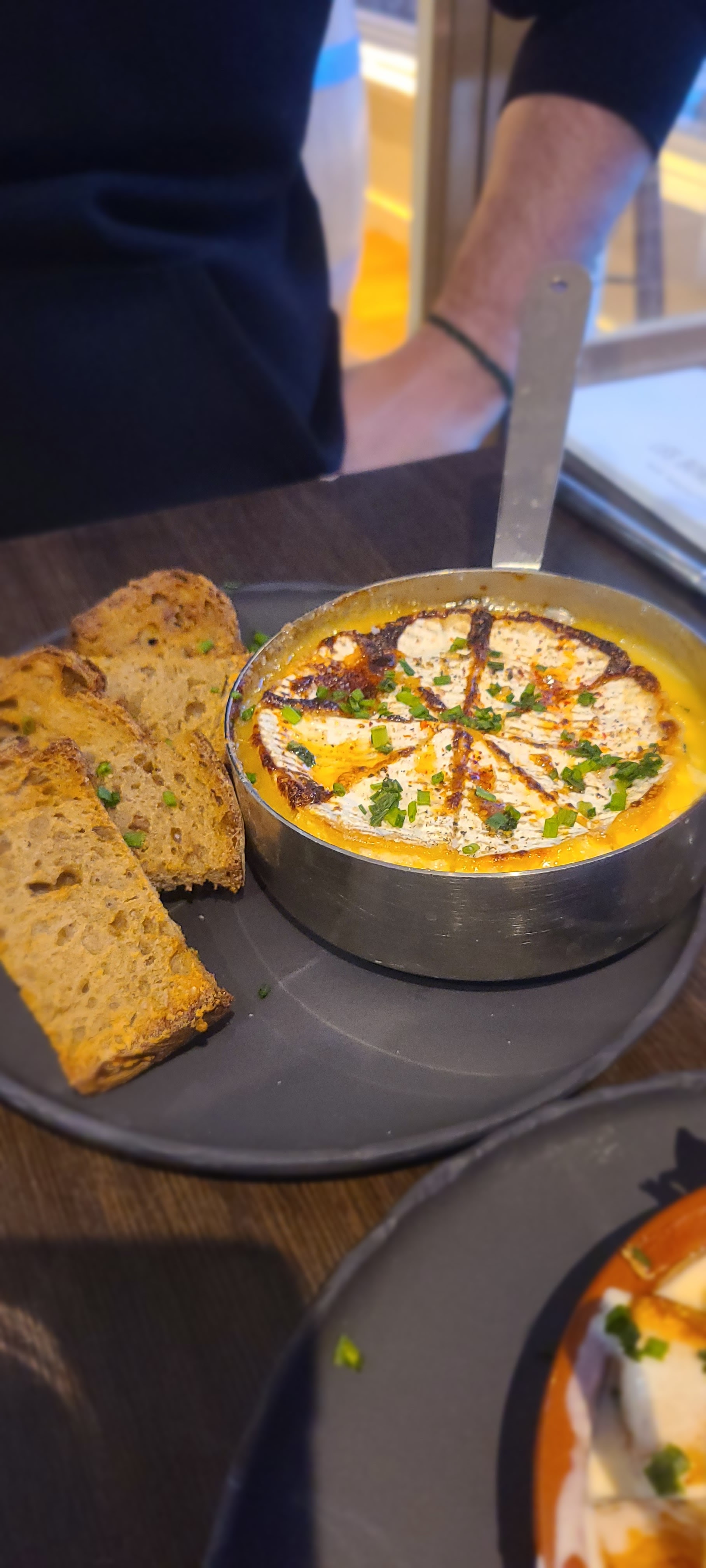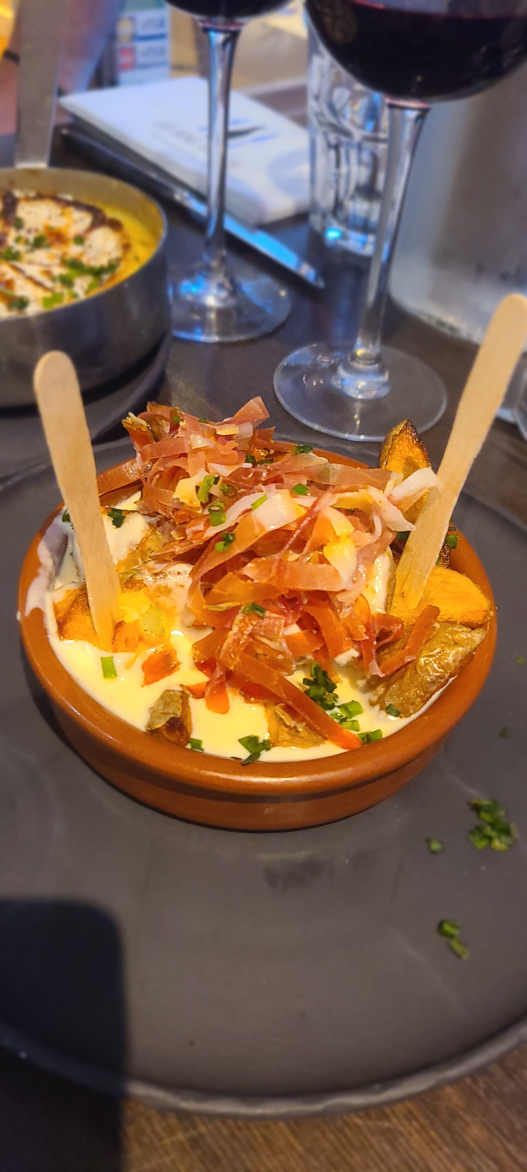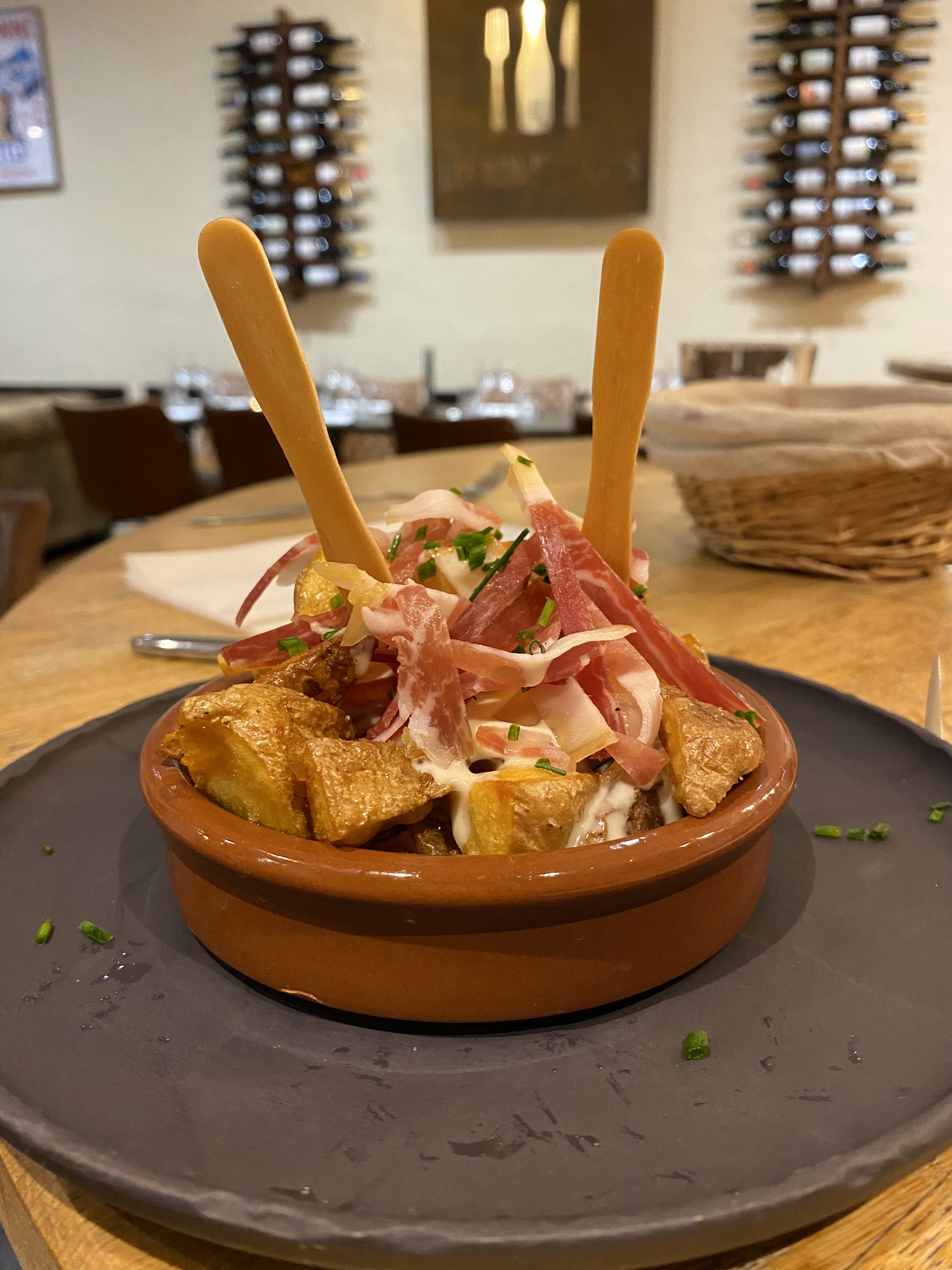 Depuis le temps que nous voyons toutes ces belles vidéos des bons vivants et leurs plats bien rempli… Le repas est très bon, le vin aussi en revanche grosse déception sur les quantités. Le cadre quant à lui je dirai que le manque d’espace ainsi que le fait de manger sur un tonneau à la place d’une vraie table casse un peu le coté partage face à face du couple ainsi que le confort sur une chaise haute. Le bar peint en bleu me rappelle plus la plage que le côté terroir bon vivant. Le personnel est agréable et à l’écoute.