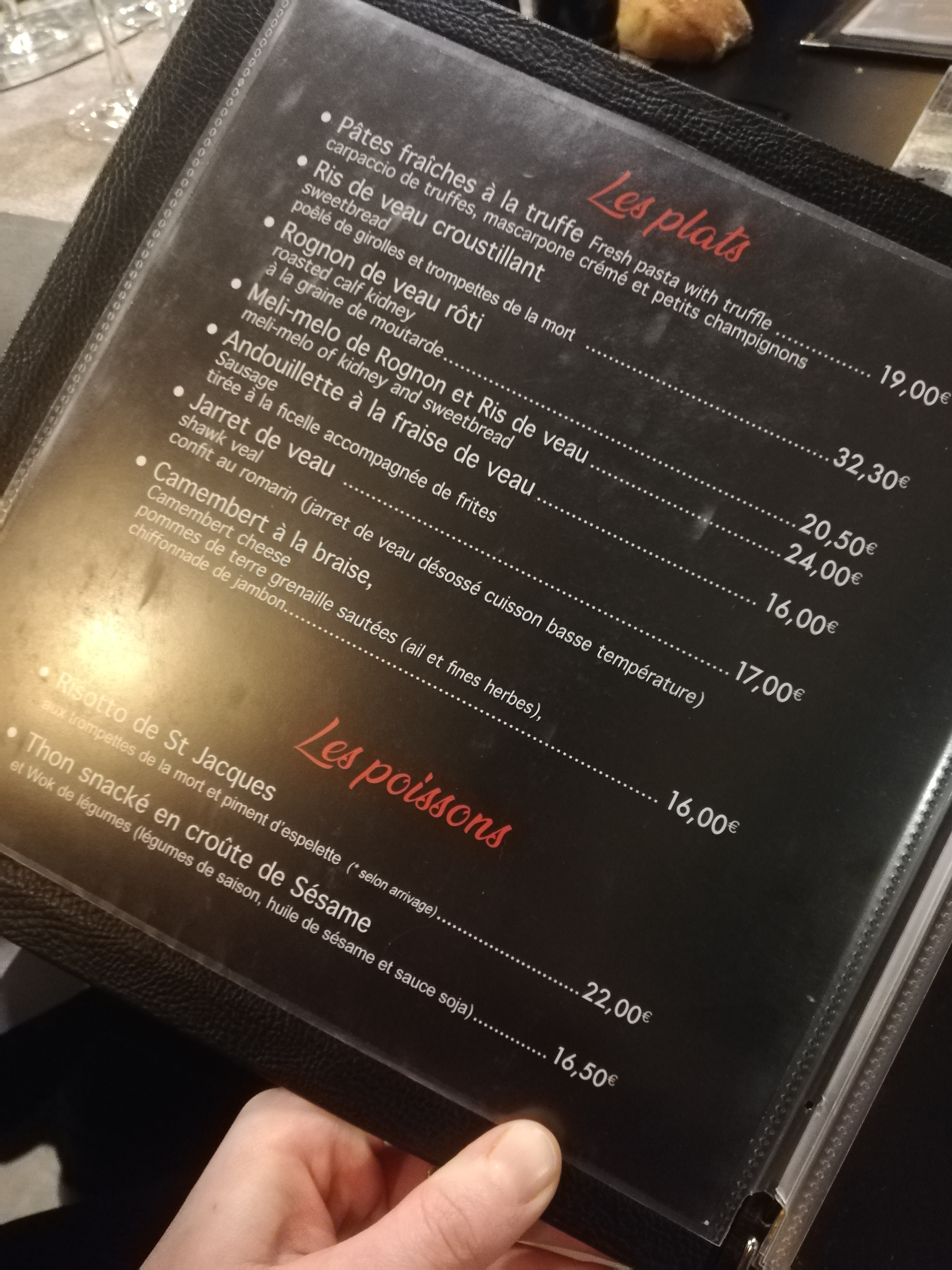 Petit restaurant en amoureux. Bons plats mais un peu déçu de la cuisson des rognons : pas assez cuit a mon goût...(dommage pour le prix). Mais des riz de veau excellent. Mon conjoint a pris des ribs excellent aussi. Dessert très joli visuellement mais les associations de saveurs ne nous aurons pas ravis. Un bon service avec de bonnes attentions, le sourire et de la sympathie. Je dirais que parfois c'est un peu froid (la décoration joue un peu ce rôle) comme ambiance sans petite musique de fond. Très bon restautant avec des plats de qualité surtout pour les amateurs de viandes. Je recommande.