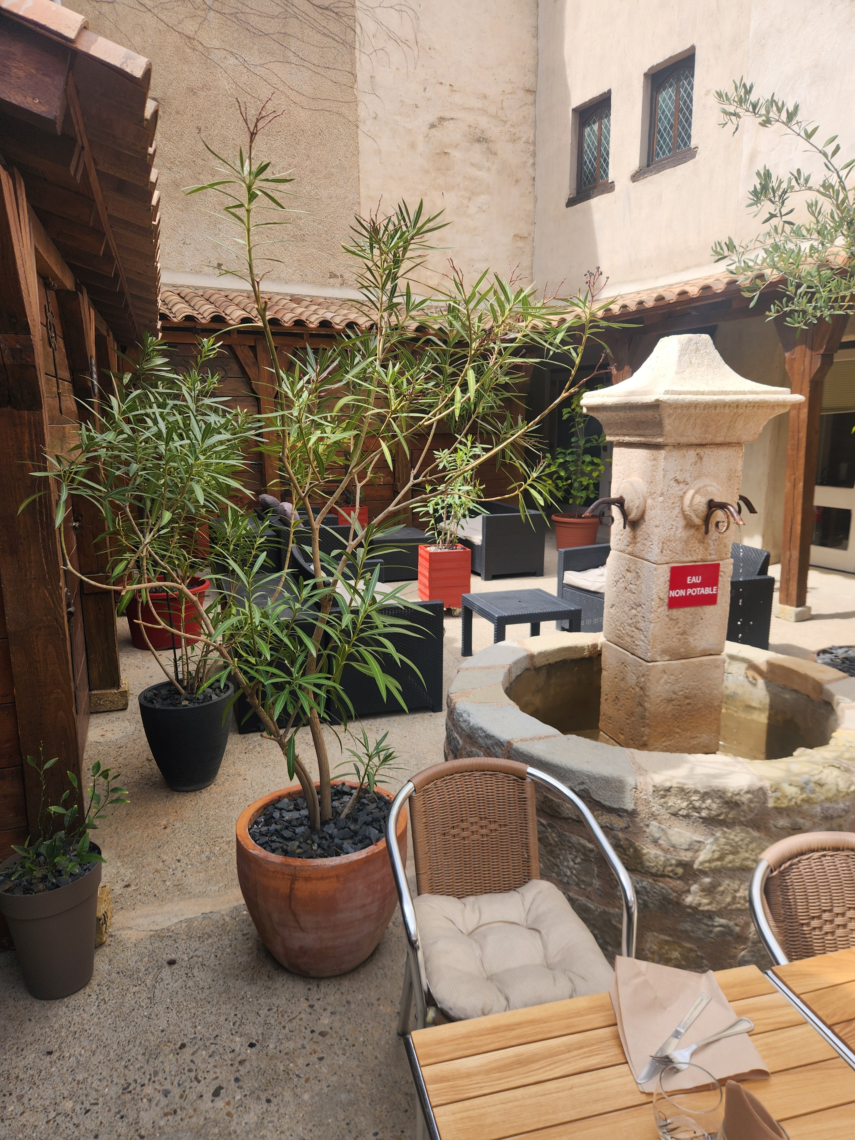 2 ème fois que nous nous rendons ici, cadre idyllique, convivial et la petite fontaine qui apporte fraîcheur pendant les fortes chaleurs, très bon rapport qualité prix, juste à la sortie du musée de la torture, allez y sans hésitation, agréable et serviable, servie avec le sourire. Au top