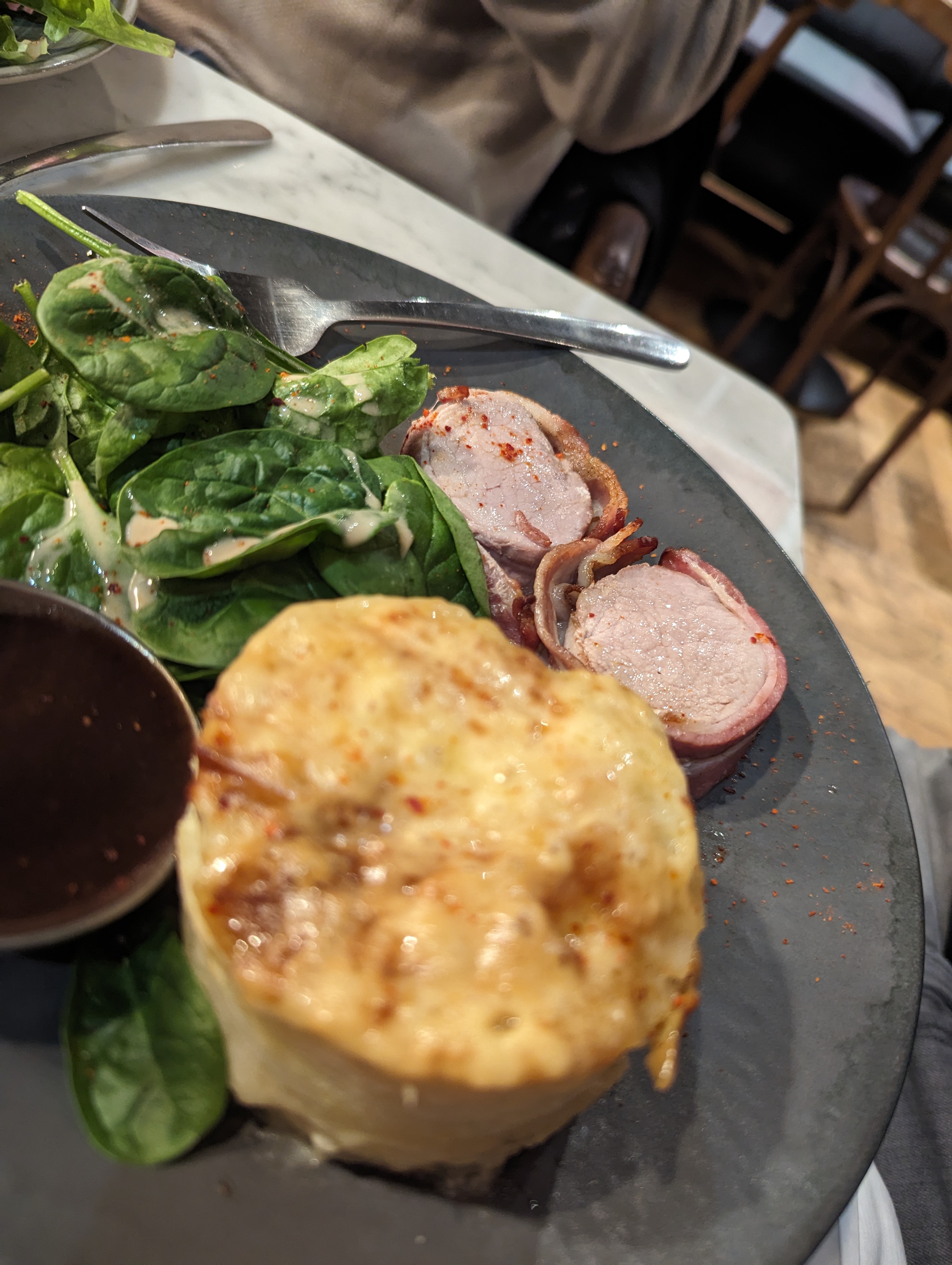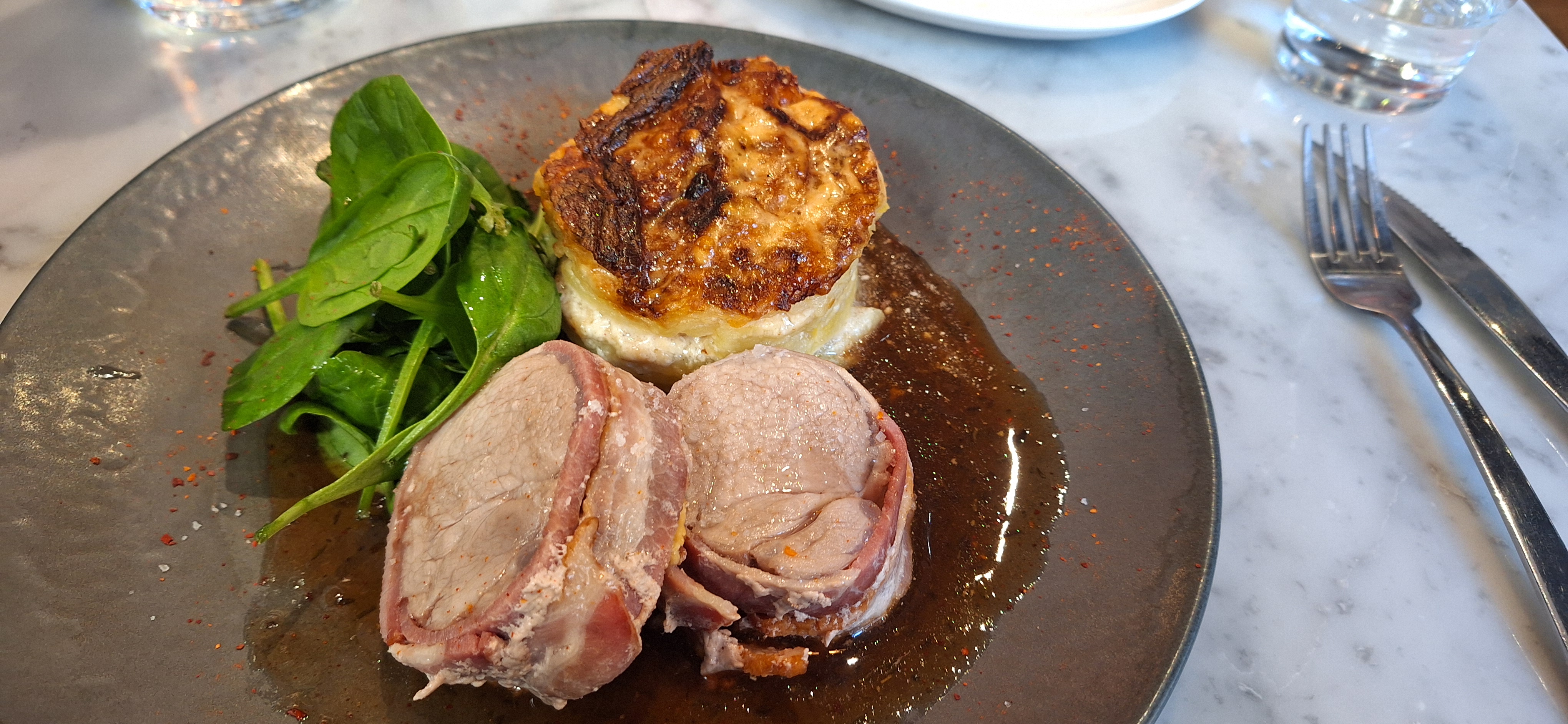 Entrée : parmentier de boudin et pomme Plat : mignon de porc lardé, millefeuille de pommes de terres au comté Dessert : pain perdu des brocs Service rapide et très beau restaurant