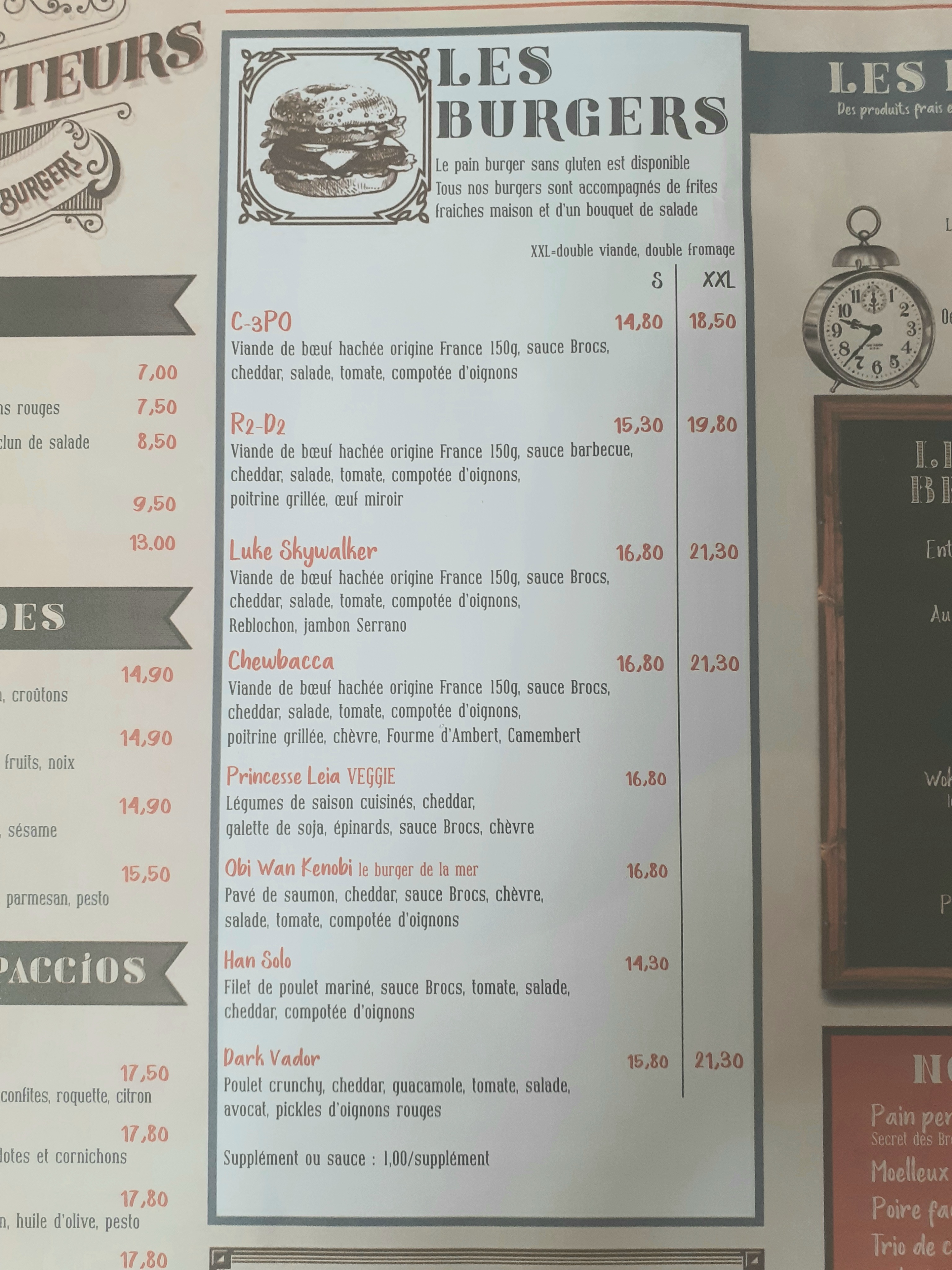 Non seulement les plats sont excellents (grand choix de hamburgers, et le Dark Vador change régulièrement) mais l'accueil est tip top ! Des serveurs aux petits soins, professionnels, qui n'oublient jamais une note d'humour. C'est toujours un plaisir de s'y rendre, je recommande chaudement !