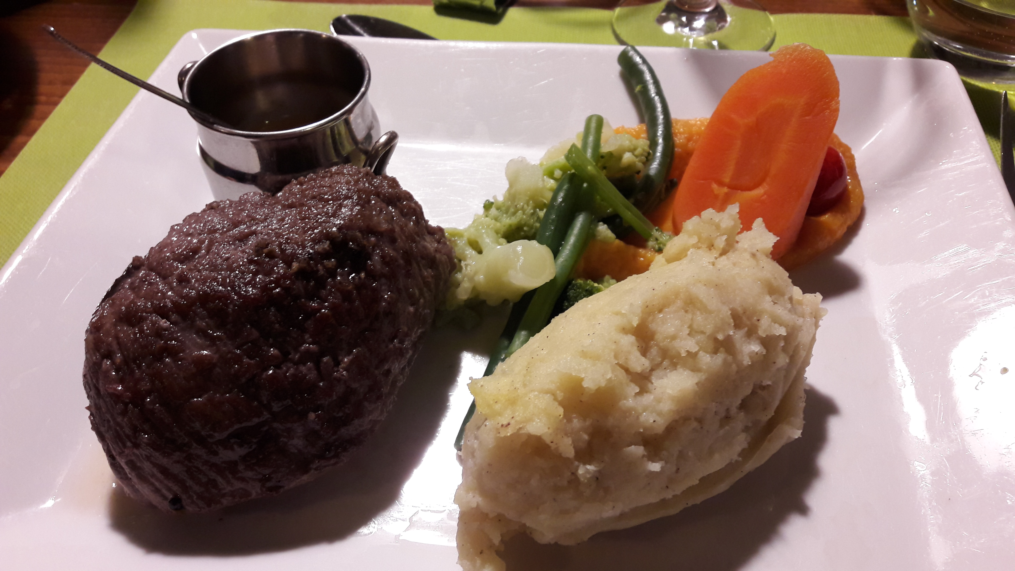 Un accueil chaleureux et une bonne cuisine du terroir Je vous conseille le tomahawk, une côte de boeuf cuite à la broche (pour 2 personnes) ou la pièce de boeuf (une belle entrecôte) flambée devant vous Il y a le foie gras mi-cuit pour les amateurs, perso je n'ai pas aimé, plus cru que mi-cuit et j'ai eu des nerfs Il y a aussi les cuisses de grenouilles, bien que pas assez cuites, elles étaient délicieuses, la sauce est à tomber L'aligo en accompagnement est bon malgré un manque d'ail Mon conseil : allez y pour manger de la très bonne viande 👍