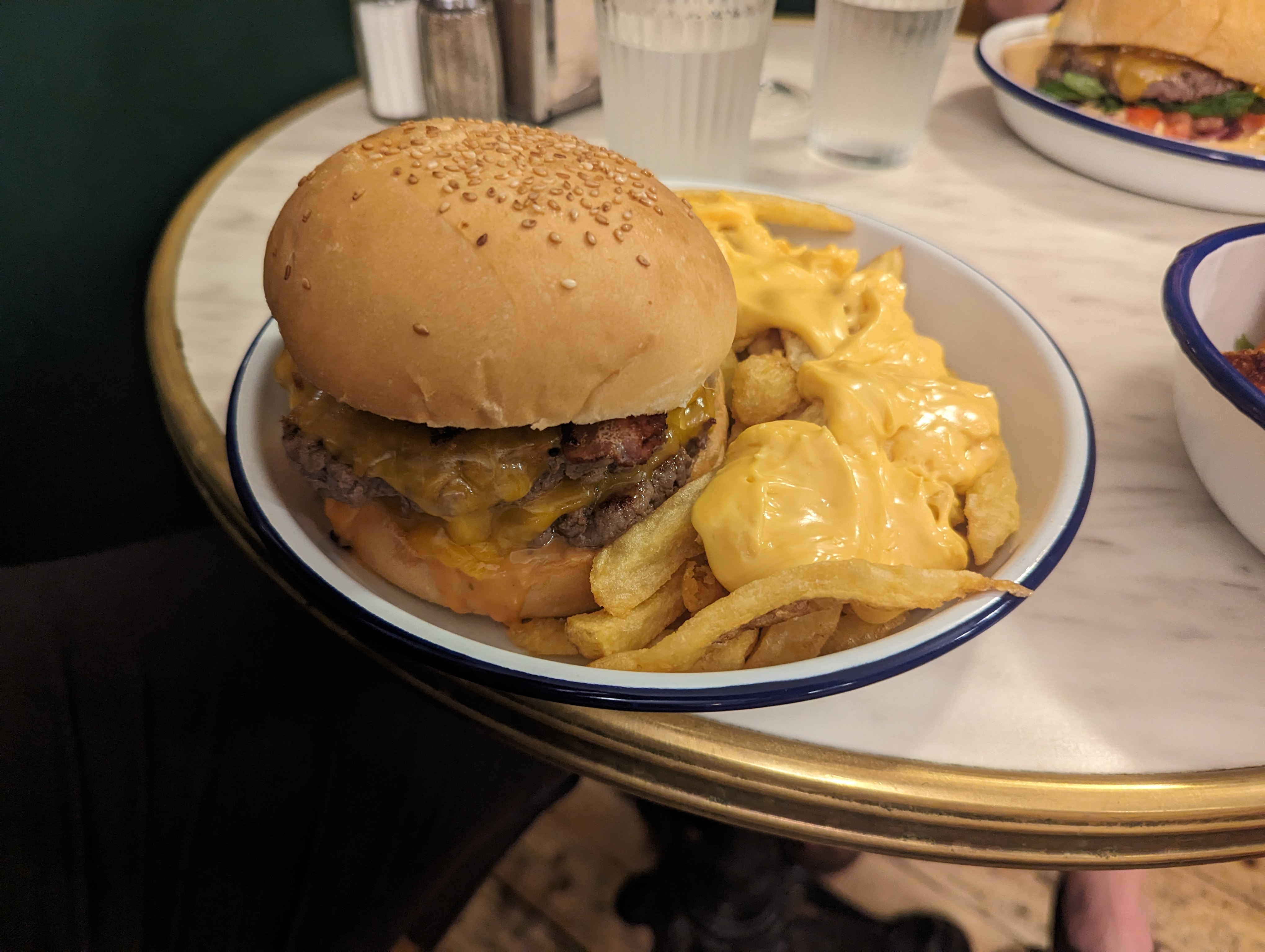 Délicieux hamburgers, frites et accompagnements. Avec un service convivial, un décor chaleureux et une attente très courte entre la commande et l'arrivée des plats à table, c'est une bonne option pour un repas rapide à emporter ou un repas assis. Le hamburger du mois (le Robert) était un délicieux double galette, un hamburger au fromage américain et aux cornichons sucrés, cuit à feu moyen et débordant de saveur. Le pain était moelleux mais tenait bon, n'ajoutant pas au goût mais minimisant les fuites de jus de burger. Les frites chargées, garnies de fromage, étaient fantastiques, mais le «cheddar» étant plutôt un fromage de style américain en termes de couleur et de texture, il est néanmoins savoureux. La portion était copieuse et les frites étaient mordantes et étaient bien assorties à un condiment de cornichon au fromage. Le service ressemblait davantage à celui d'un fast-food avec une touche assise. Commander au comptoir pour ensuite s'asseoir et recevoir votre nourriture semblait plus pratique qu'un repas au restaurant, mais une fois commandé et assis, la normalité a repris. Le service était très sympathique, même à 22 heures, fournissant de l'eau du robinet gratuite sans avoir besoin de demande et parlant également anglais pour s'adapter.