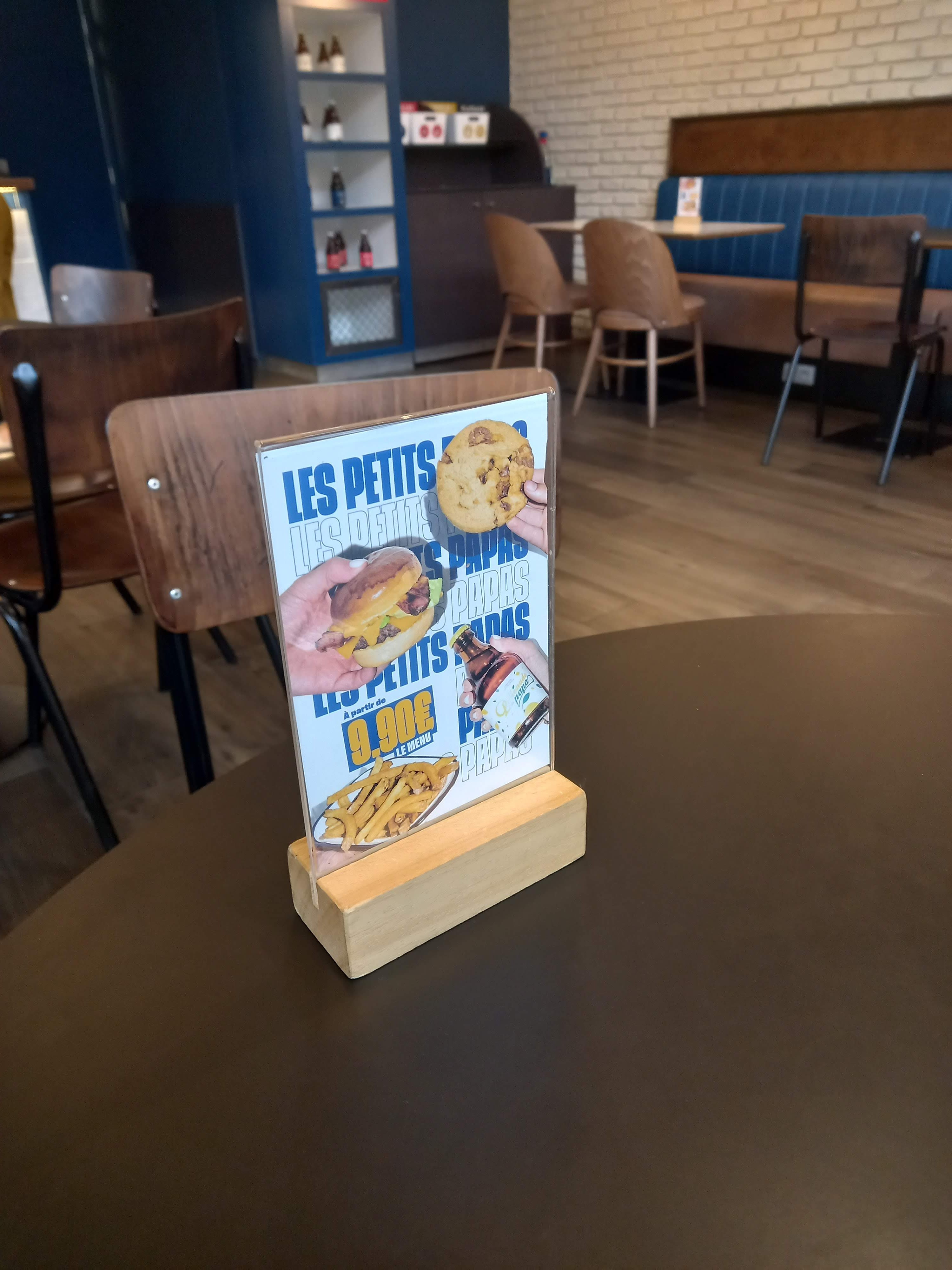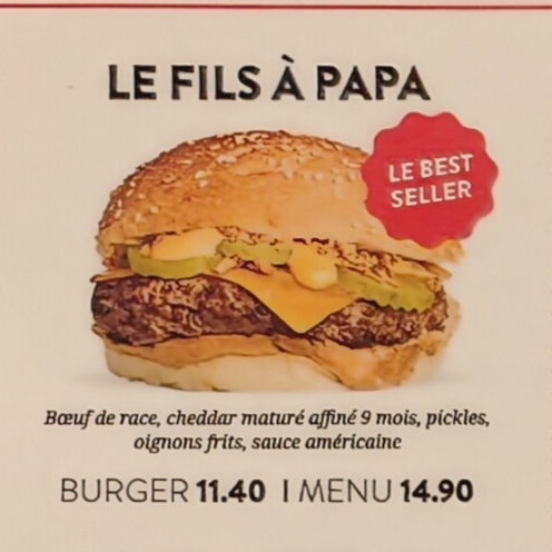 Menu Burger + Frites + Boissons à 13.90. Le burger est sans intérêt, il y a juste un steak haché, deux cornichons et un peu de sauce. Il faudra revoir la composition d’un hamburger. La cheddar fondu sur les frites était immonde. Cela avait le goût de béchamel périmée, il n’avait même pas le goût de fromage… De plus, il faut arrêter avec les noms avec « …. De papa » ça n’a rien d’attrayant. Le burger seul est à 8.90 c’est honteux pour deux morceaux de pain et un steak haché bas de gamme. Allez au Burger King en face c’est moins cher et ces mieux. Heureusement que le personnel est sympa.