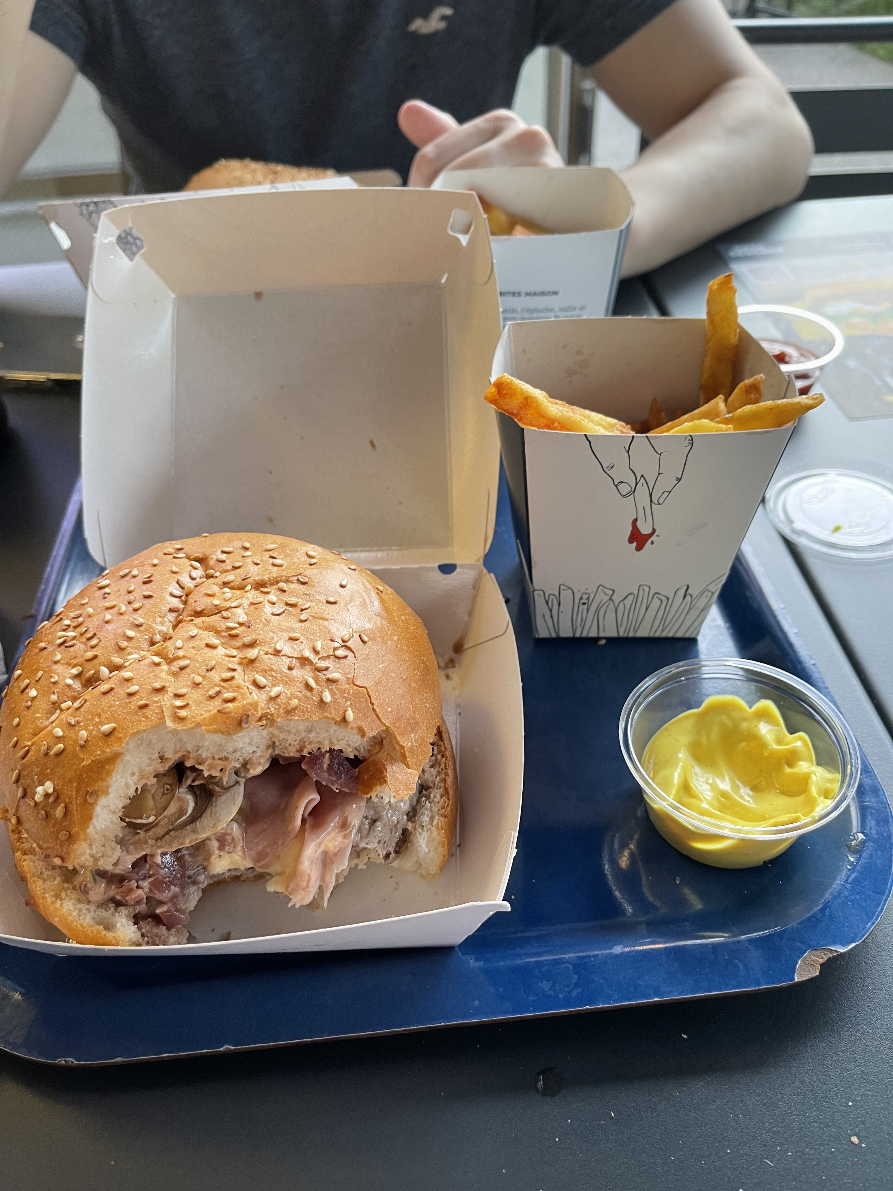 Rapide et simple, la dame de l’accueil avec son accent est vraiment mignonne et gentille ! Dommage que les frites soient vraiment salées, on a pas pu les finir…