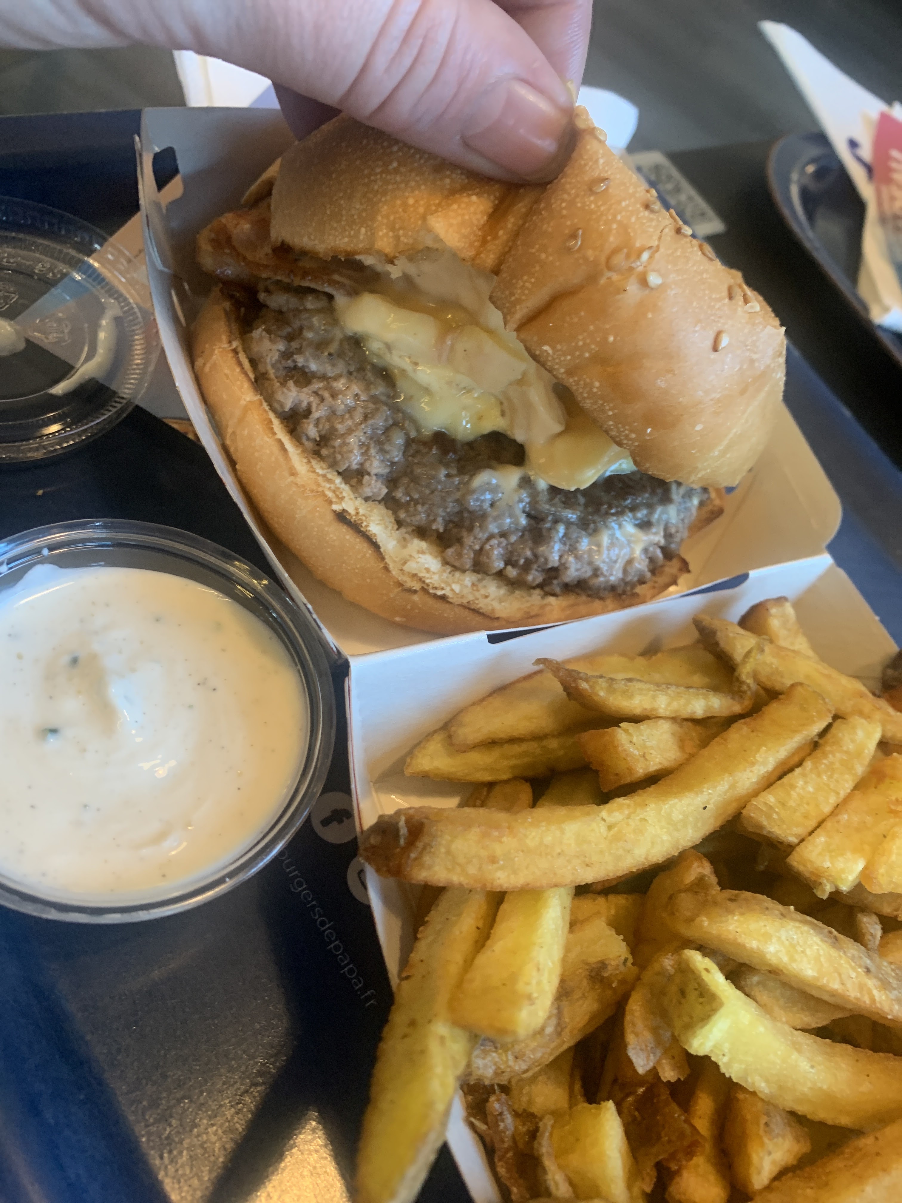 Comme dit le slogan «Les Burgers de Papa, ils déchirent leur maman» Une ambiance agréable, le désigne est super . Et le burger 😍 presque sans mots même si il manquait du cheddar à ma commande je suis très satisfaite . Et le Milkshake miam!! Sans oublié l’amabilité des serveurs