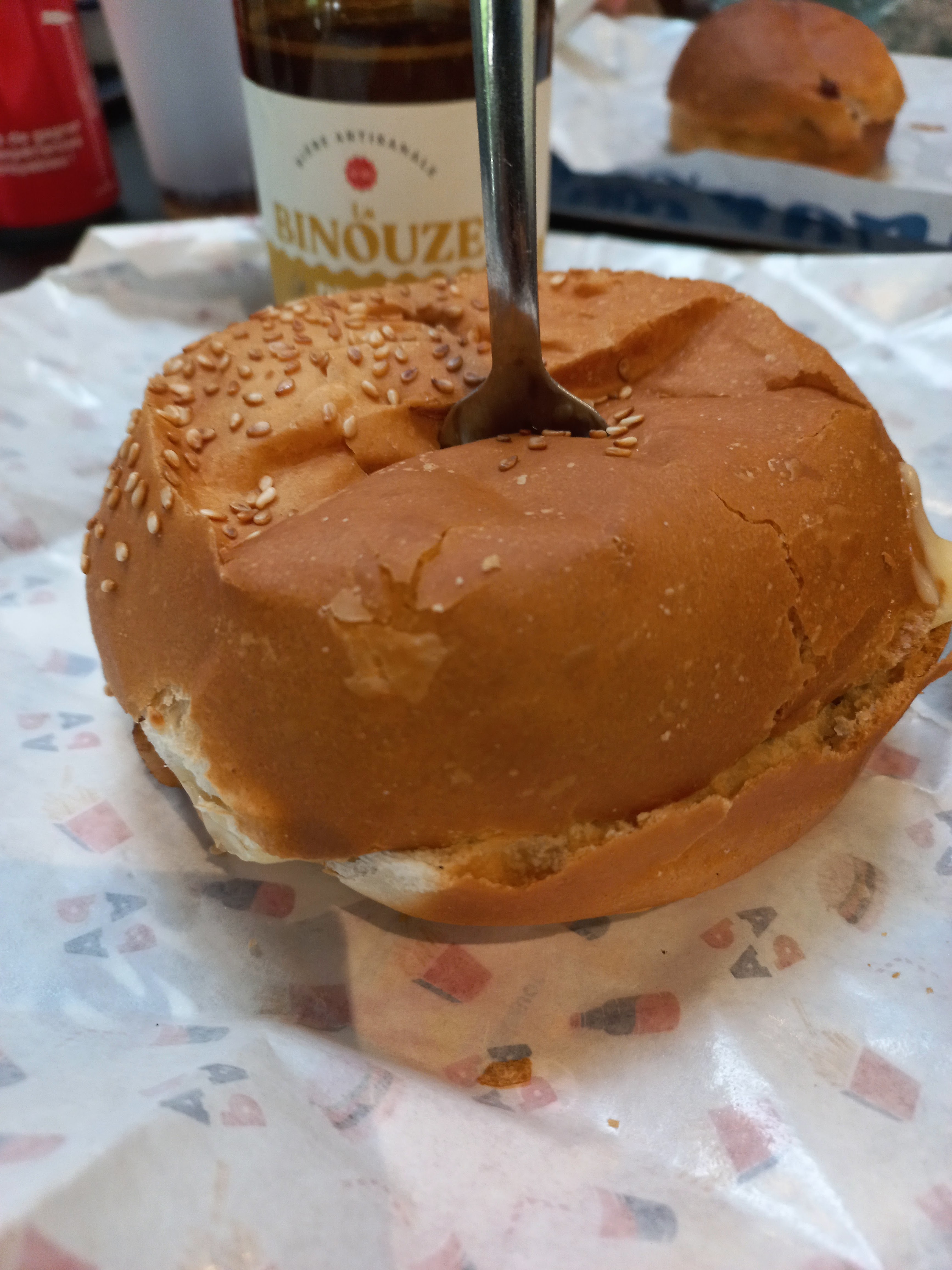 Le burger était relativement bon (bien que rien d'exceptionnel) mais j'ai pris des camemboules, censé venir par 3 et je n'en avais que deux et très petites pour 4,90€. Les frites par contre était juste immangeable ... Je reste donc déçu, surtout du rapport qualité / prix. J'aurais dû prendre une photo mais je n'ai pas par habitude de laisser des remarques.