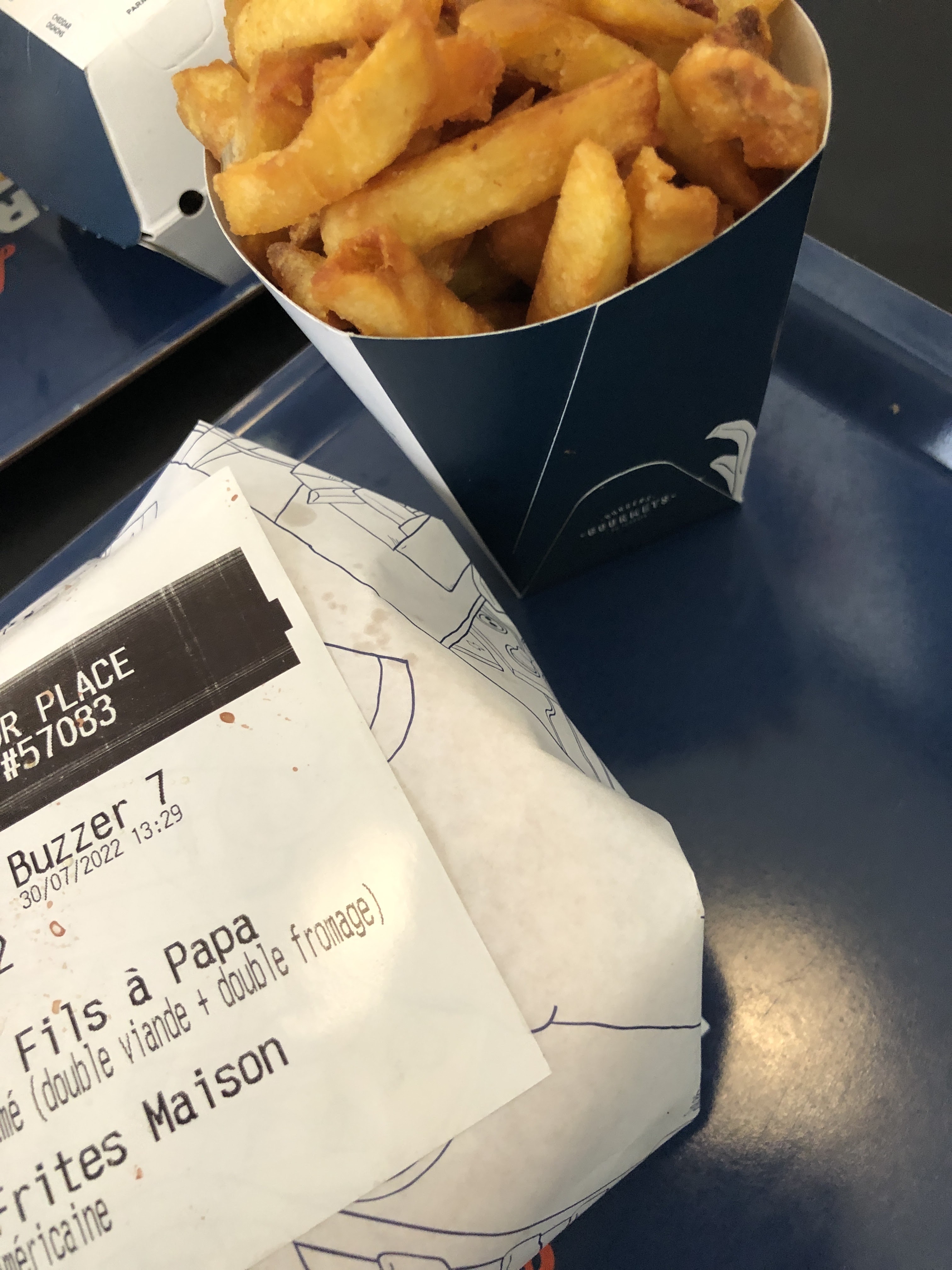 Nous avons tous les deux goûté un menu avec un burger fils à papa, l'un avec un steak, l'autre en version végétarienne. Nous avions vraiment envie de découvrir cette enseigne et nous sommes plutôt mitigés. Les points positifs : -l'accueil, très chaleureux -l'attente, plutôt courte (je dirais 10 minutes, mais nous n'étions pas en heure de pointe du tout) -les boissons emballées séparément des burgers et des frites (c'est un détail mais ça évite que tout soit froid une fois arrivés à la maison) -le restaurant a l'air très propre, même si nous n'avons pas mangé sur place Le point négatif : -le rapport quantité-prix-goût : 25 euros pour 2 menus (burger + frites + boisson), ça pourrait aller, mais les portions de frites sont assez petites. Et pour chaque frite, seulement une portion de sauce. Les burgers ont de la garniture uniquement au milieu, donc sur les côtés il n'y a que du pain à manger. Niveau goût, ce n'était pas mauvais, mais je ne me suis pas régalée non plus. Idem pour mon compagnon. Après, ce n'est qu'une question de goût. Il n'y a qu'un seul point négatif mais quand on va dans un restaurant on s'attend à être rassasié et à se régaler, et malheureusement ça n'a pas été le cas.