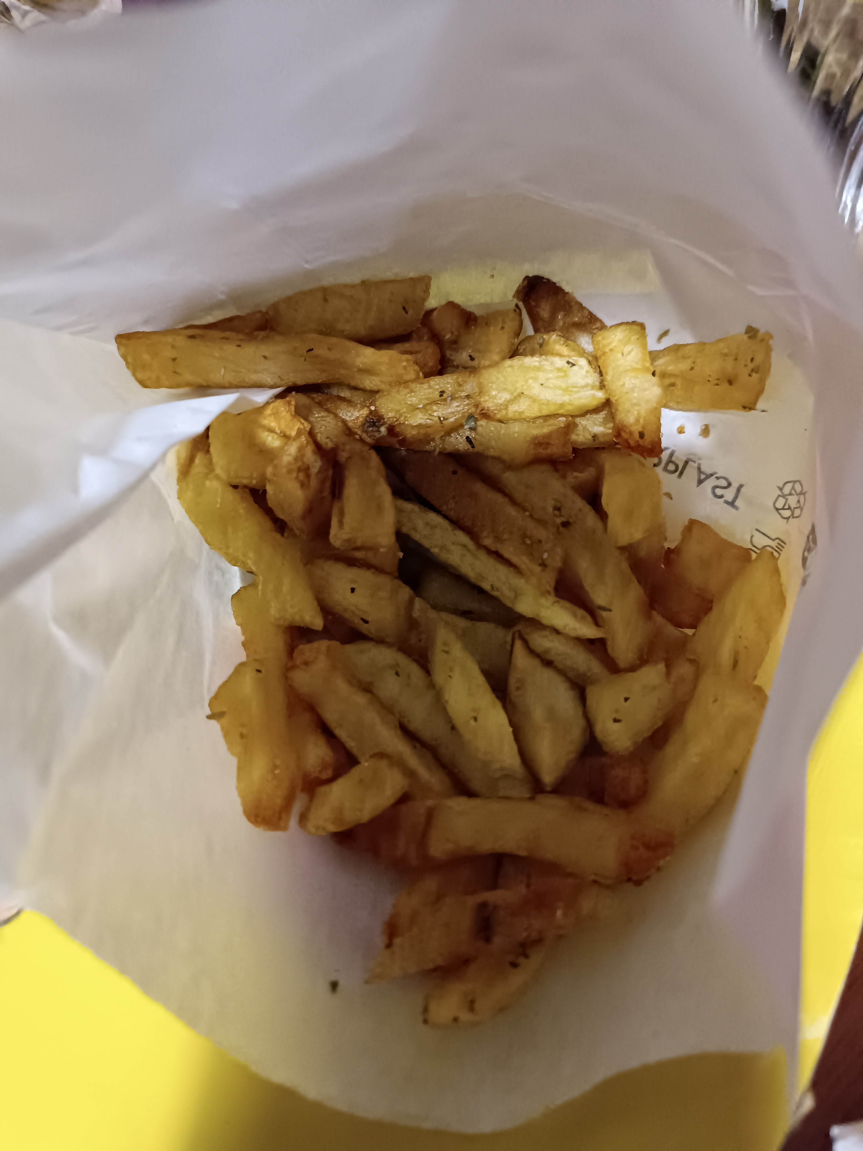 J'ai pris un burger et des frites à emporter. Le burger était vraiment très bon, ingrédients de qualité, goûtu, recette très au point. Pour les frites : elles méritent d'être mieux saisies, et salées aussi 😅. Le sac en kraft mériterait également d'être un peu plus solide : il a commencé à se déchirer avant son arrivée (moins de 10 mn à pied)