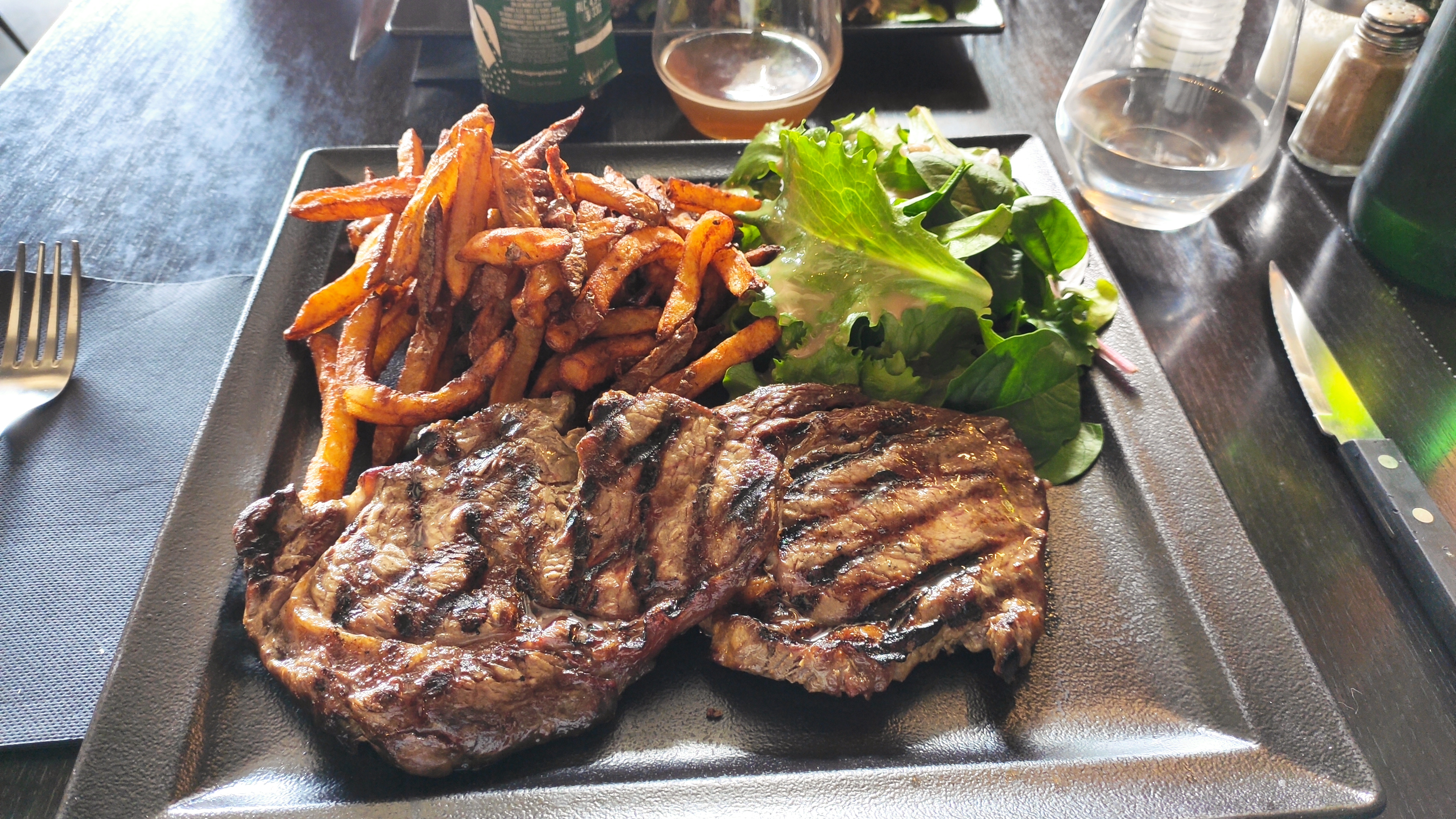 Excellente adresse, les frites maisons sont à la hauteur, la viande est très bonne et la cuisson parfaitement respectée (onglet 300g sur la photo), la sauce maison qui accompagne est excellente et les desserts proposés vraiment bon. Service de qualité pour un endroit convivial et pas trop bruyant quand complet. Je recommande, surtout pour les adeptes de viande !