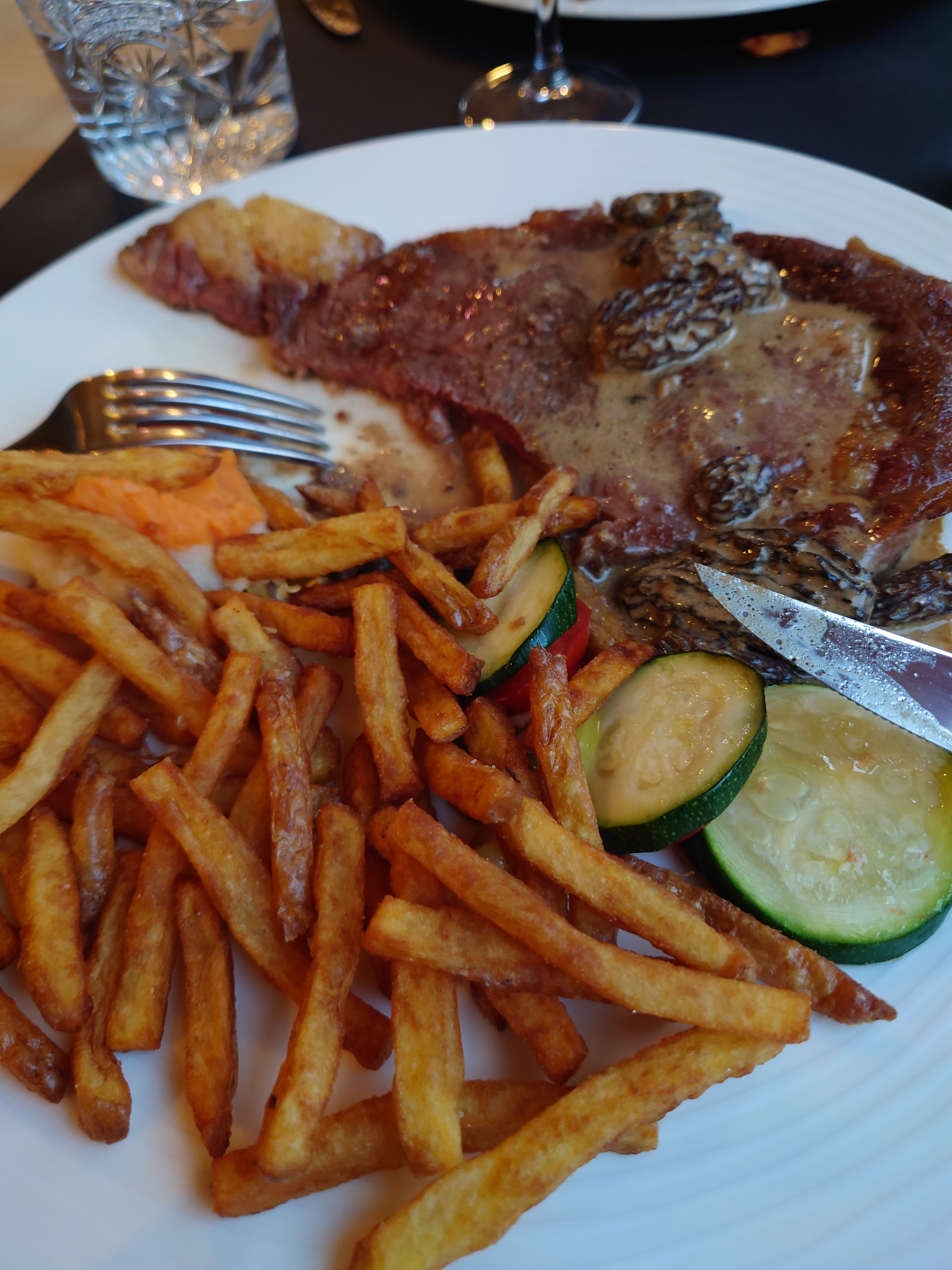 Entrée : Croûte aux morilles Et foie gras Plat: Pièce de bœuf à la plancha Filet de perche Dessert: Fondant au chocolat Simple, efficace, frites maison, pas de fausse note, service parfait et le + beaucoup de patience pour nos enfants infernales qui ont harcelés sparrow