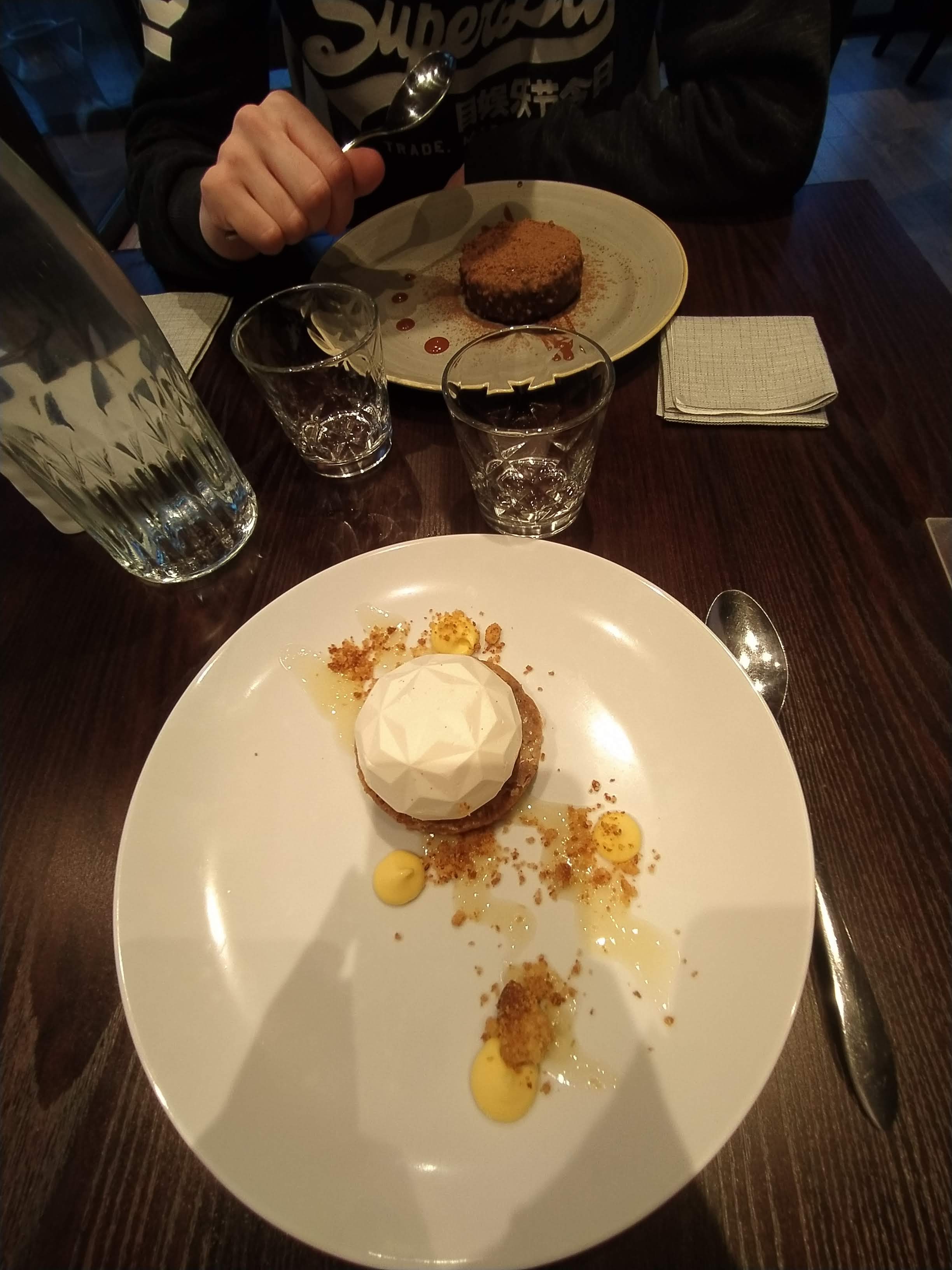 Découverte non prévue, j'avais pris en plat des Saint-Jacques avec son risotto truffé vraiment très beau et bon Le désert vanille chocolat blanc sur un support croustillant mais ce dernier était trop sucré pour moi L'accueil, le service au top