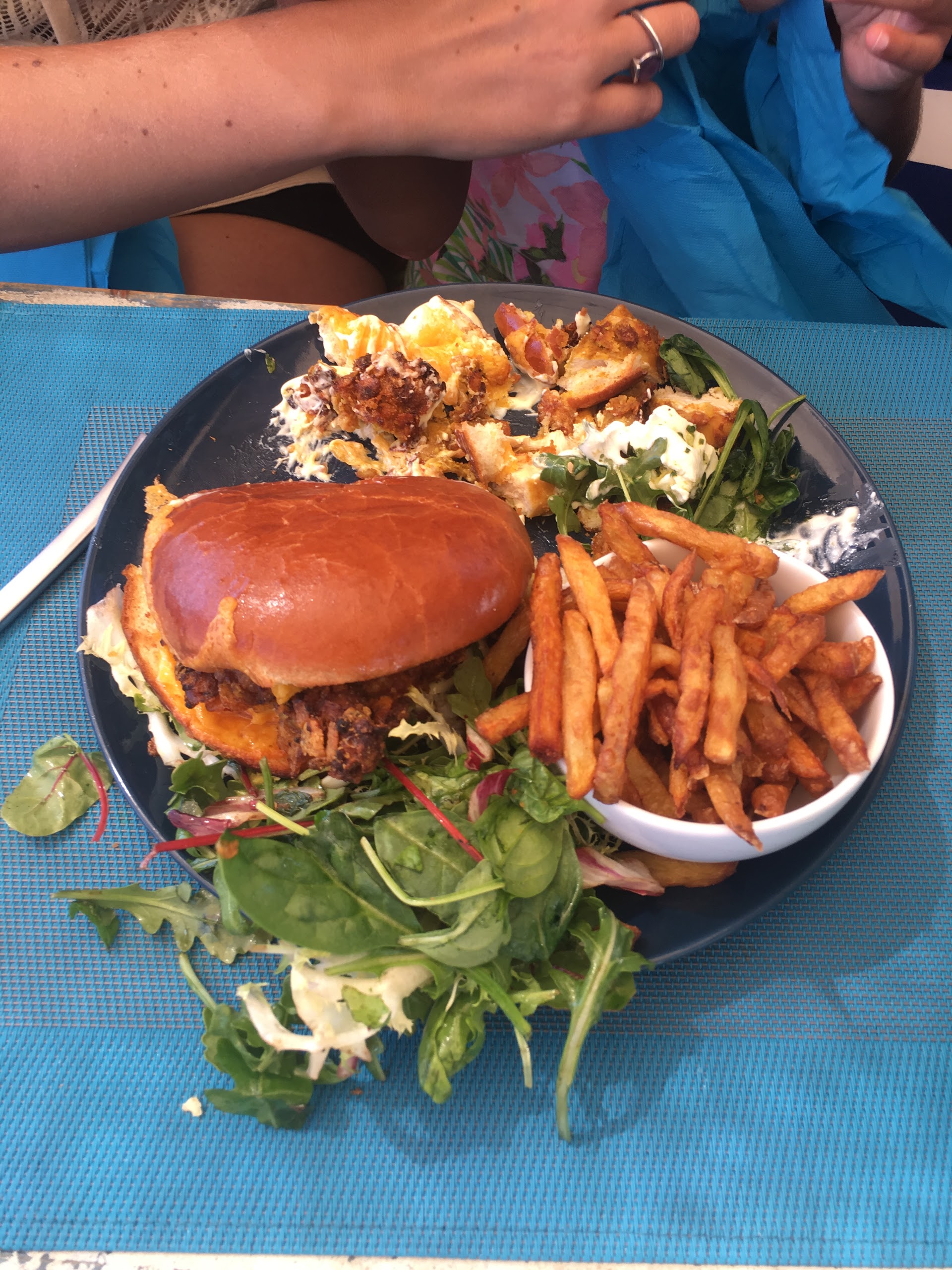 Service, ambiance et nourriture fantastiques. Le personnel était très sympathique à chaque fois que nous y sommes allés et a fait tout son possible pour répondre à nos besoins (une chaise haute pour le bébé, lui apportant un peu de pain à la fin de notre repas une fois réveillé, etc.). Rafraîchissant de trouver un restaurant proposant quelque chose de différent du menu standard du déjeuner : il comprenait aujourd'hui un « Buddha bowl », avec du dhal, des crudites et du riz. La vue est également à tomber par terre !