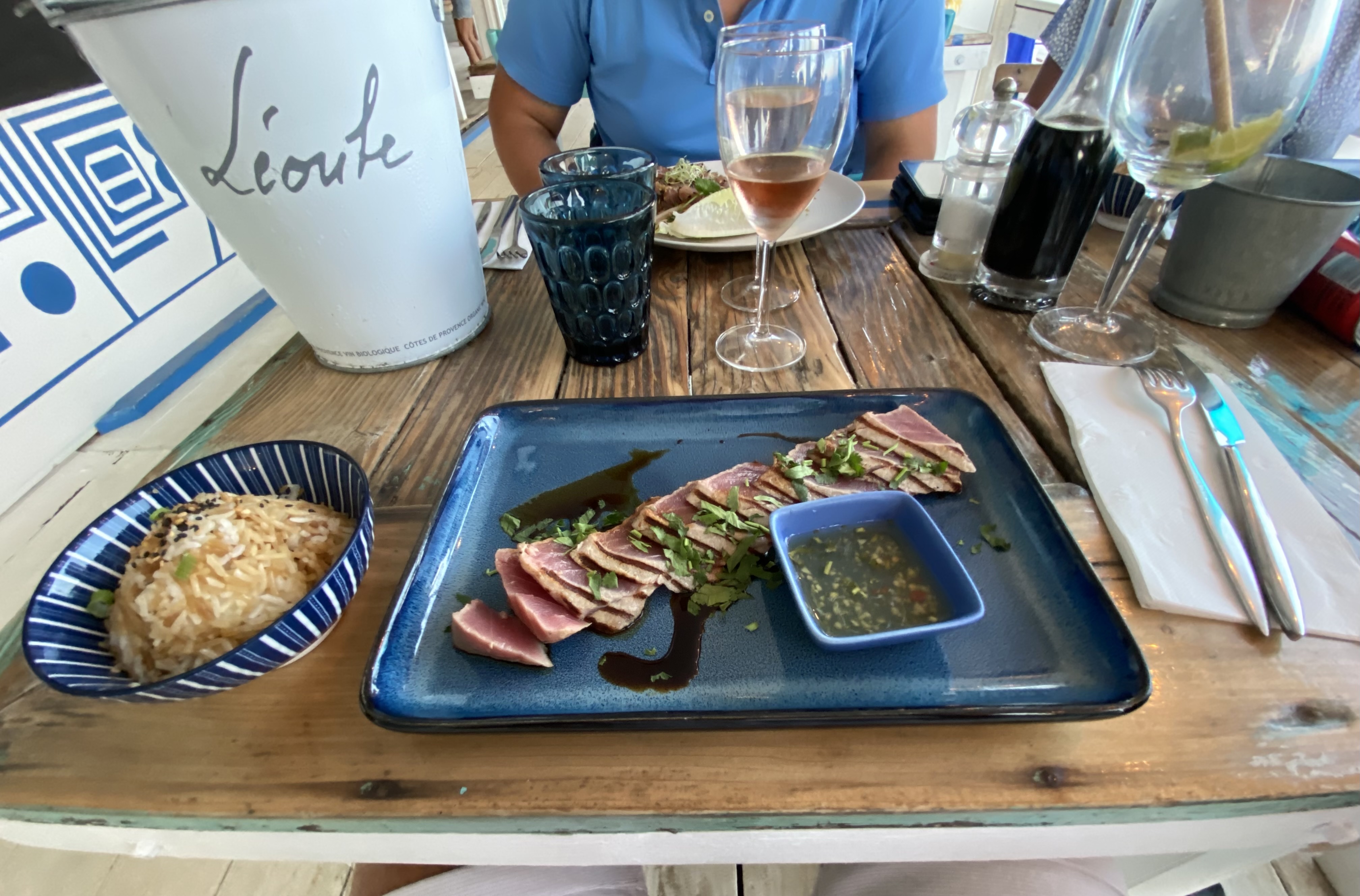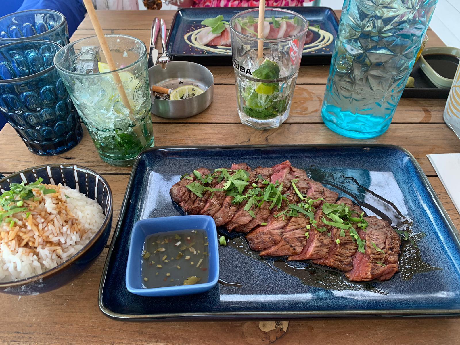 Le cadre (face à la mer) est très agréable pour déjeuner. Les serveurs sont très professionnels et souriants même si certains ne respectent pas totalement les consignes de sécurités du port du masque. Nous avions pris comme plat les larmes du tigre un peu trop d'herbes à notre goût et le riz un peu sec avec comme une impression de réchauffé. Néanmoins, il a l'air d'avoir de bons plats côté mer et de bonnes saladesbien copieuses. L'attente pour recevoir les plats était un peu long sachant qu'il n'y avait pas énormément de monde.