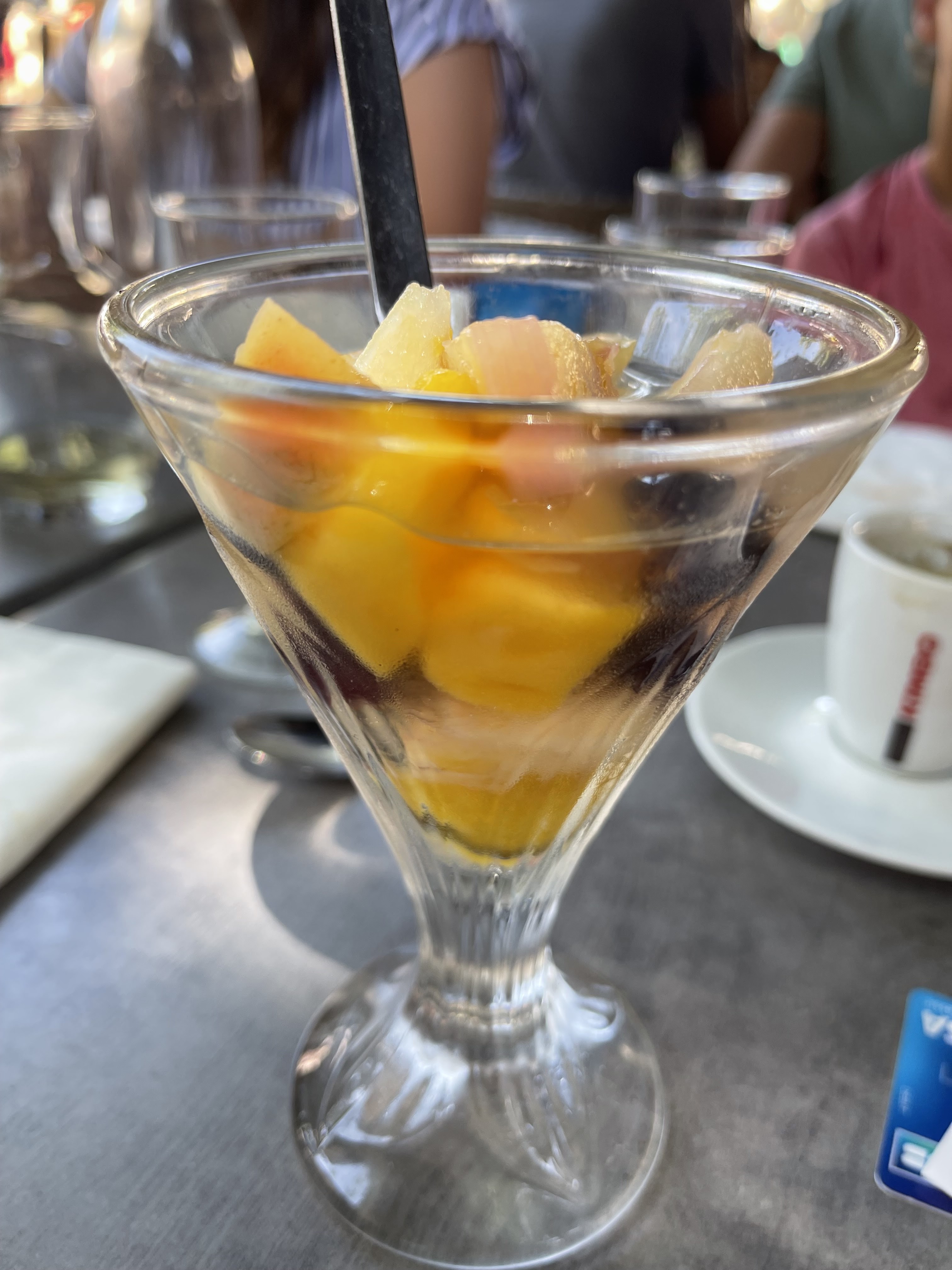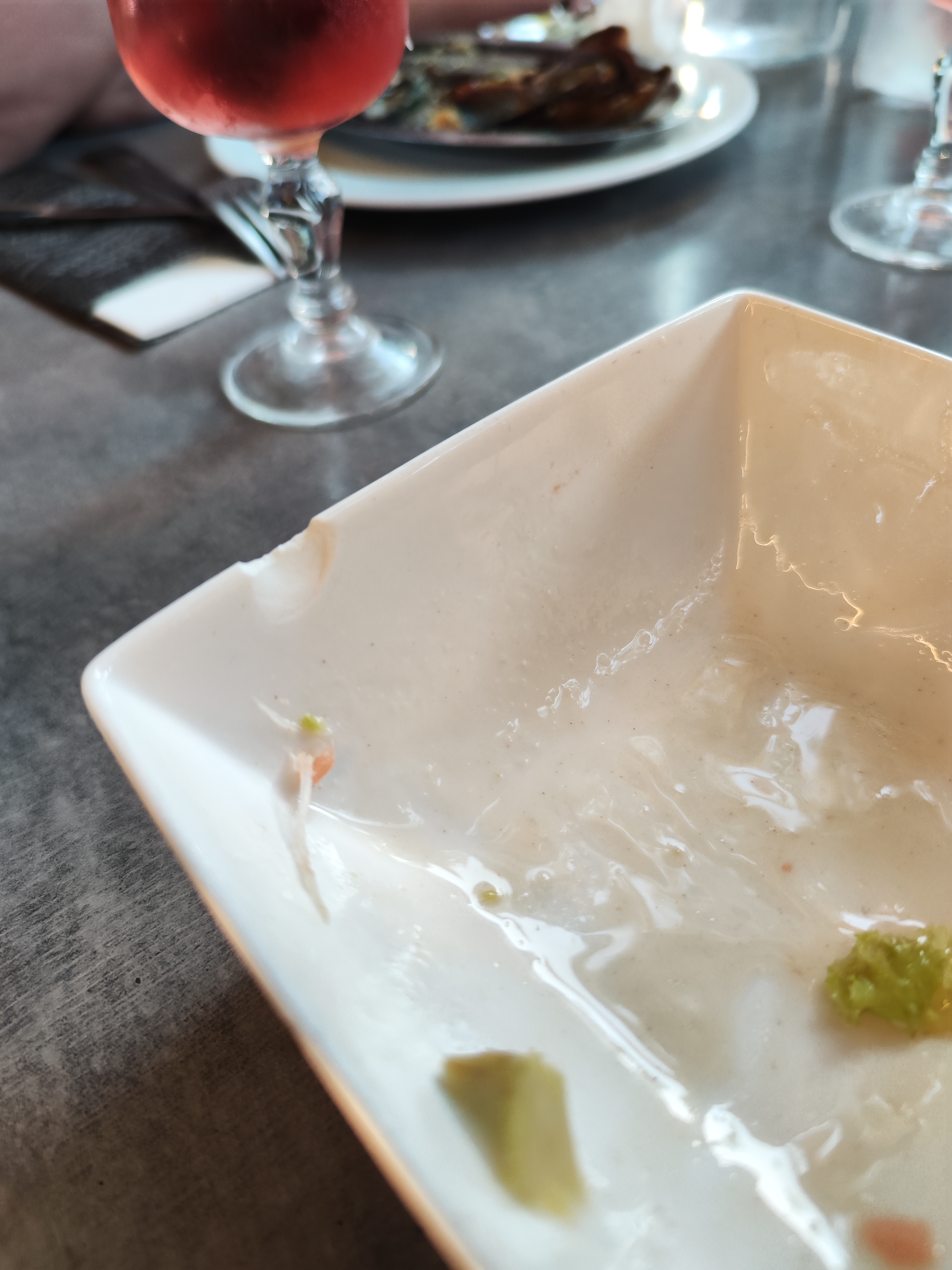 J’ai commandé un pastis en apéro, et j’ai eu directement le plat dans la foulée. Les frites de l’accompagnement de la brochette de crevettes était froide. De plus, la Panna Cotta, aux fruits rouges, il y avait du sirop à la place d’un coulis… Franchement pas cool ! Pourtant, il était 13h45, fin de service…