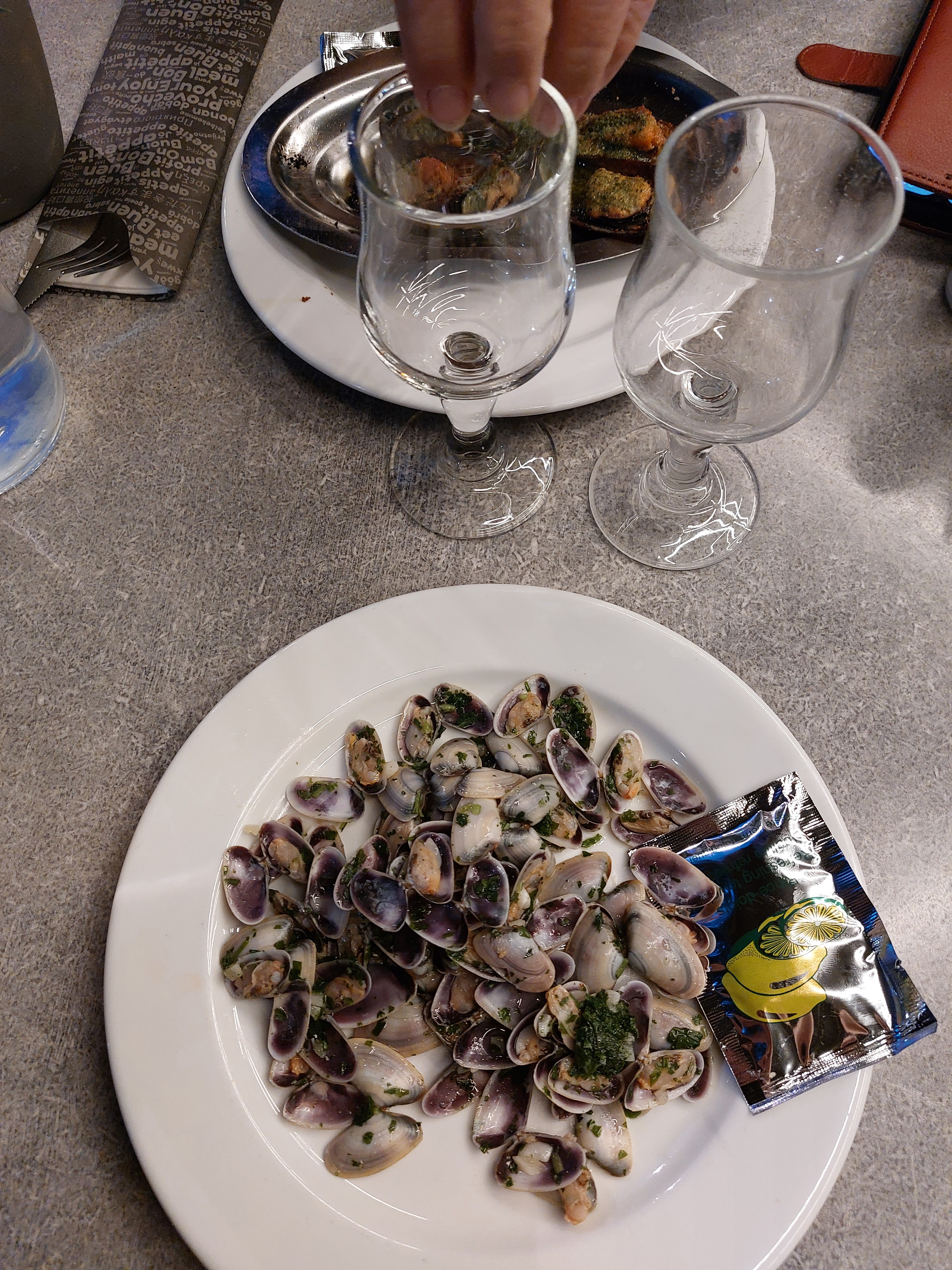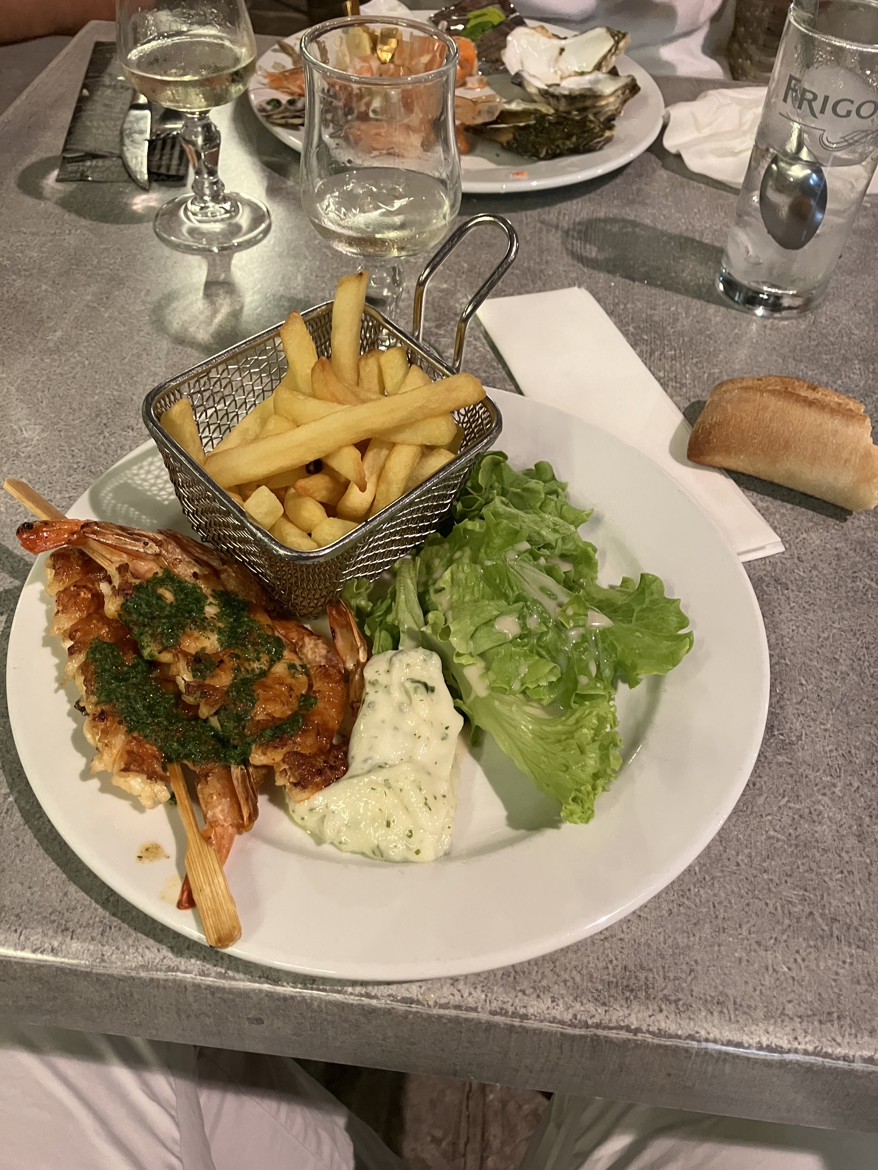 J'ai pris des tellines, une gardianne de taureau et une crème. Les tellines froides servies en persillade étaient cuites de je ne sais pas quand donc élastiques (pas terrible) er qui baignait dans l'huile. La gardianne très bonne viande fondante (RAS). Le dessert absolument pas à mon goût car goût d'agrumes (J'avais précisé à la serveuse que je n'aimais pas le citron) cette crème était faite avec des agrumes, dommage pour le manque de conseil de ma serveuse (à moins qu'elle ne mange pas ce qui est servi). Je ne parle même pas de la tête et reflexion de la serveuse quand j'ai voulu payé avec un billet de 50 €.... restaurant sans plus, pas mauvais mais pas exceptionnel non plus