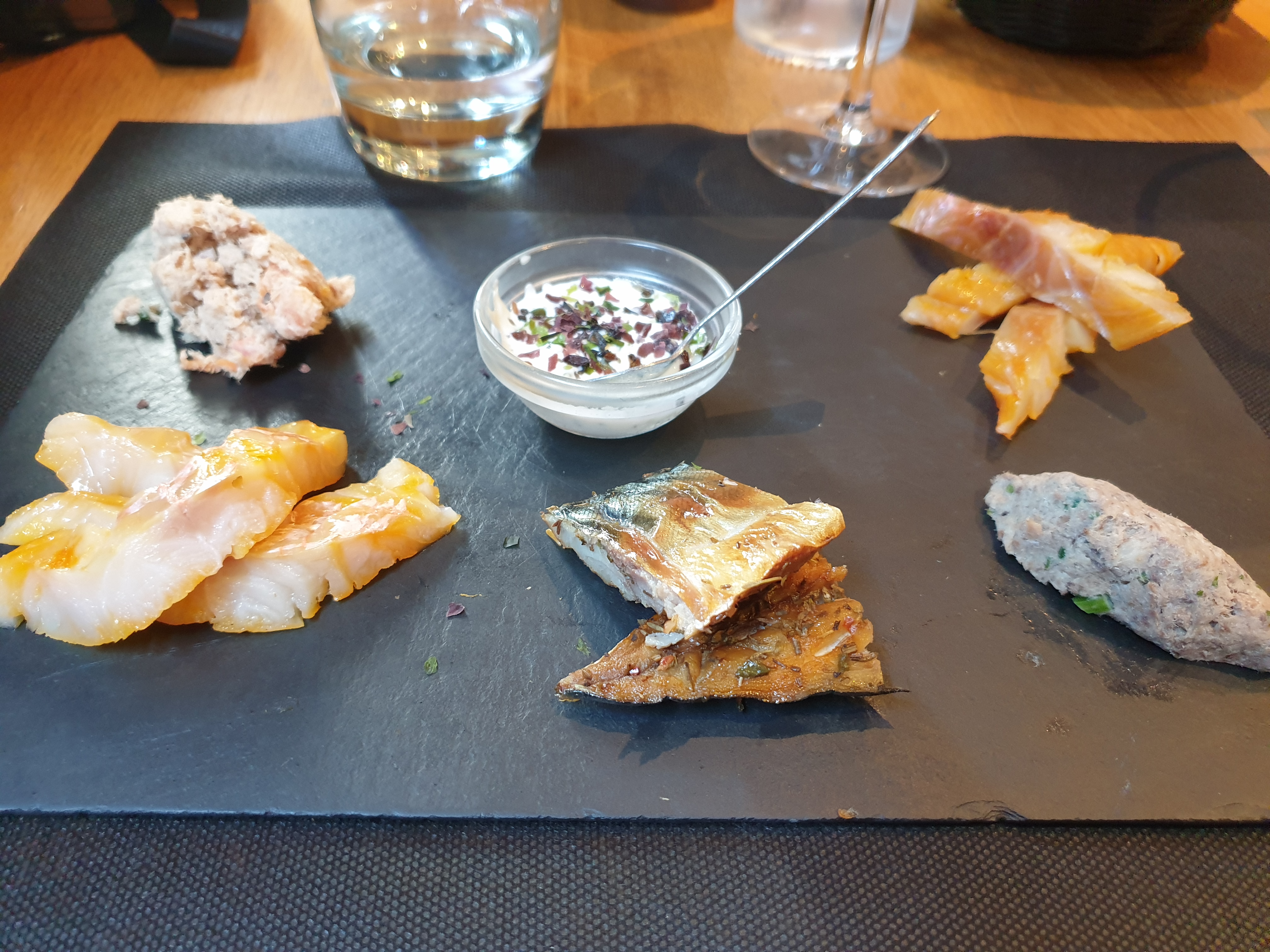Le plat de Tataki de thon était bon. Nous aurions apprécié un dessert autre qu'un café gourmand pour terminer ce dîner. Hélas, il n'y avait rien d'autre à la carte ce mercredi 26 juillet en début de service. La gentille serveuse nous a dit que c'était à cause des fêtes de Cornouaille (qui se sont finies le dimanche 23)... 😅
