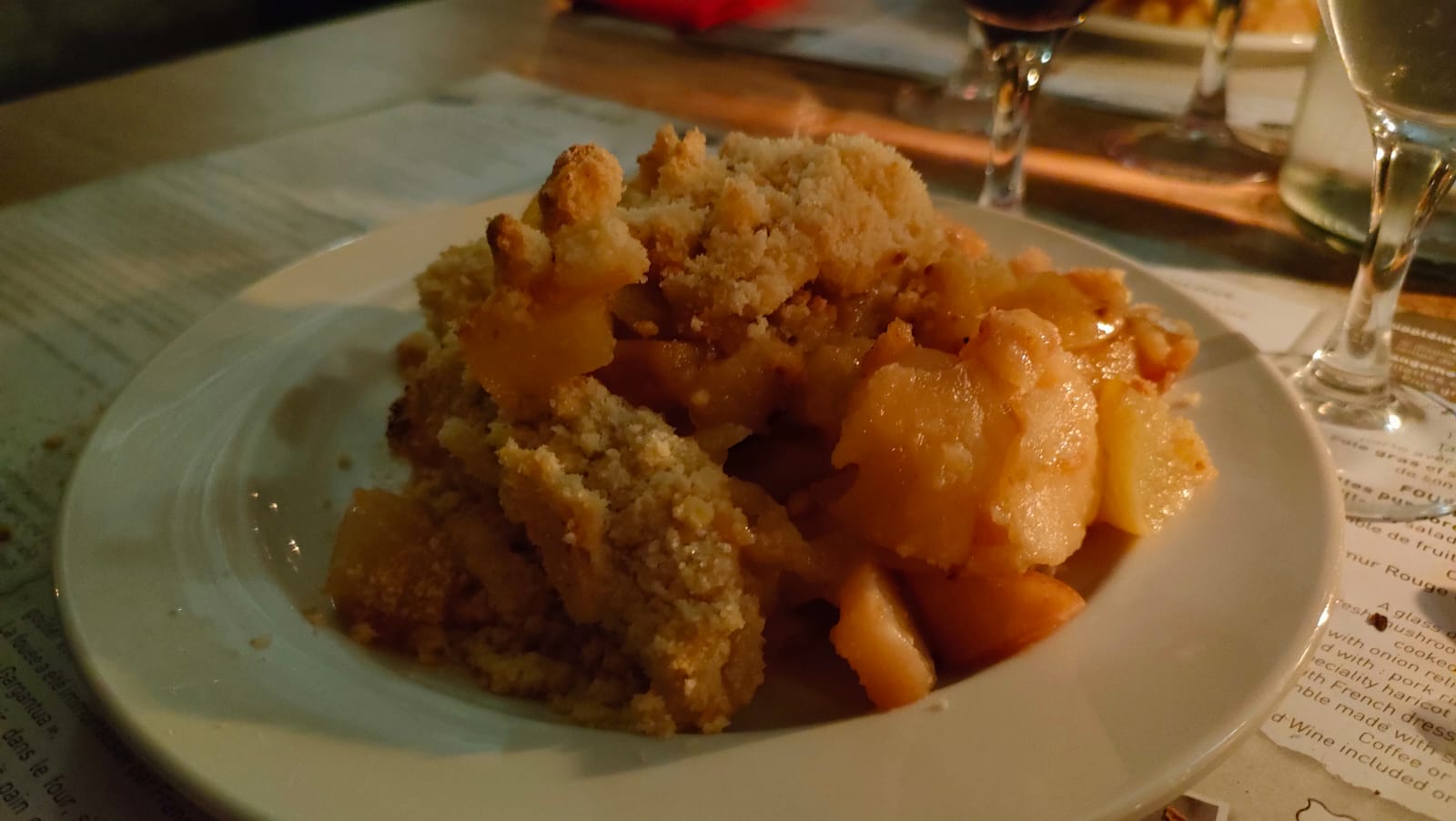 Découverte, en visite dans la famille Tout est super, accueil, ambiance. Les Foués excellentes, cuisine conviviale dans un cadre exceptionnel. Seul bémol… le dessert 😭 qui manque de cuisson, autant les fruits que le Crumble, très bien pommes /pêches pourtant. Dommage de finir sur un dessert moyen. Une tarte fine au pommes ? Une glace? La pause café dans la cour est très agréable. Agréable soirée en famille, merci.