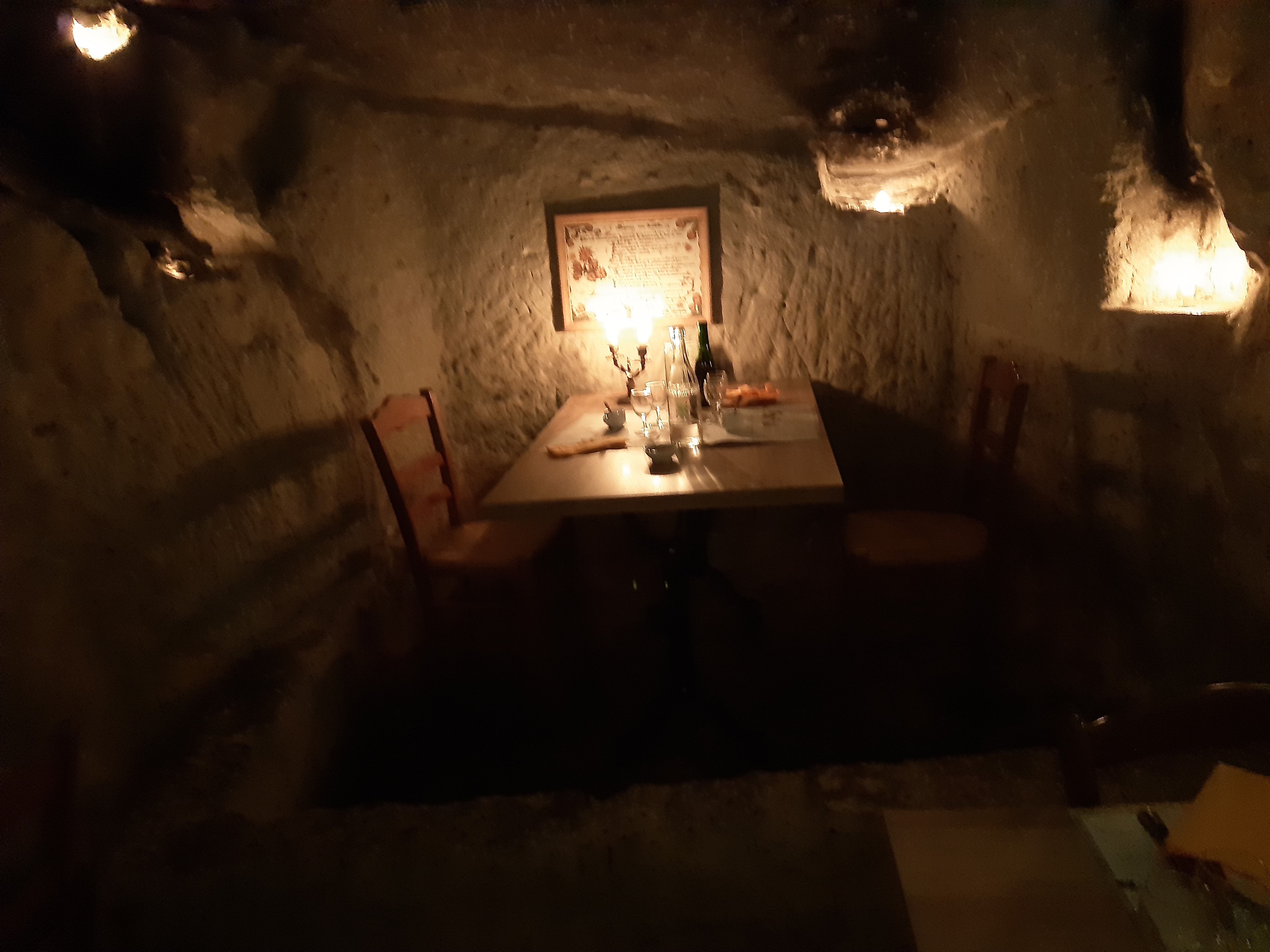 Lieu atypique magnifique. Le personnel est accueillant et restaurant éclairé à la bougie. Pas de réseau à l'intérieur ce qui est parfait pour se couper du monde en mangeant. Il y fait très chaud malgré qu'on soit dans une cave. Pensez à réserver car c'est souvent complet. Prix correct pour du fait maison